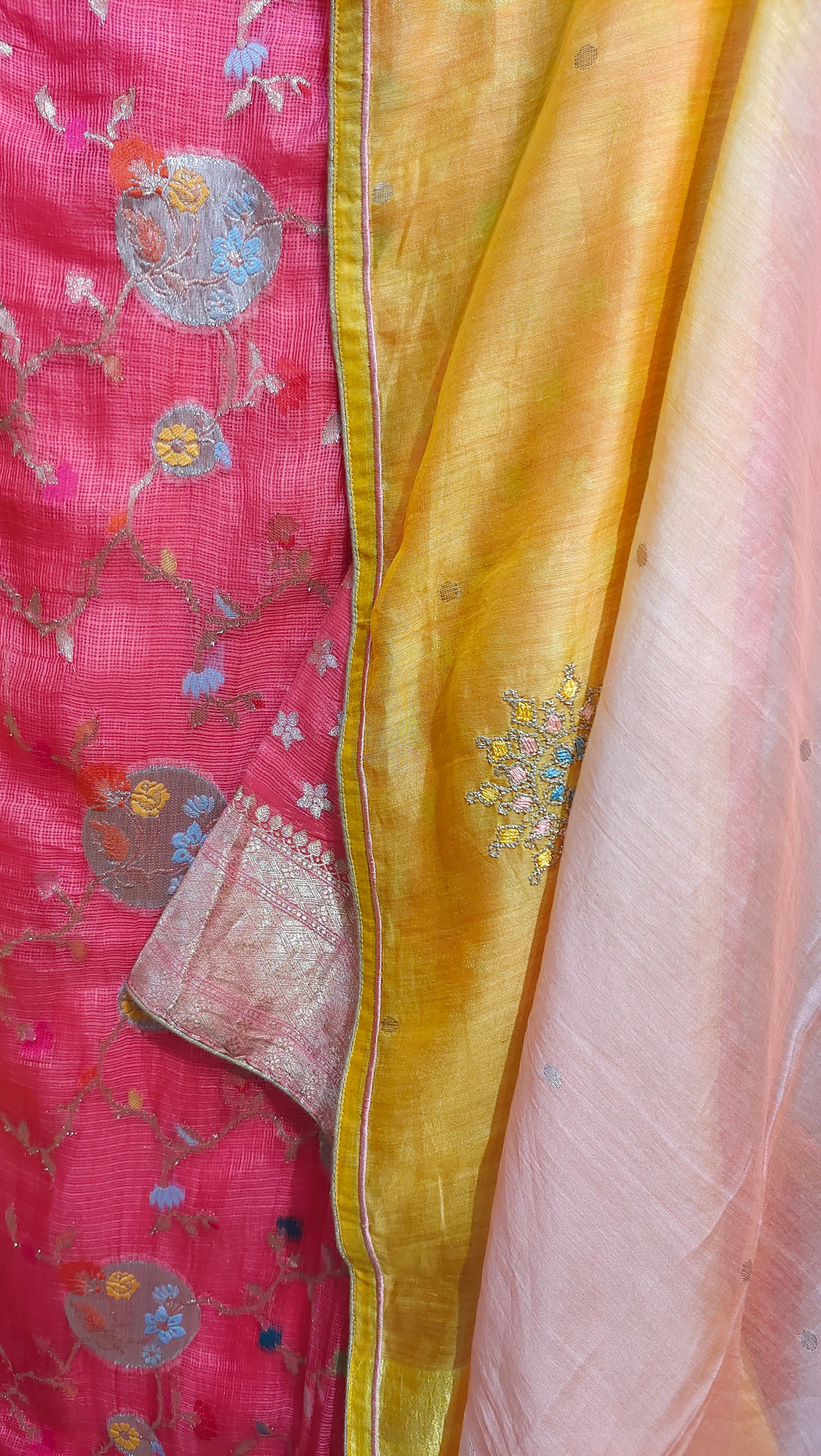 The dupatta measures 2.5 meters in length and 38 inches in width.The ensemble is provided with a matching cotton satin bottom material for 2.5 mts.