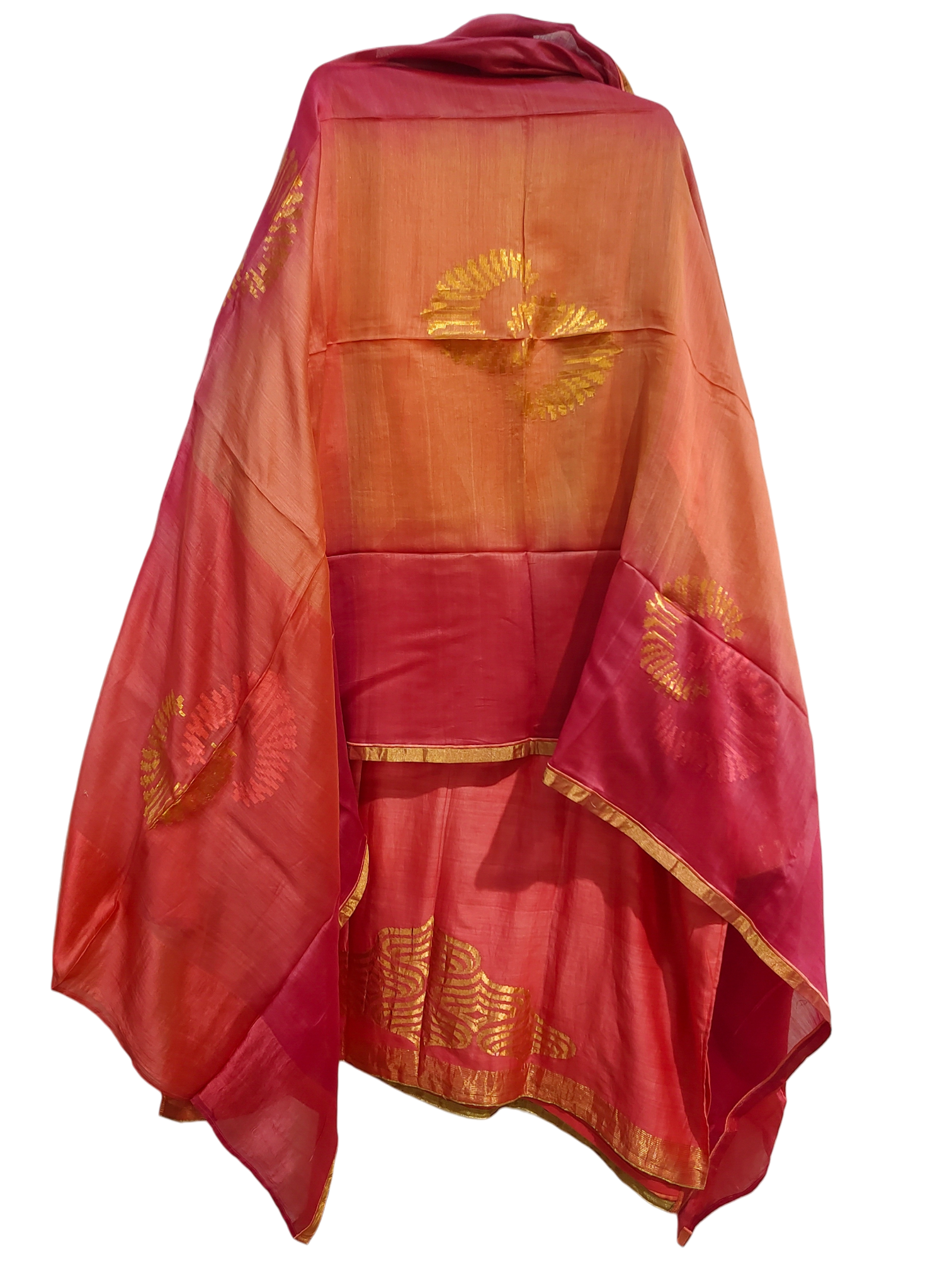A straight-cut coral-red silk kurta featuring central gold woven abstract motifs, elbow-length sleeves with gold embroidered cuffs, and a metallic gold hem. Styled with a sheer silk dupatta in gradient shades of deep red to orange, adorned with gold woven circular patterns and finished with a gold trim.