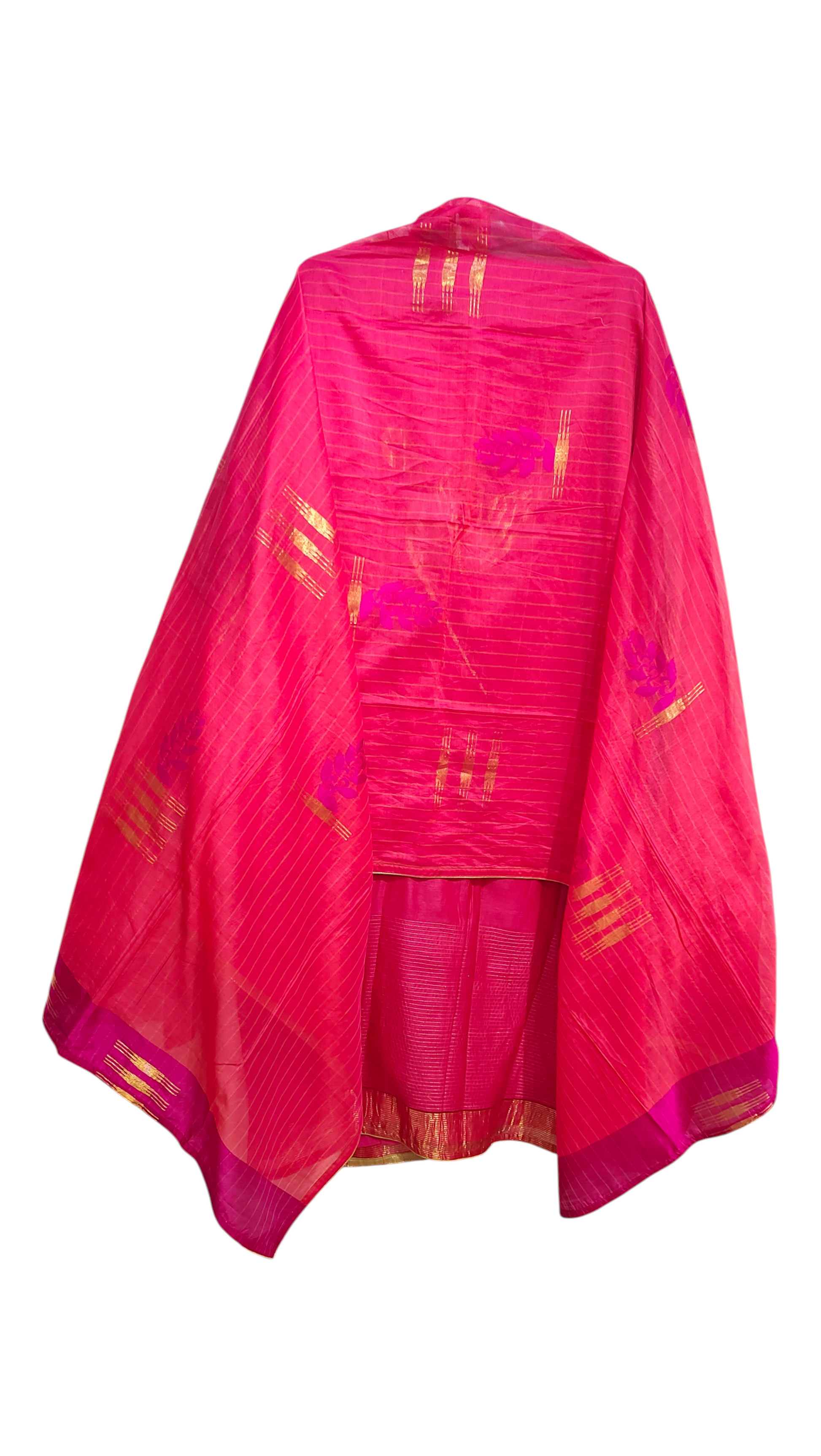 A striking hot pink silk kurta set, featuring a minimal yet rich texture on the body and intricate golden threadwork borders. The kurta is paired with a coordinated dupatta that showcases fine vertical pinstripes and vibrant woven motifs of cranes and flora in gold and magenta. The look is bold, festive, and rooted in tradition,