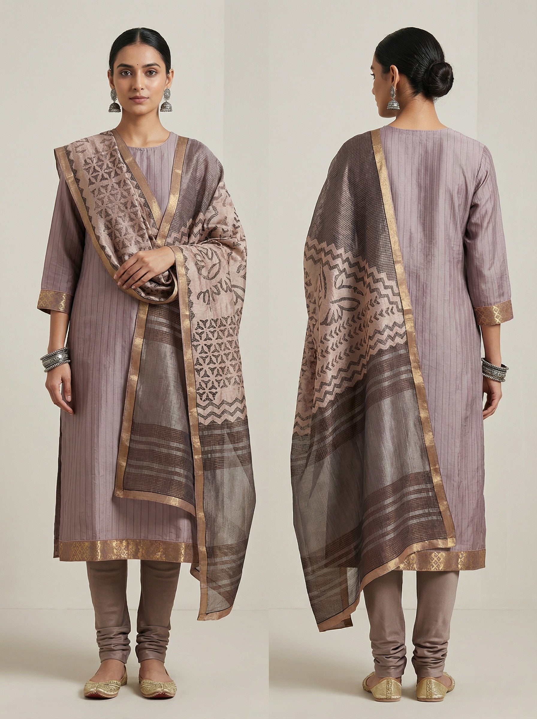 A knee-length straight-cut silk kurta in muted dusty-lavender with subtle vertical pinstripes, three-quarter sleeves with metallic gold brocade cuffs, and a minimal round neckline, paired with a sheer silk dupatta in soft beige and charcoal featuring geometric block-print motifs, zigzag patterns, and a wide gold zari border with darker gradient panels,