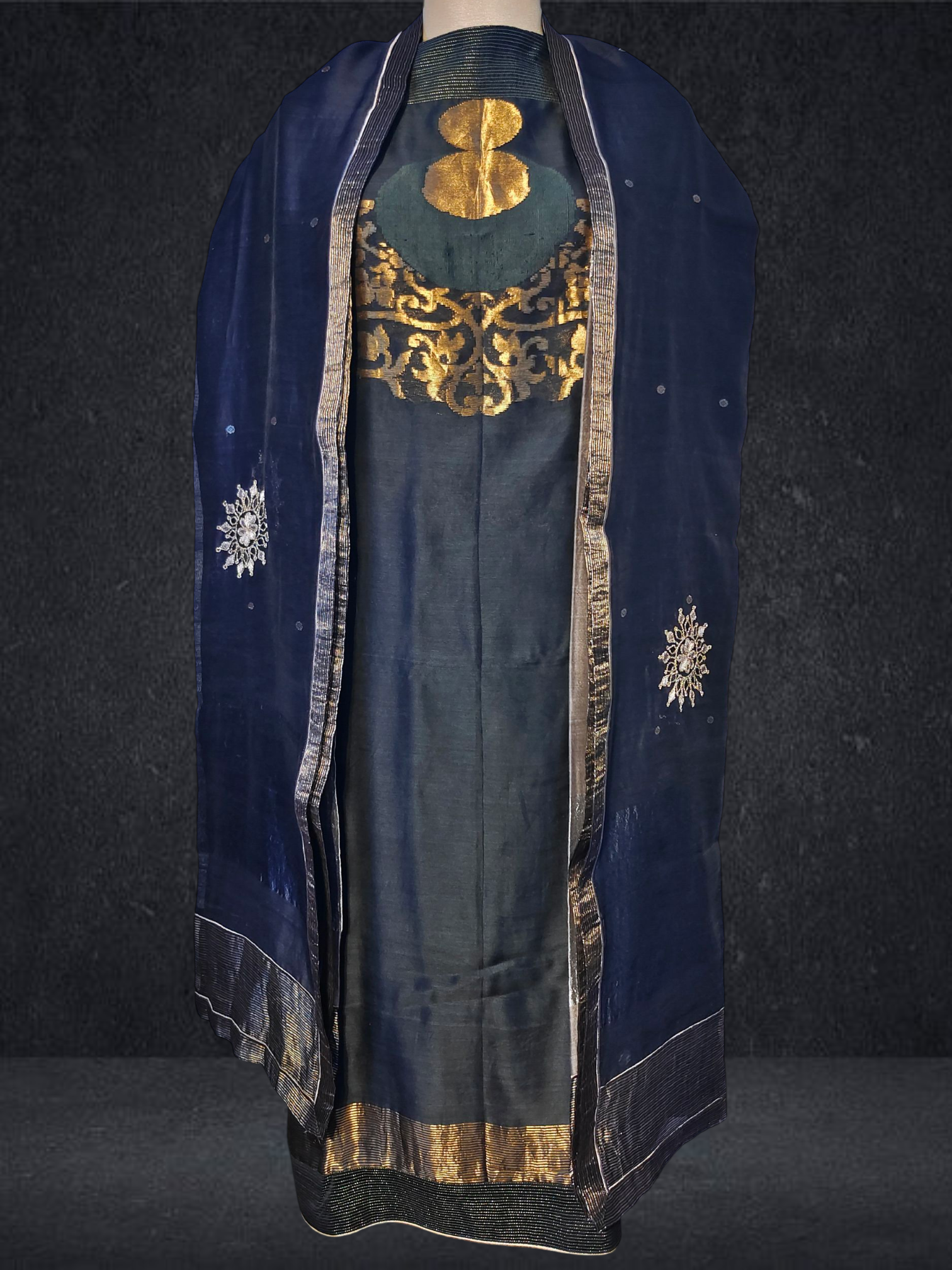 This 3 pc suitset features an elegant zari woven buta kurta and textured chanderi designed in unique abstract floral theme.Kurta is 48 inch maximum in length but can be shortened as per requirement as there is no neckline .The single side ghera is 34 inch so sizes upto 5XL are possible to get tailored in this material.The kurta is prelined with cotton mal.