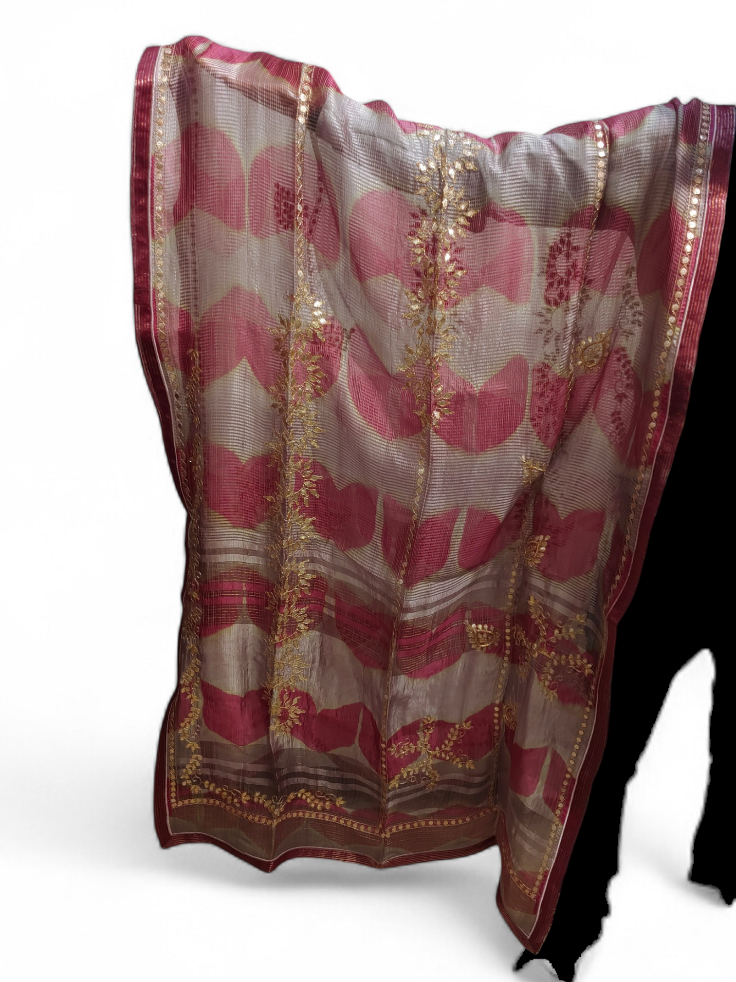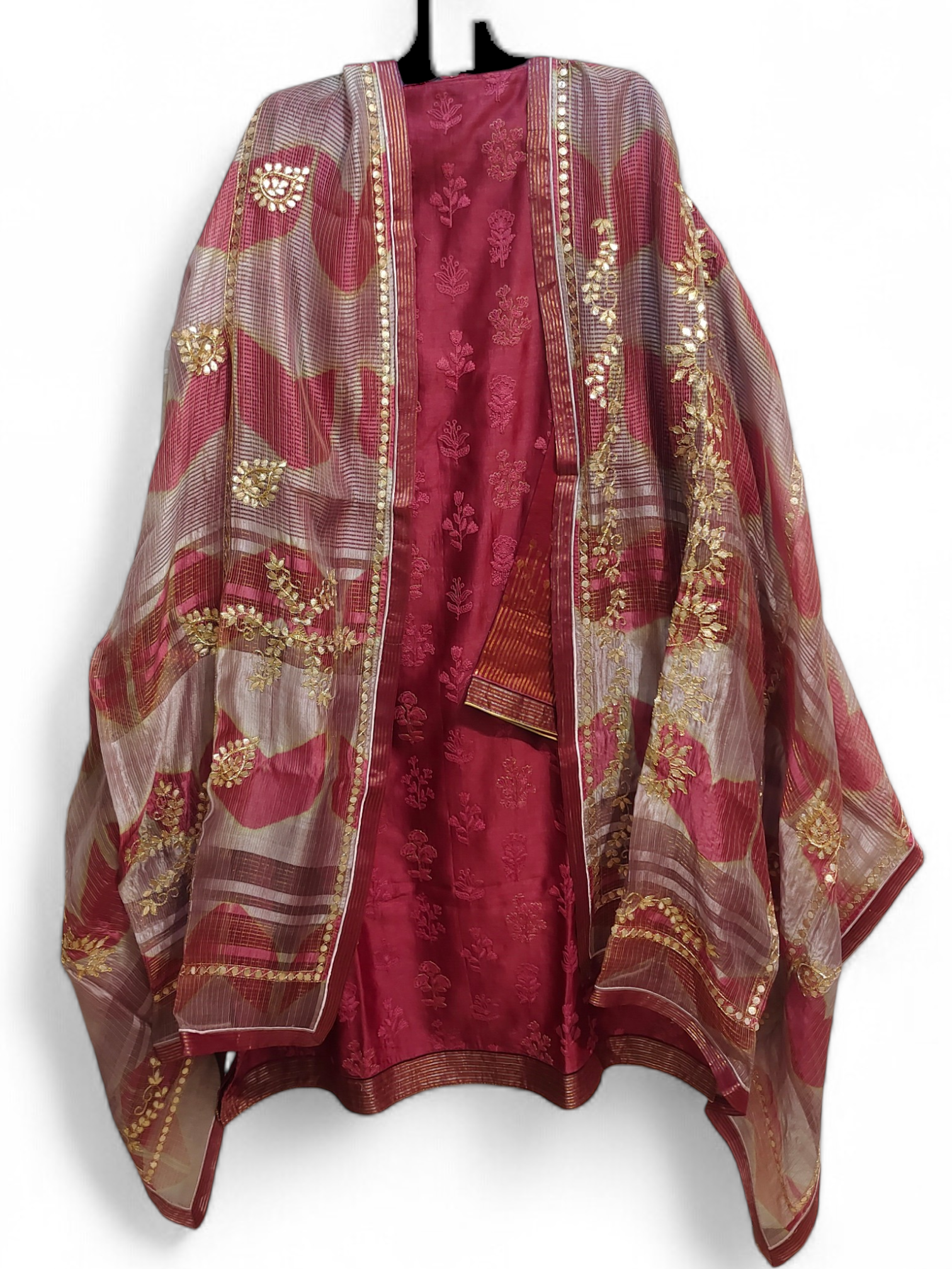 A knee-length straight-cut deep raspberry pink silk kurta with a relaxed silhouette and three-quarter sleeves, adorned with tonal floral buti embroidery throughout and a subtle gold zari border at the hem and sleeve cuffs; layered with a sheer organza dupatta in blush, rose, and muted beige tie-dye tones, featuring fine horizontal stripe texture, intricate gold zari floral embroidery, delicate mirror work along the borders, and a narrow metallic gold trim;