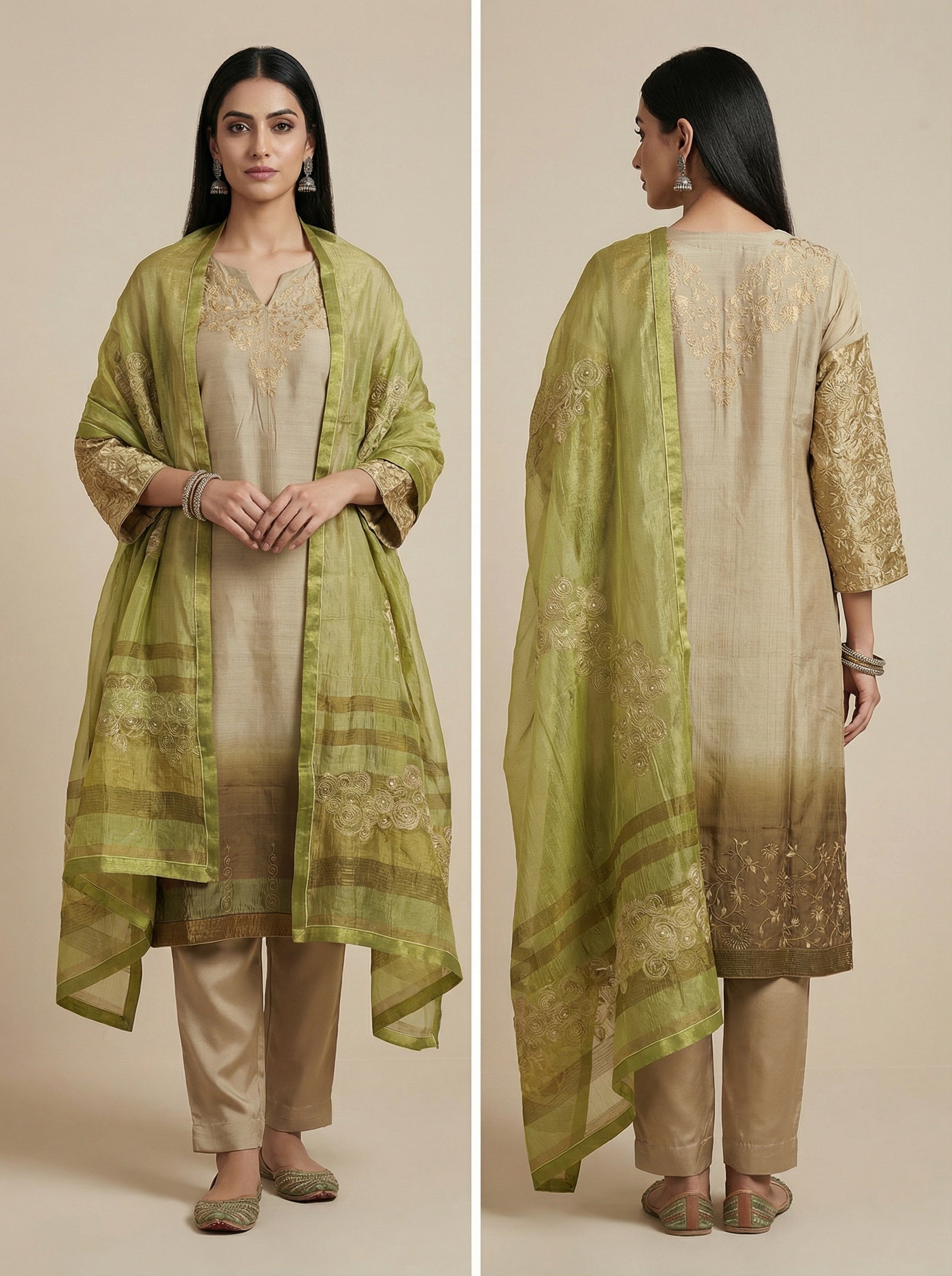 A sophisticated three-piece ethnic suit featuring a knee-length straight-cut silk tunic in muted beige with an ombré gradient fading into deep olive-brown at the hem, detailed with intricate gold floral embroidery on the neckline and richly embroidered three-quarter sleeves; paired with a sheer olive-lime organza dupatta draped elegantly over both shoulders, showcasing delicate spiral floral thread embroidery, subtle bead accents, and horizontal woven stripe borders with a refined olive-gold edge;