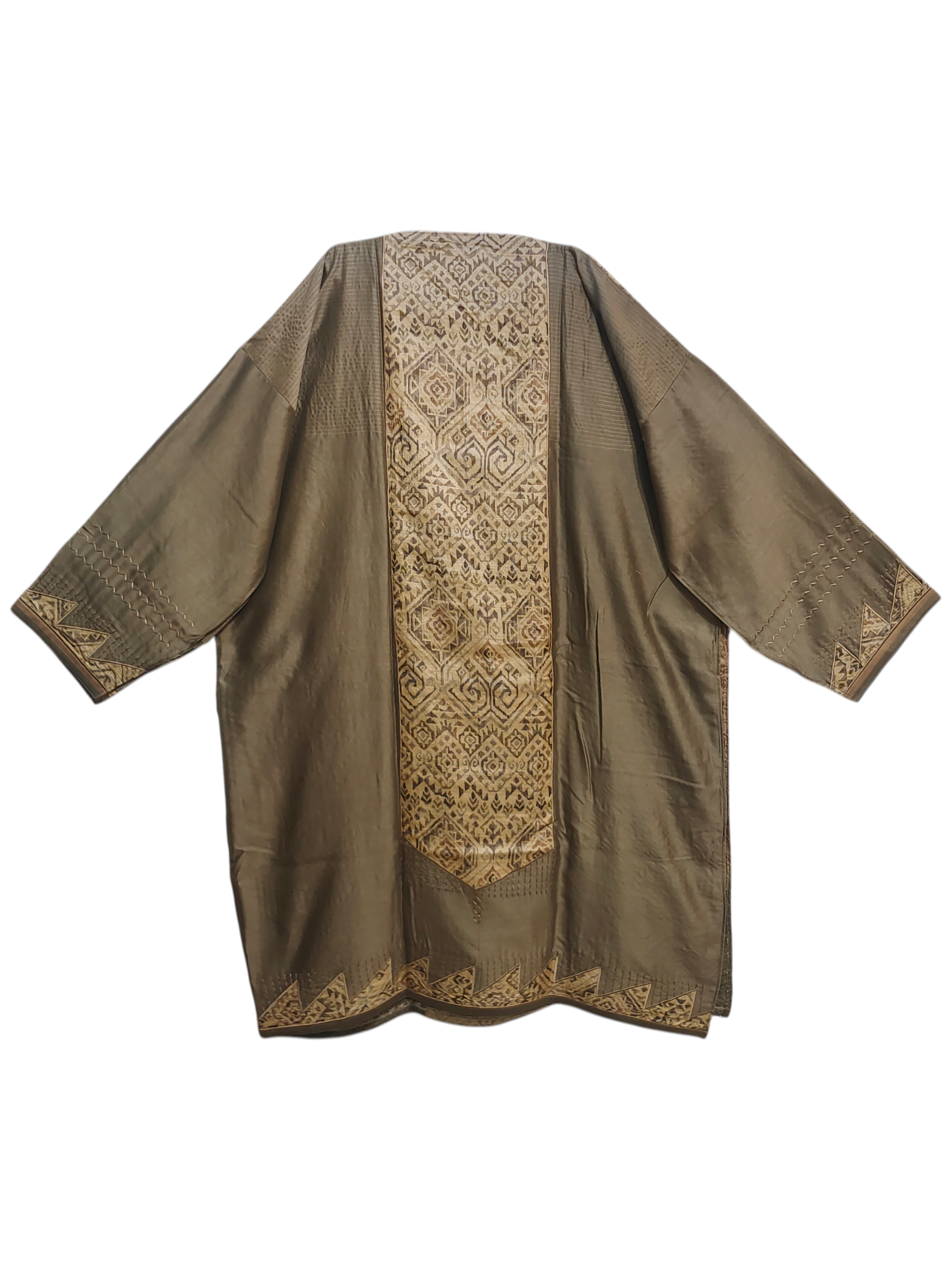 A regal coordinated ethnic ensemble featuring a knee-length straight-cut silk kurta in muted olive and antique gold tones, designed with a structured V-shaped chevron pleated yoke panel, intricate woven geometric jacquard patterns along the center panel, and subtle tonal texture throughout; paired with a rich complementary lower in deep olive with ornate border detailing; layered with a luxurious champagne-gold silk organza dupatta featuring soft luminous sheen, delicate gold thread floral embroidery motifs placed along the borders and corners, and broad woven stripe accents near the hem;