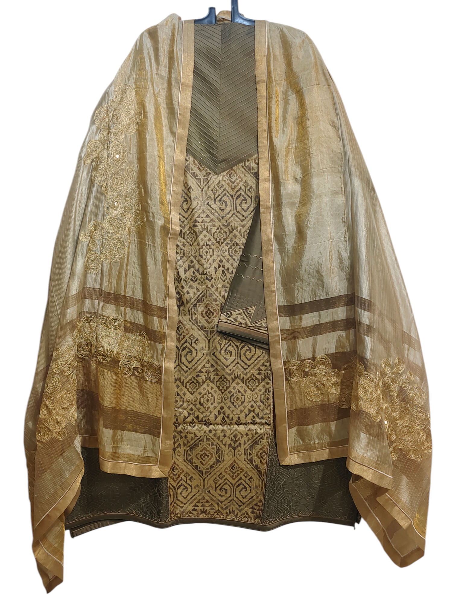 The dupatta measures 2.5 meters in length and 38 inches in width.The ensemble is provided with a matching cotton satin bottom material for 2.5 mts.