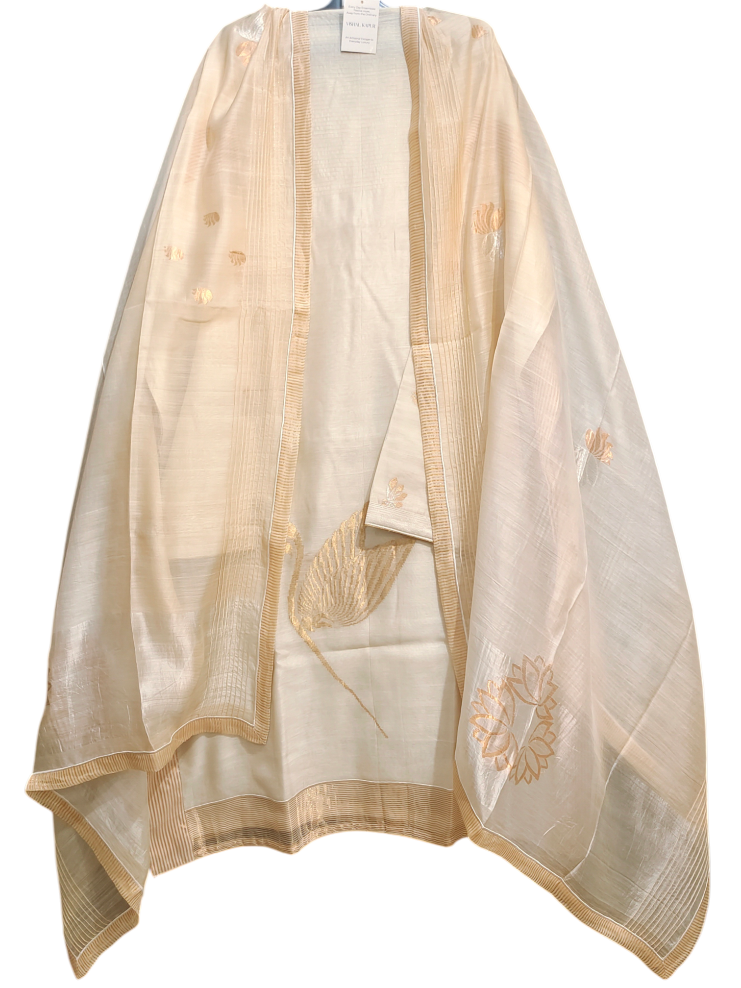 A knee-length straight-cut kurta in soft ivory silk with a subtle natural sheen, designed with minimalistic elegance and delicate gold thread embroidery featuring scattered floral and leaf motifs, highlighted by a statement swan motif embroidered near the hem in fine zari detailing, three-quarter sleeves with small tonal gold accents, and a refined gold woven border along the hemline; paired with a sheer silk organza dupatta in a matching ivory tone adorned with sparse gold floral butis and a finely textured gold-striped border;