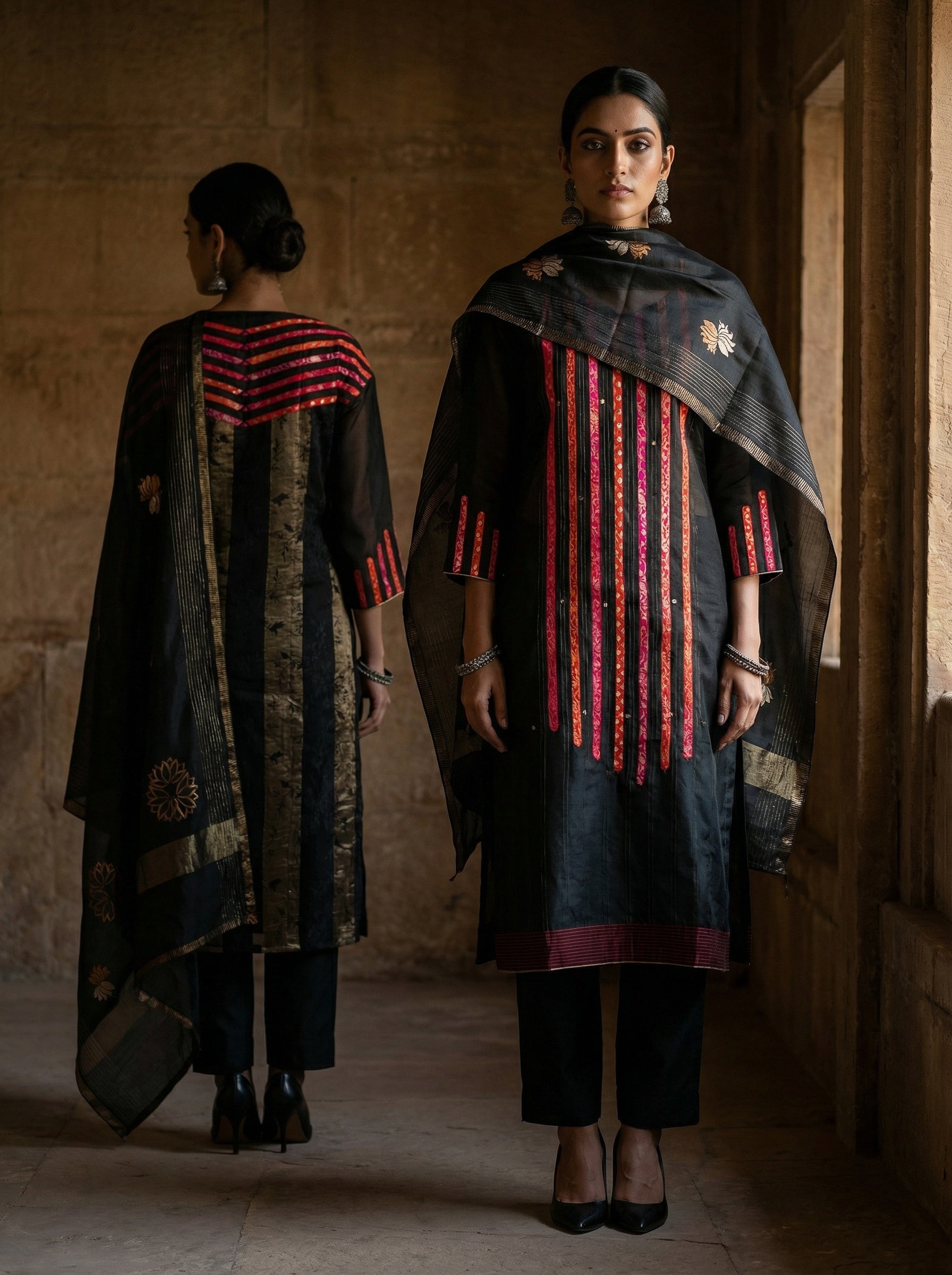 A striking interplay of deep black and luminous crimson, this semistitched kurta suitset is crafted in pure cotton silk Chanderi. The front features structured vertical panel detailing enhanced with intricate zari vine banaresi brocade, creating a regal elongated silhouette. Paired with a bold silk Chanderi dupatta in vibrant red with woven gold motifs, this ensemble makes a refined festive statement with understated luxury. Coordinated bottom fabric completes the look seamlessly.
