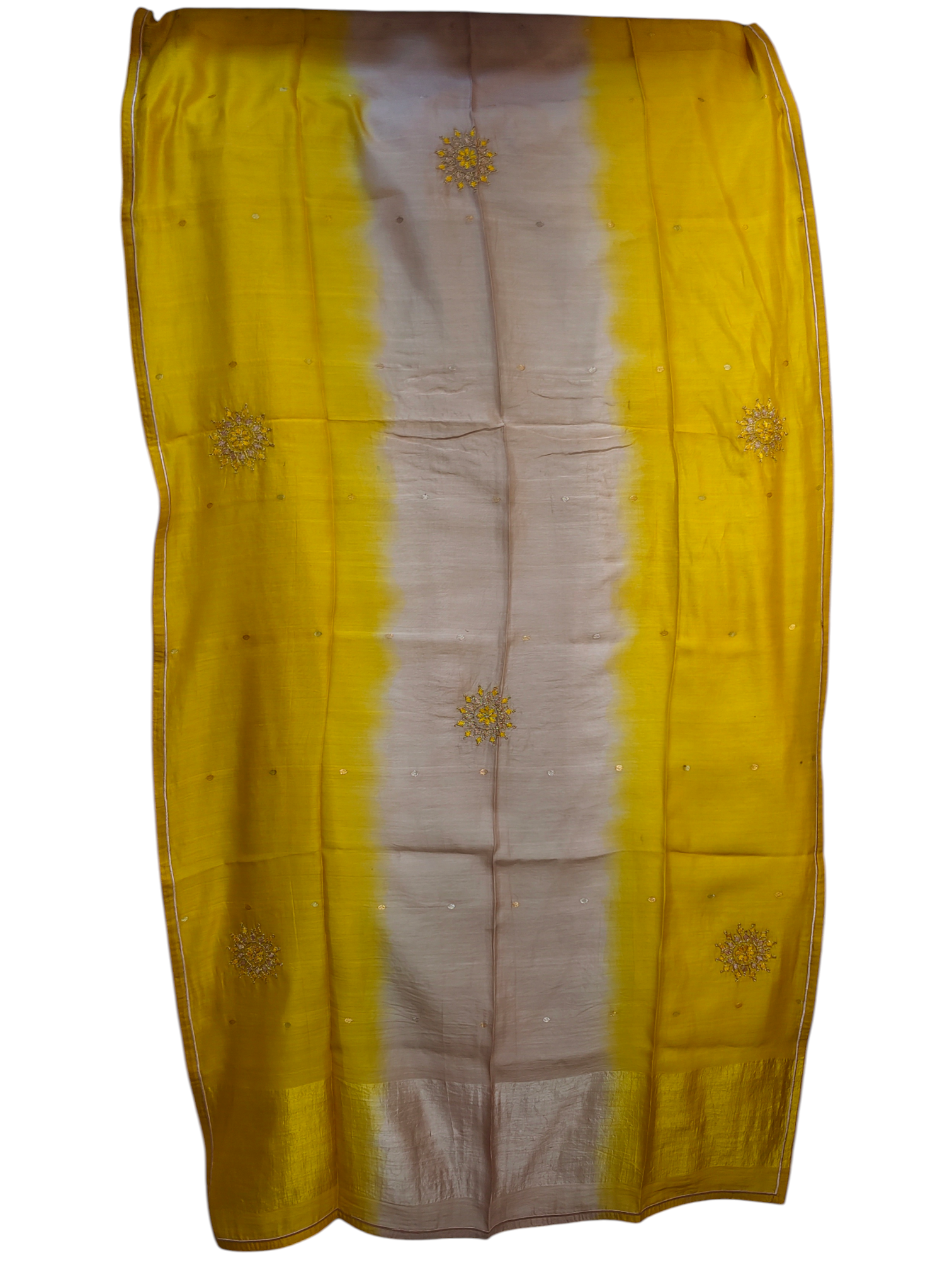 • Silk chanderi dupatta in Kesar Amber and Badami Sand gradient with sunburst embroidery