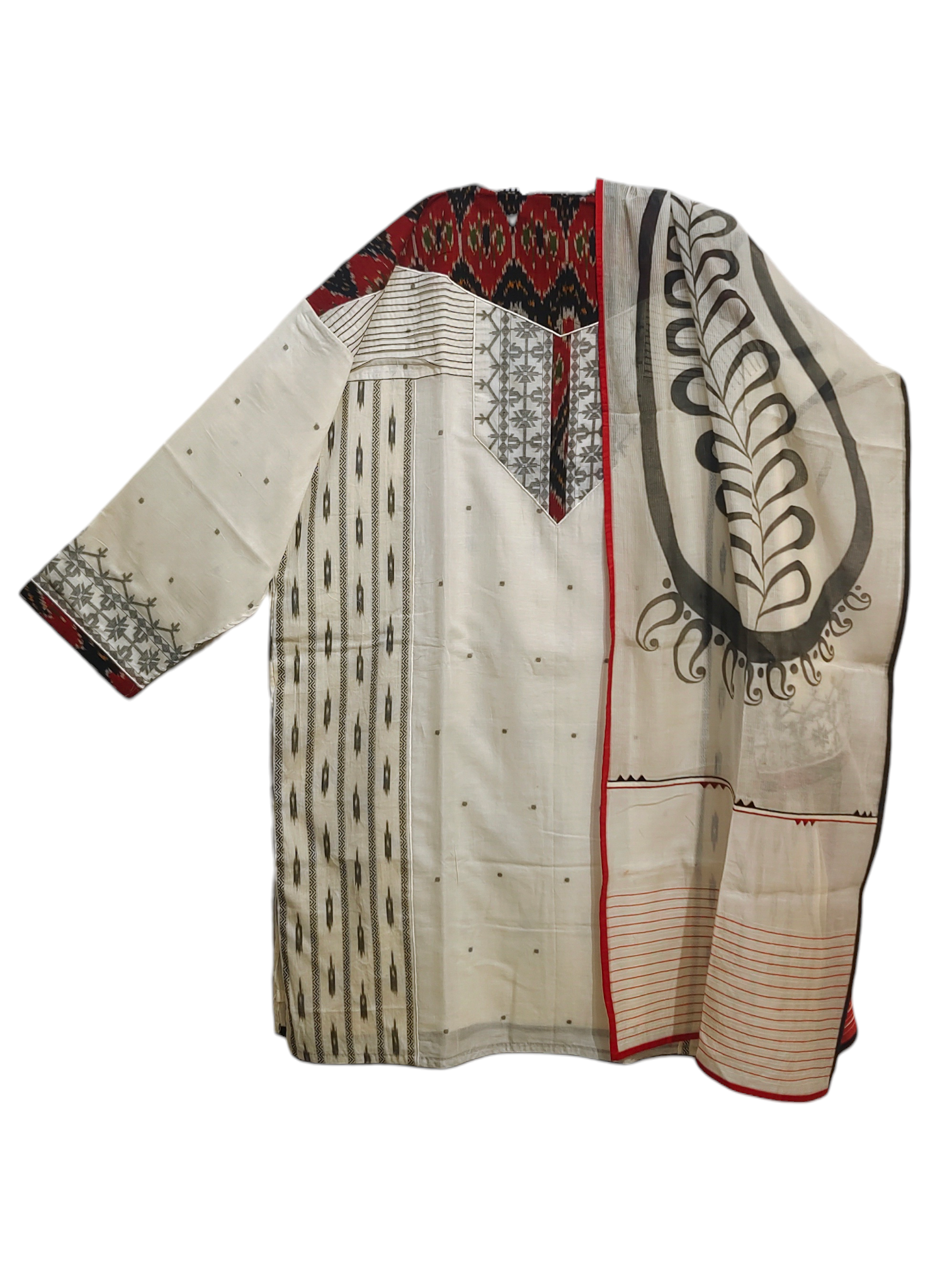A serene Chaand Ivory Chanderi kurta set defined by its interplay of woven traditions and graphic restraint. The surface is composed with vertical ikat-inspired panels and fine linear textures, offset by a structured yoke that introduces geometric buta detailing. Scattered micro motifs lend lightness across the body, while the silk chanderi dupatta, highlighted with bold paisley-inspired artwork and a striking Anar red border, adds a contemporary contrast to the otherwise understated palette—an elegant expression for refined day festivities.