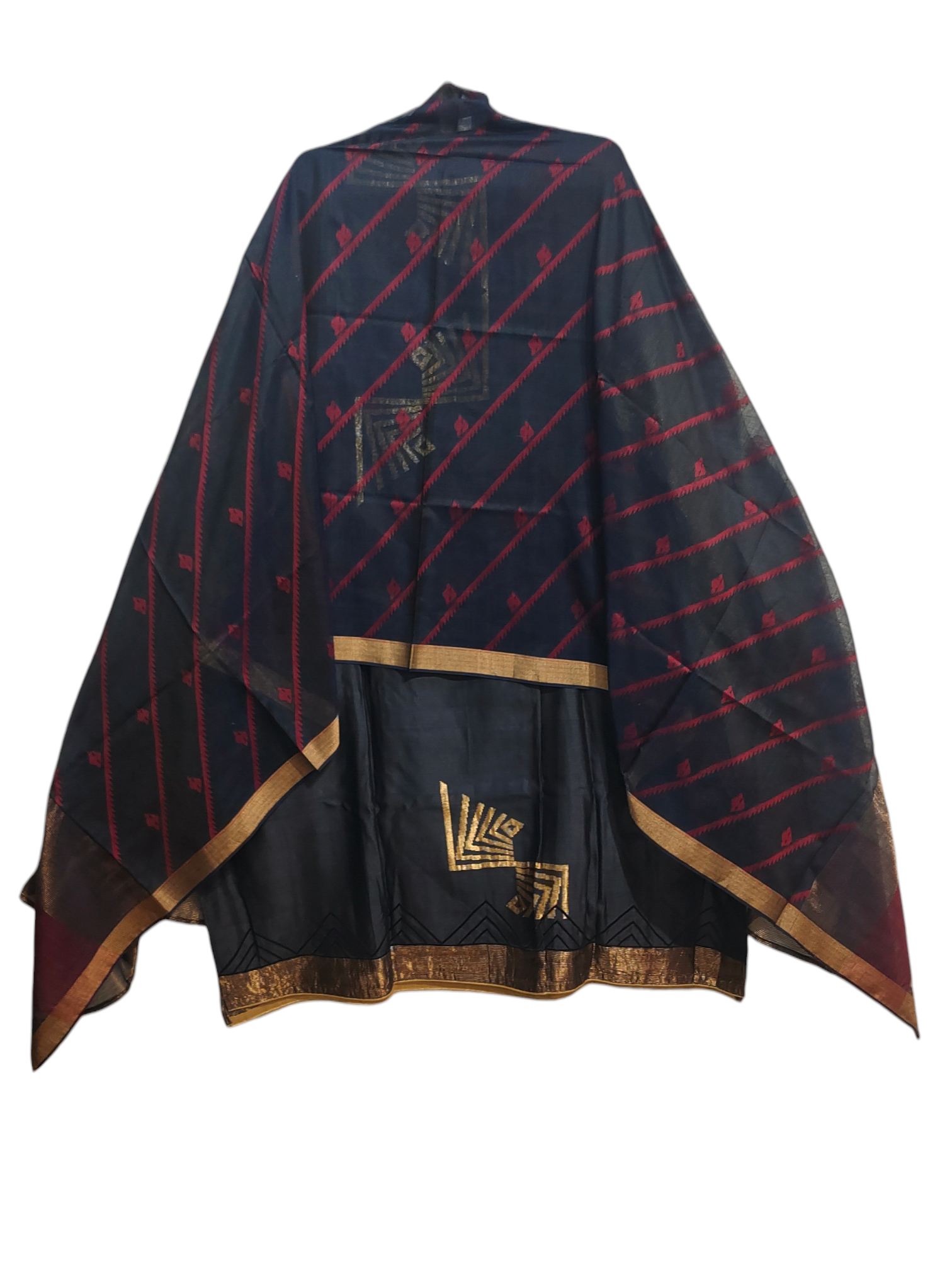 A deep Neel noir canvas meets structured zari geometry in this chanderi kurta suitset, crafted for understated evening elegance. The kurta is designed with a fluid, elongated silhouette, highlighted by angular geometric zari placements that trace a vertical rhythm across the body. Subtle border detailing at the hem adds quiet definition. The silk chanderi dupatta introduces contrast through diagonal resham lines and delicate buti accents, framed with a refined zari border, lending movement and visual depth. Paired with a coordinated bottom fabric, this ensemble balances modern graphic sensibility with classic festive refinement.