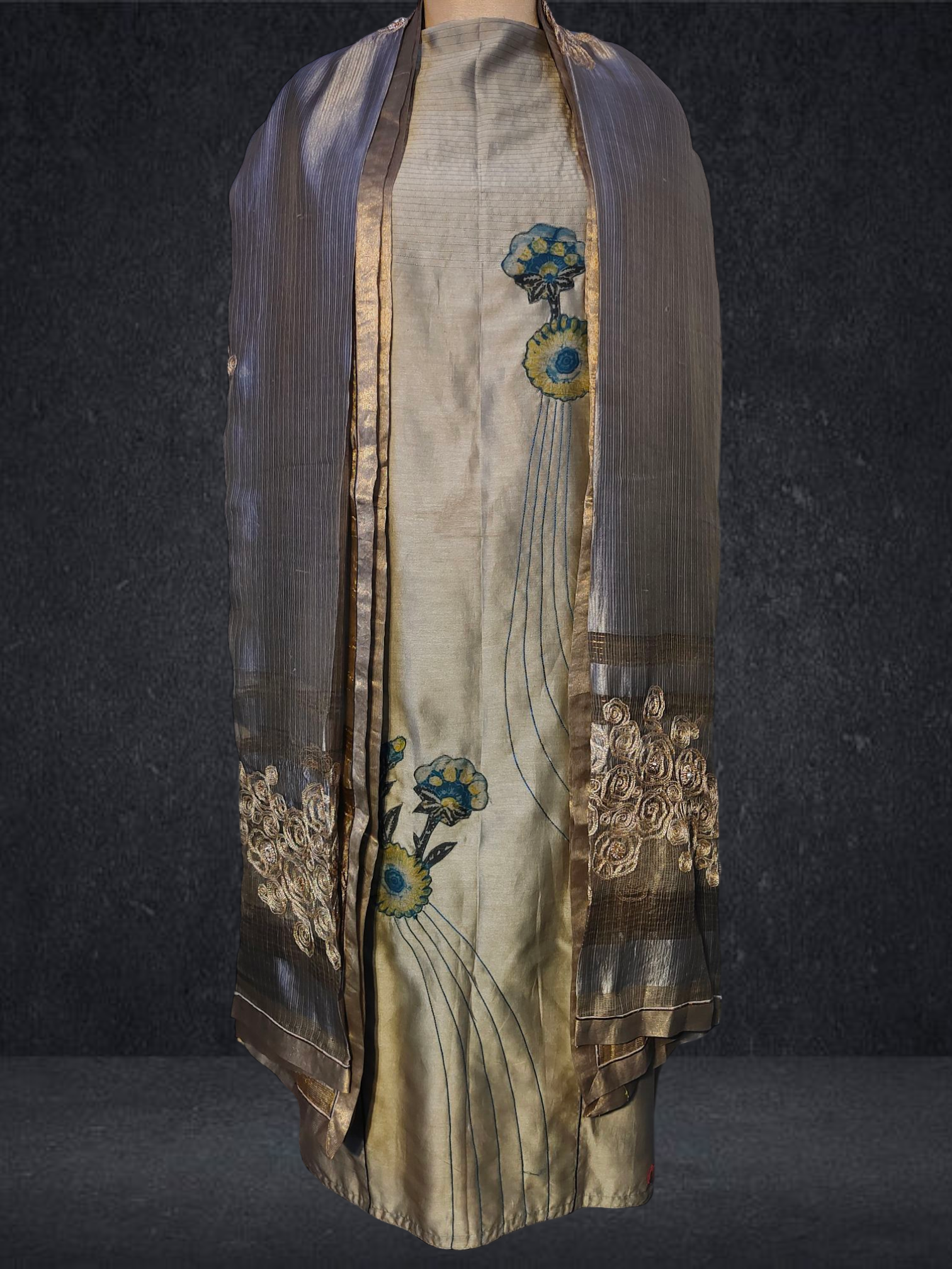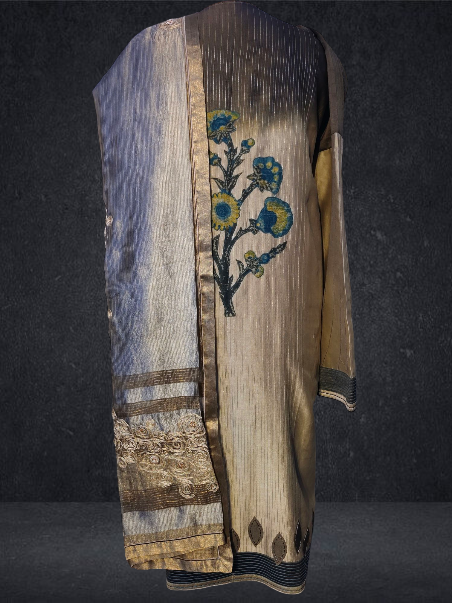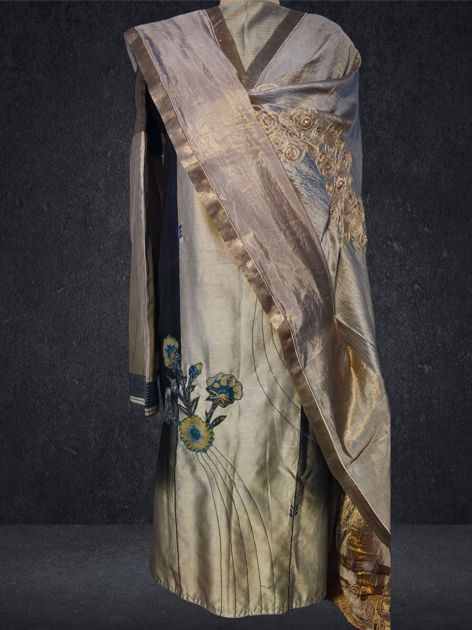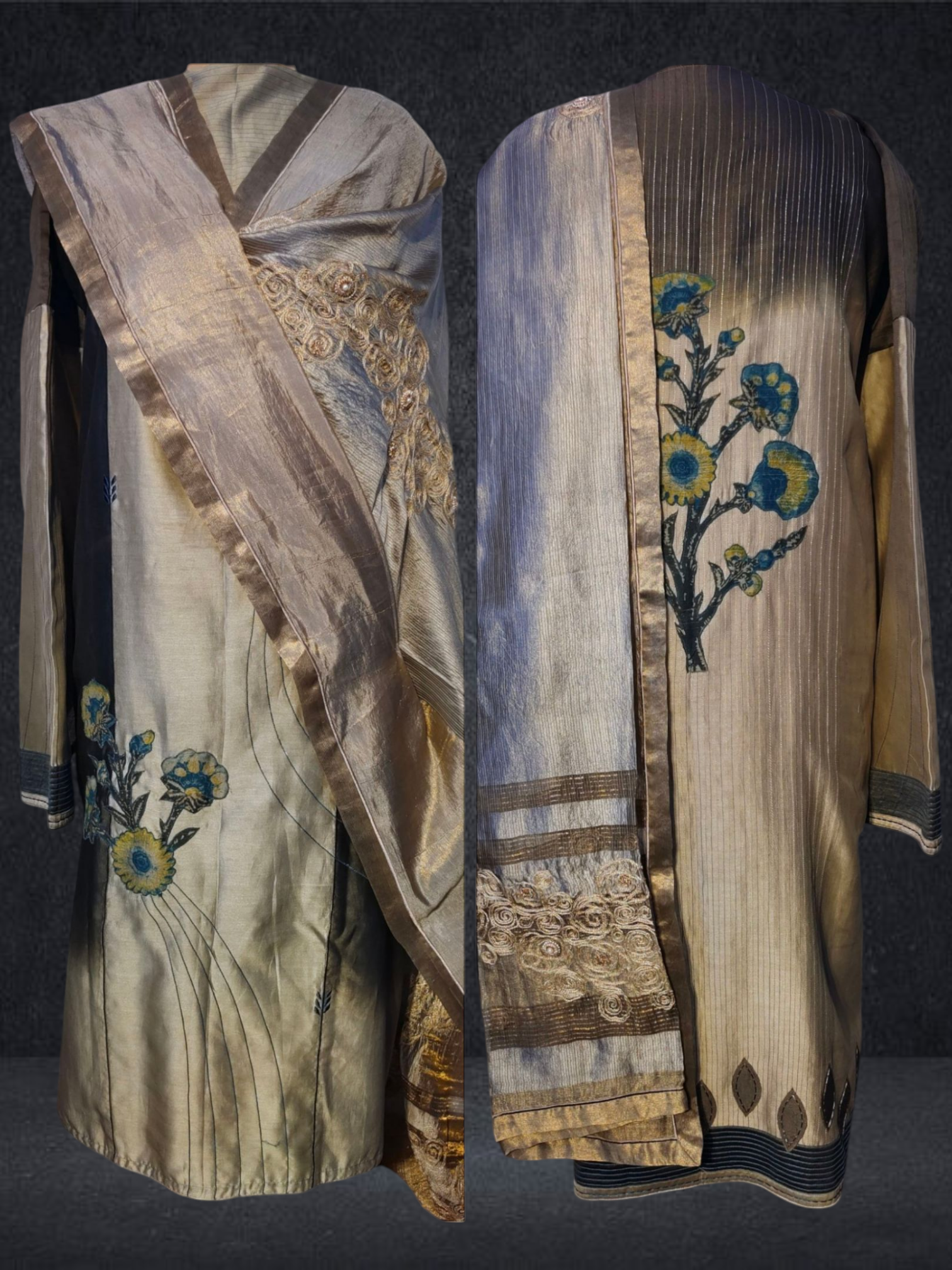 This 3 pc suitset features an elegant ajrakh appique and textured chanderi designed in unique abstract floral theme.Kurta is 48 inch maximum in length but can be shortened as per requirement as there is no neckline .The single side ghera is 34 inch so sizes upto 5XL are possible to get tailored in this material.The kurta is prelined with cotton mal.