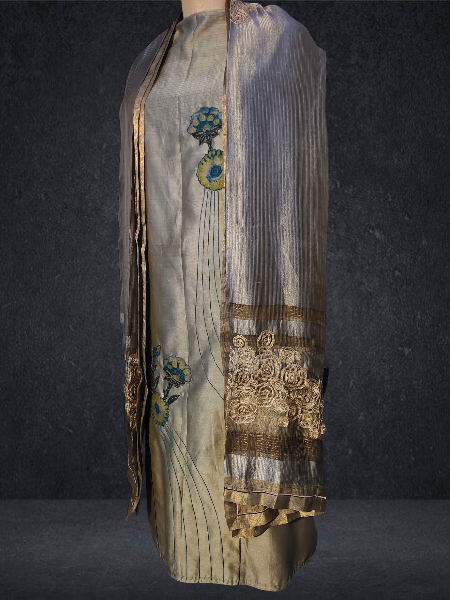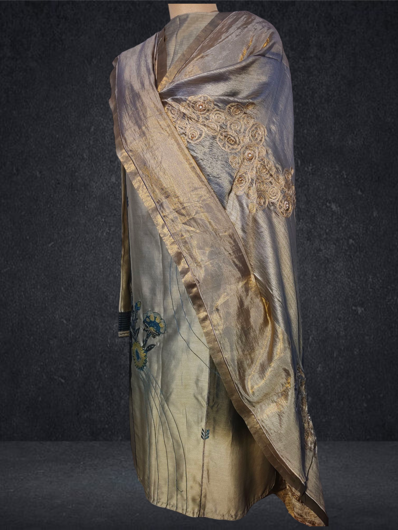 It is paired with a shaded Chanderi dupatta with floral motifs. The dupatta measures 2.5 meters in length and 38 inches in width.The ensemble is provided with a matching cotton satin bottom material for 2.5 mts.