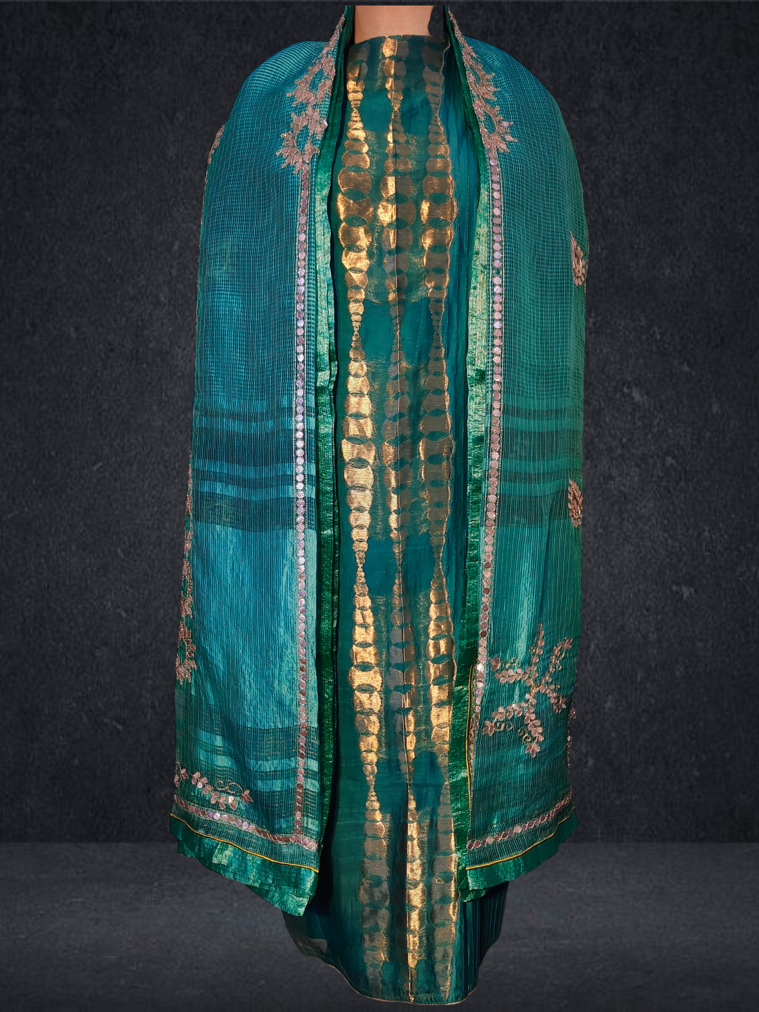 This 3 pc suitset features an elegant zari woven buta kurta and textured chanderi designed in unique abstract floral theme.Kurta is 48 inch maximum in length but can be shortened as per requirement as there is no neckline .The single side ghera is 34 inch so sizes upto 5XL are possible to get tailored in this material.The kurta is prelined with cotton mal.