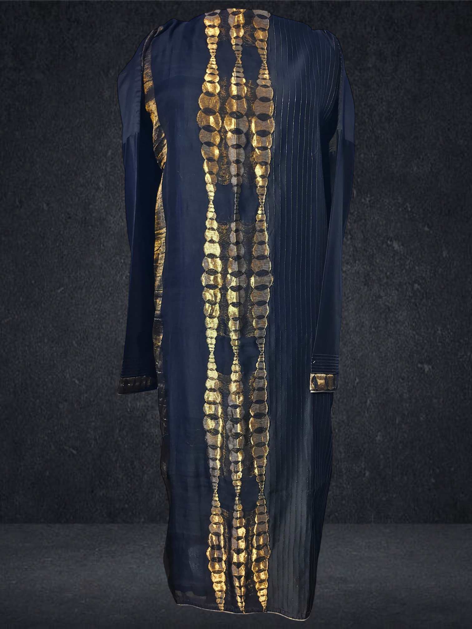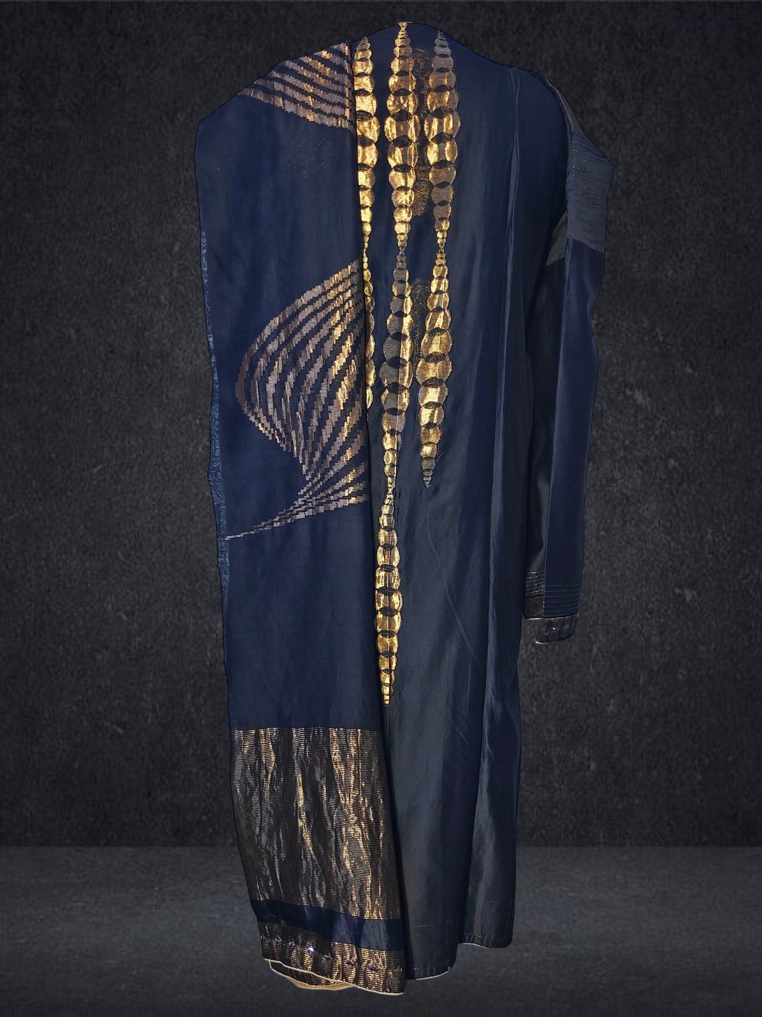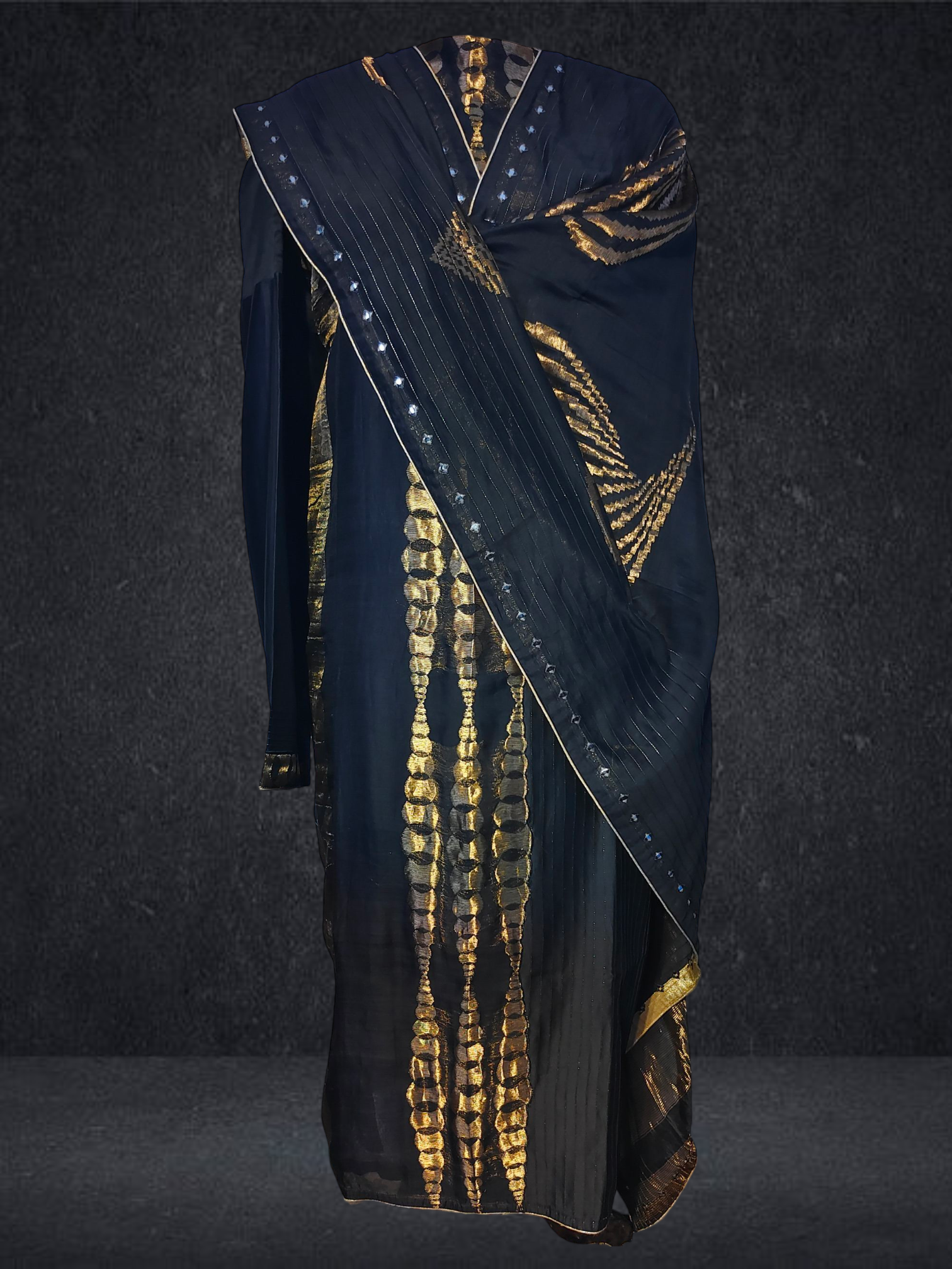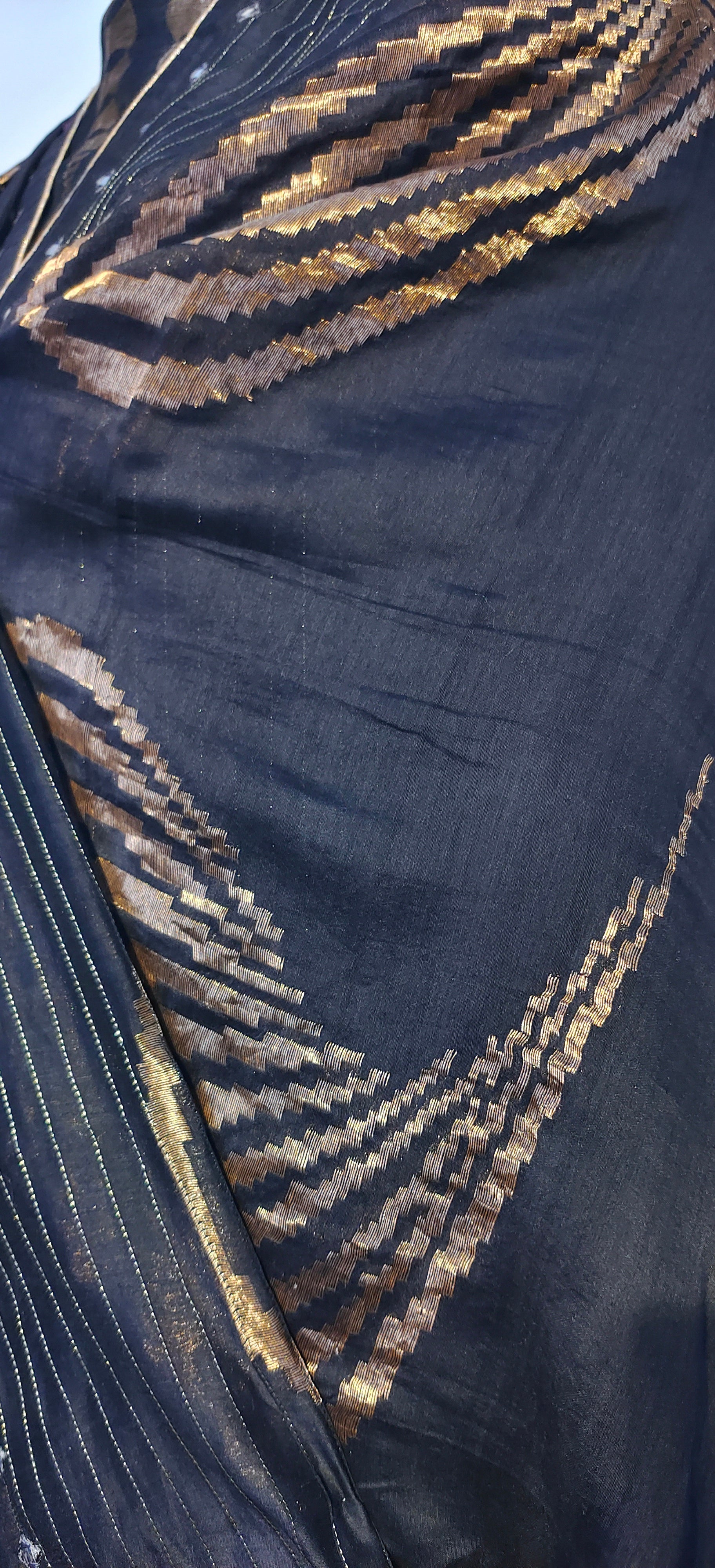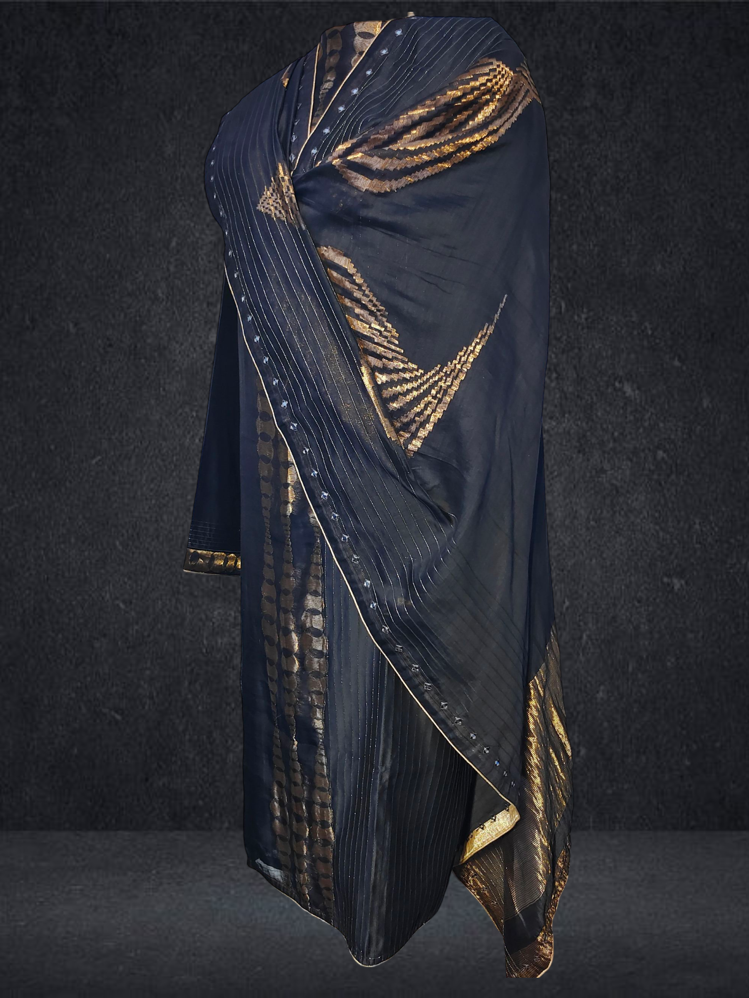 This 3 pc suitset features an elegant zari woven buta kurta and textured chanderi designed in unique abstract floral theme.Kurta is 48 inch maximum in length but can be shortened as per requirement as there is no neckline .The single side ghera is 34 inch so sizes upto 5XL are possible to get tailored in this material.The kurta is prelined with cotton mal.