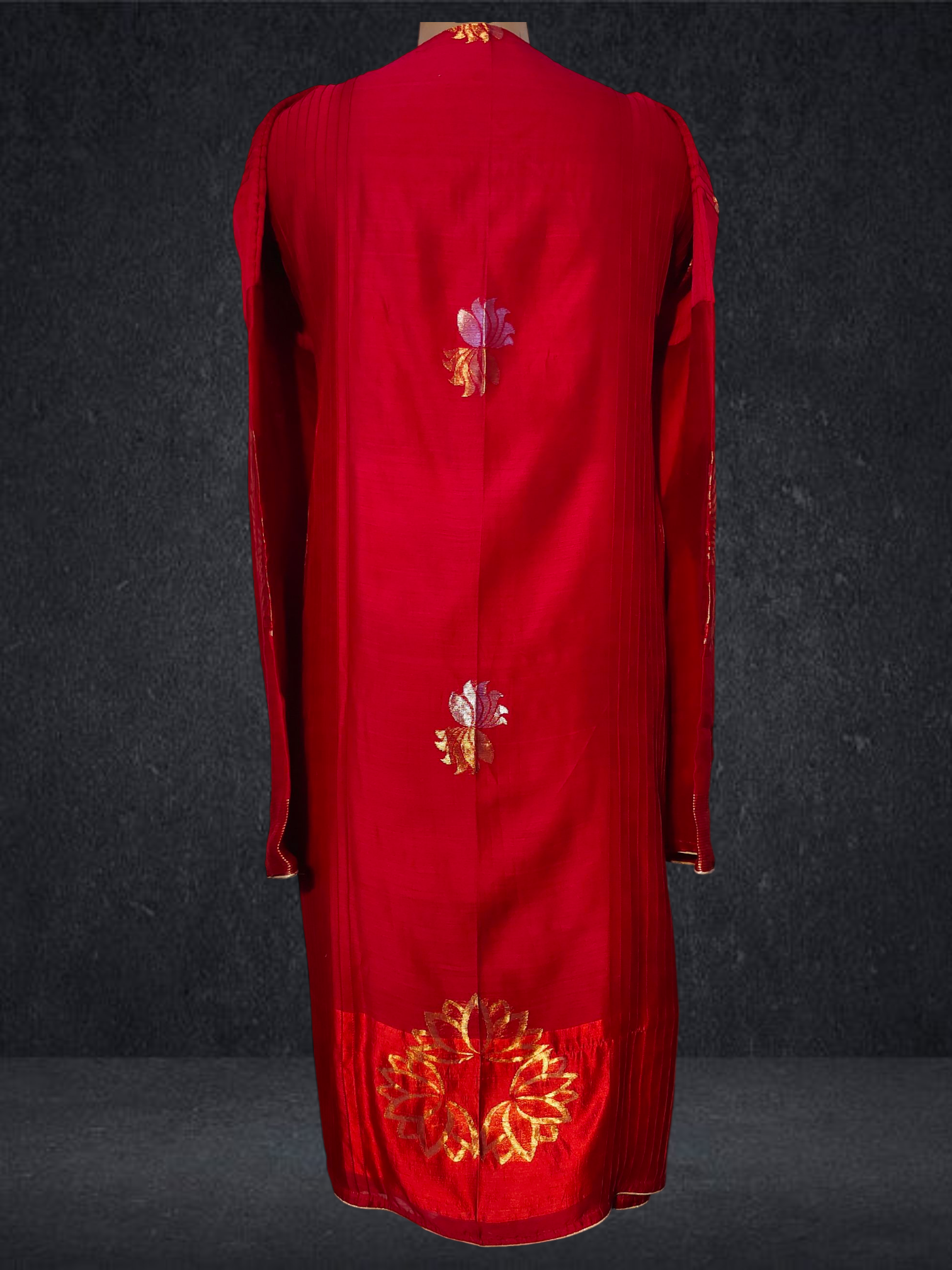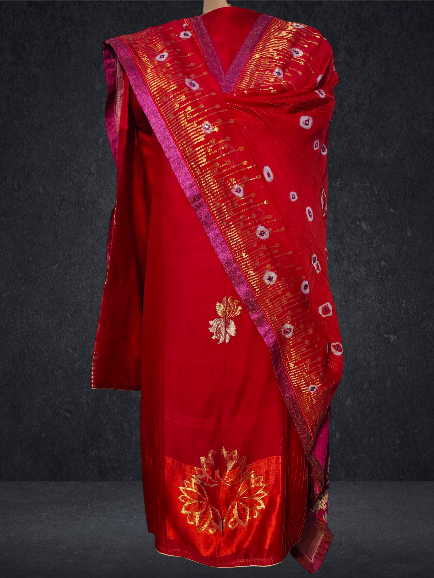 This 3 pc suitset features an elegant zari woven buta kurta and textured chanderi designed in unique abstract floral theme.Kurta is 48 inch maximum in length but can be shortened as per requirement as there is no neckline .The single side ghera is 34 inch so sizes upto 5XL are possible to get tailored in this material.The kurta is prelined with cotton mal.