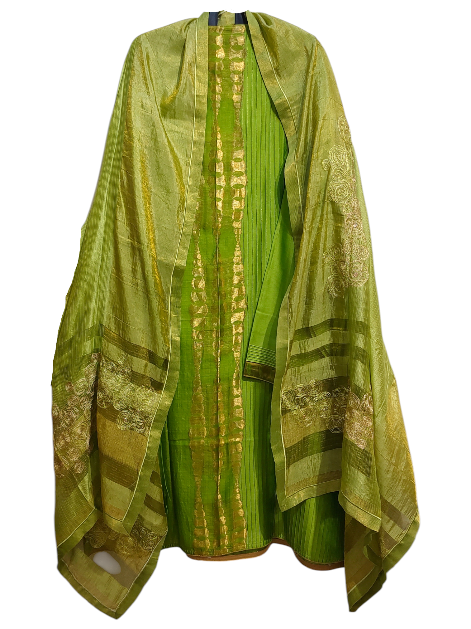 This semistitched 3 pc set features a structured green silk chanderi kurta set with vertical pinstripes paired with a silk dupatta featuring embroidered abstarct roses, floral vines, and lotus patterns, worn with green satin trousers.