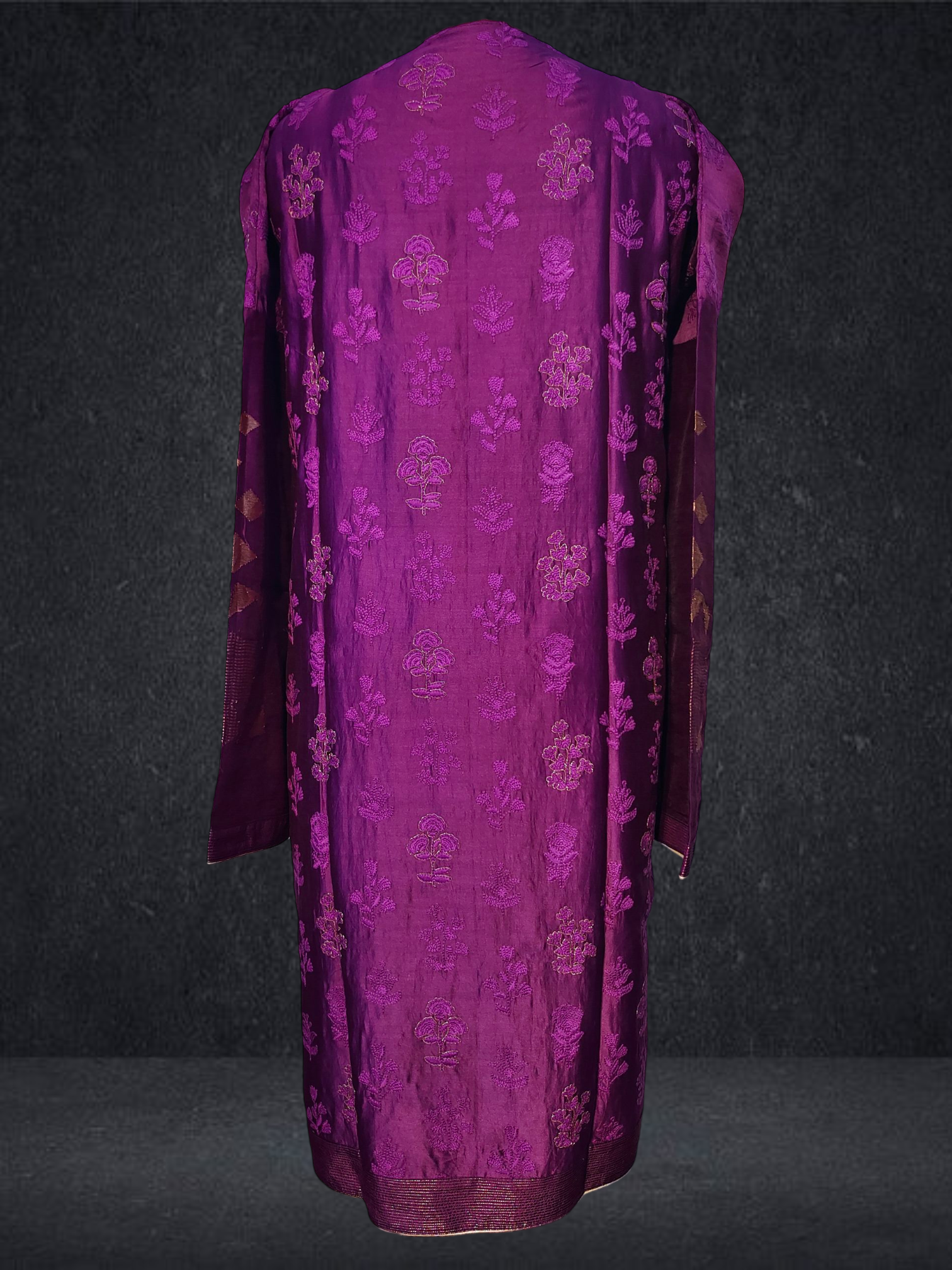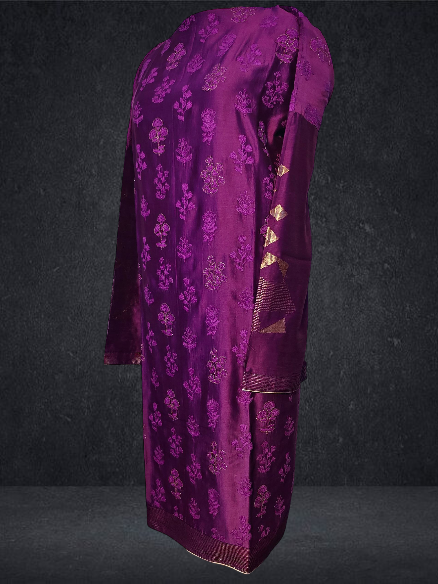 This 3 pc suitset features an elegant zari woven buta kurta and textured chanderi designed in unique abstract floral theme.Kurta is 48 inch maximum in length but can be shortened as per requirement as there is no neckline .The single side ghera is 34 inch so sizes upto 5XL are possible to get tailored in this material.The kurta is prelined with cotton mal.