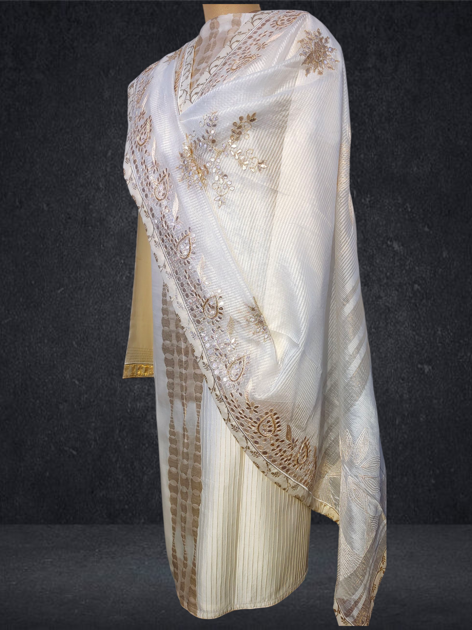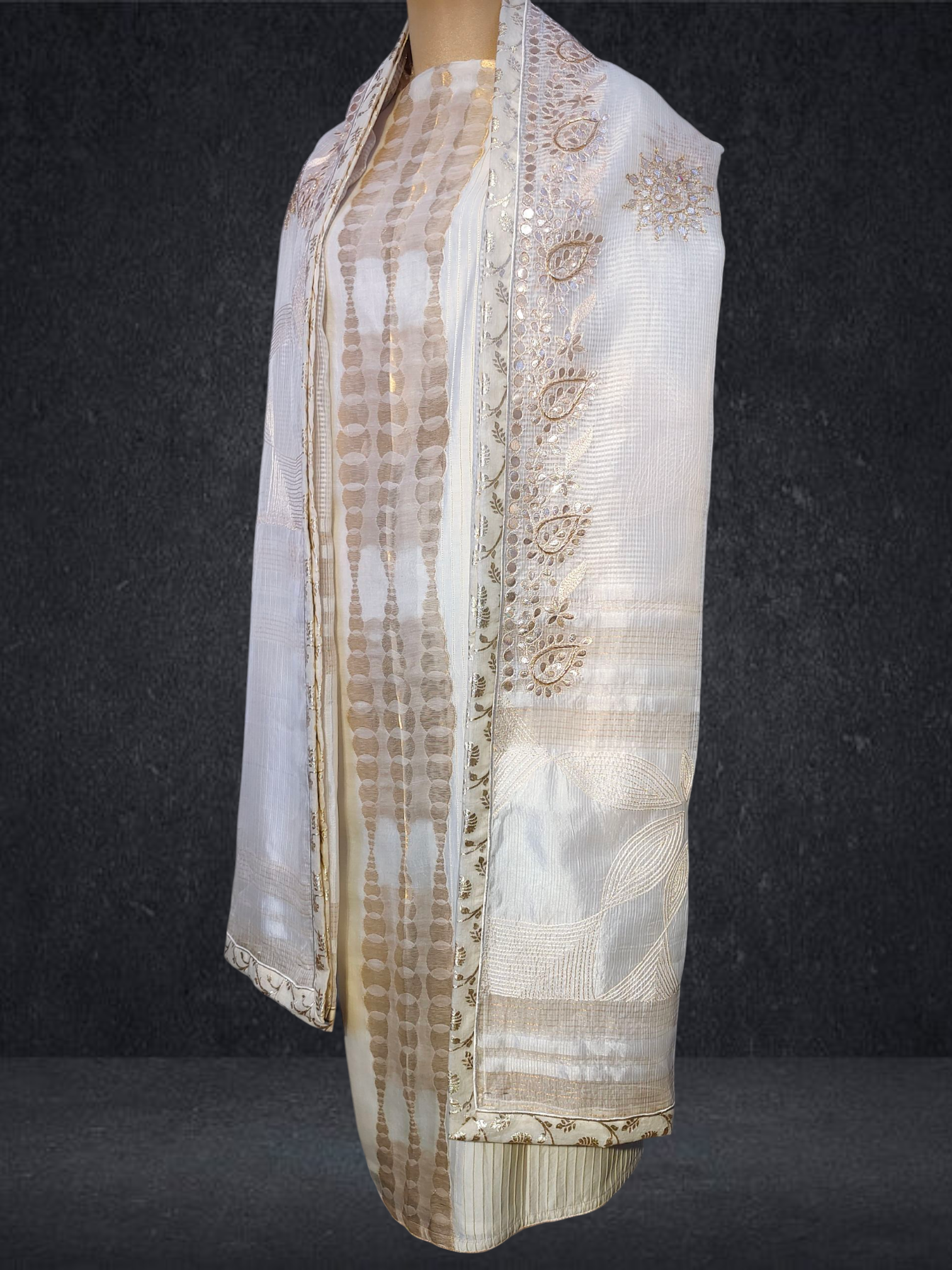 This 3 pc suitset features an elegant zari woven buta kurta and textured chanderi designed in unique abstract floral theme.Kurta is 48 inch maximum in length but can be shortened as per requirement as there is no neckline .The single side ghera is 34 inch so sizes upto 5XL are possible to get tailored in this material.The kurta is prelined with cotton mal.