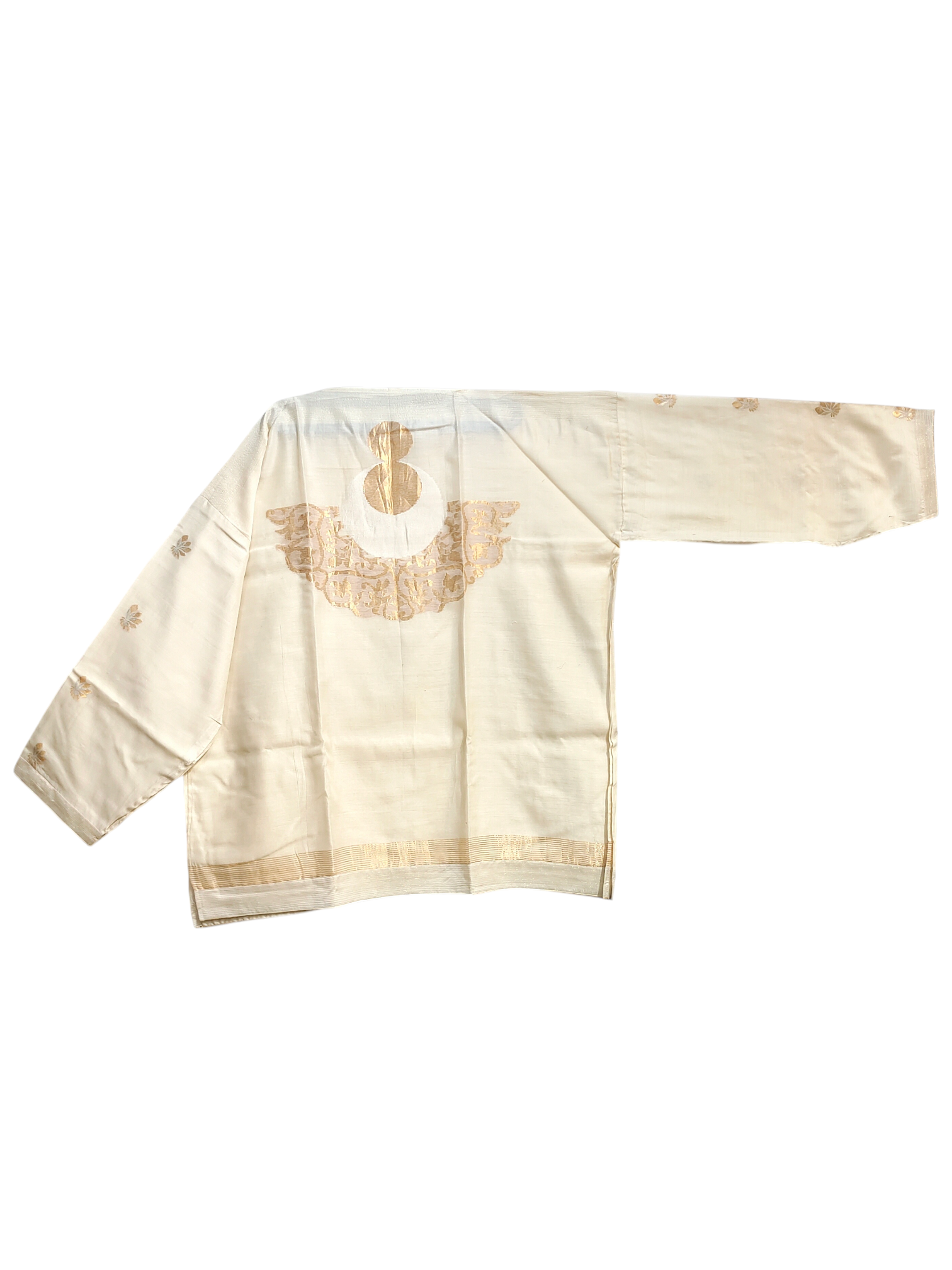 Full-body, edited professional shot of a model wearing an off-white silk waist-length short tunic with gold embroidered floral motifs on the sleeves and an abstract metallic gold motif on the front, paired with a high-waisted flared gold silk umbrella flared skirt with a soft gold sheen, clean minimal fashion product photo, contemporary Indian artisanal styling in the style of Raw Mango fashion editorial.