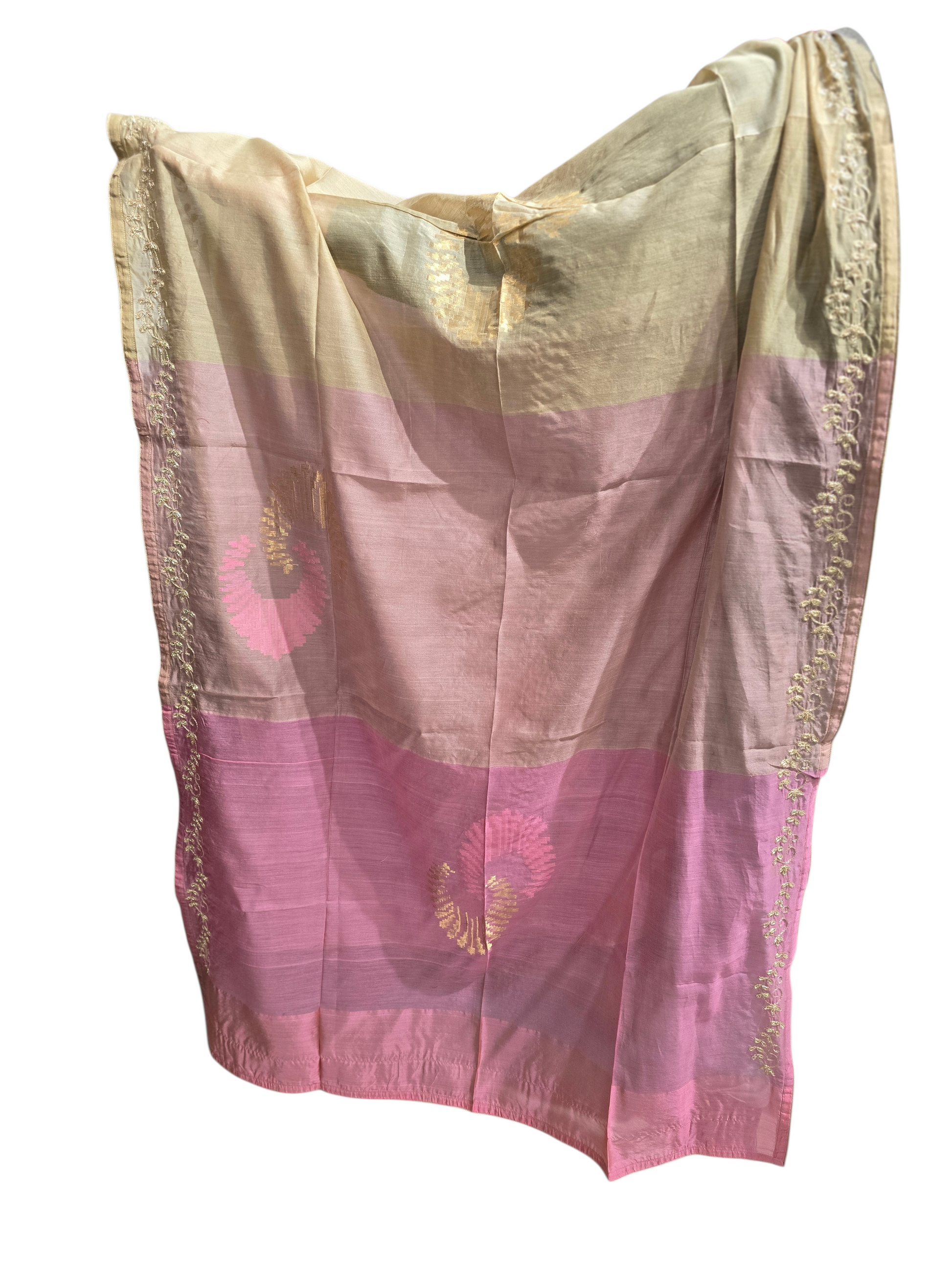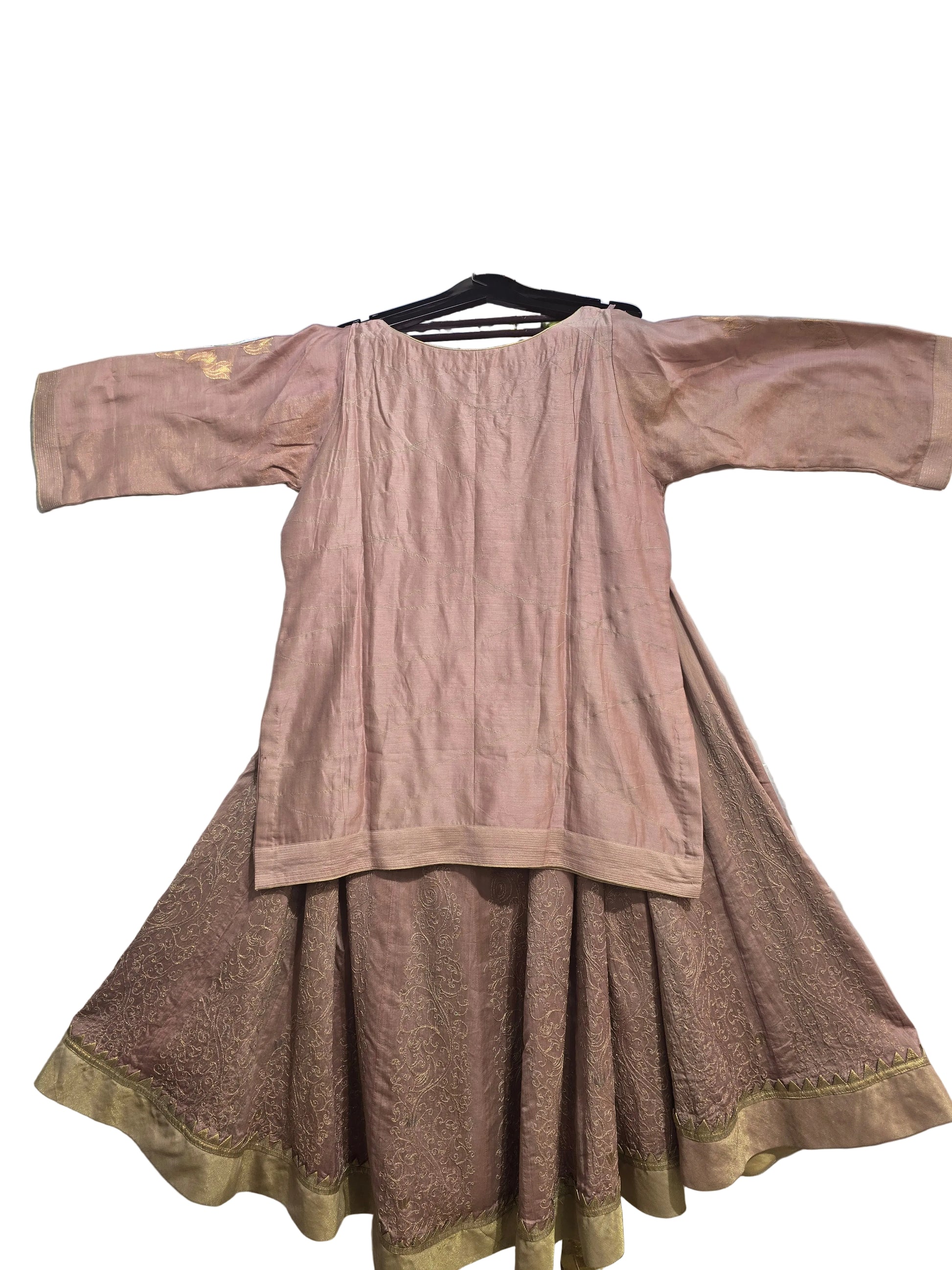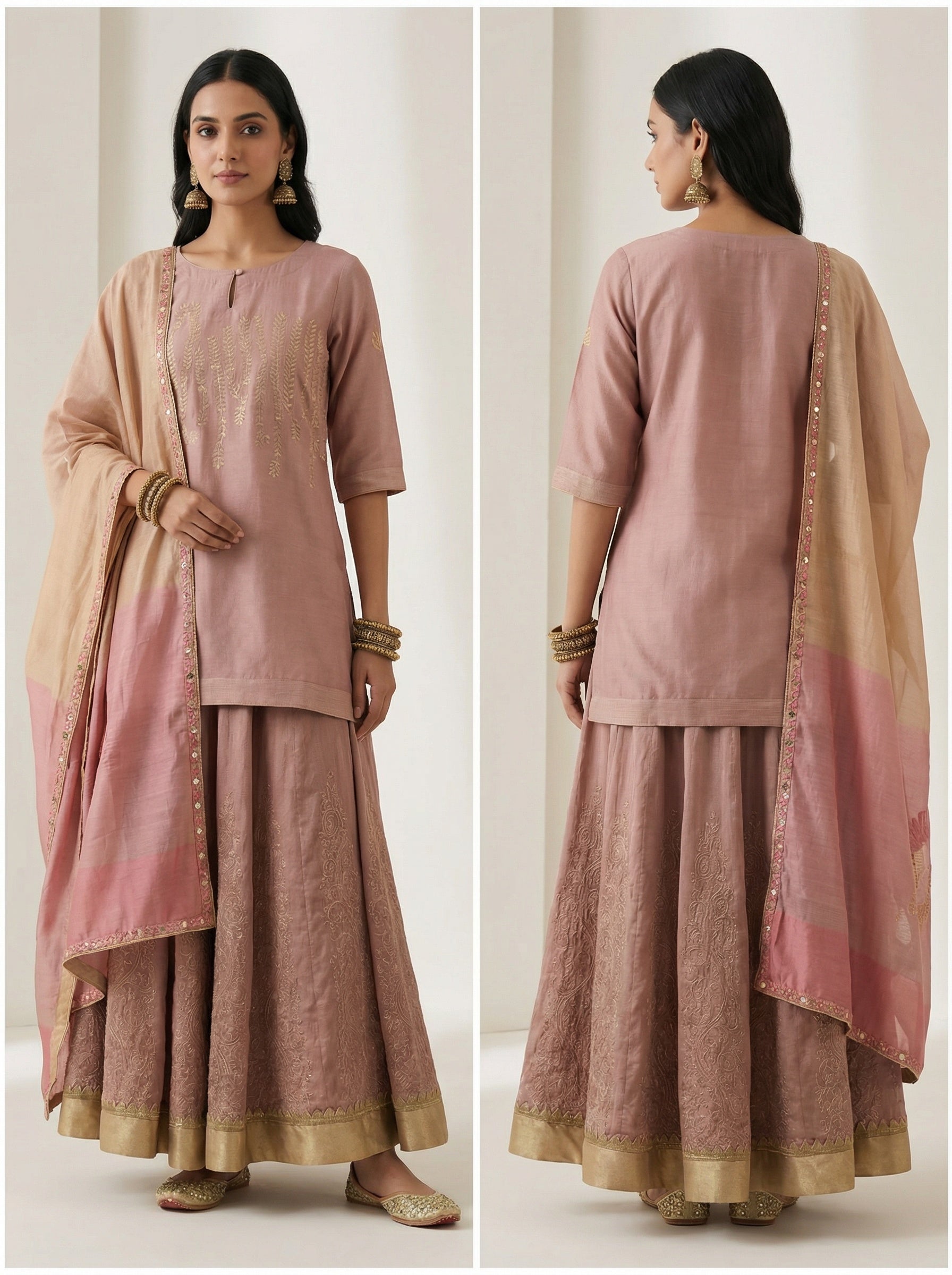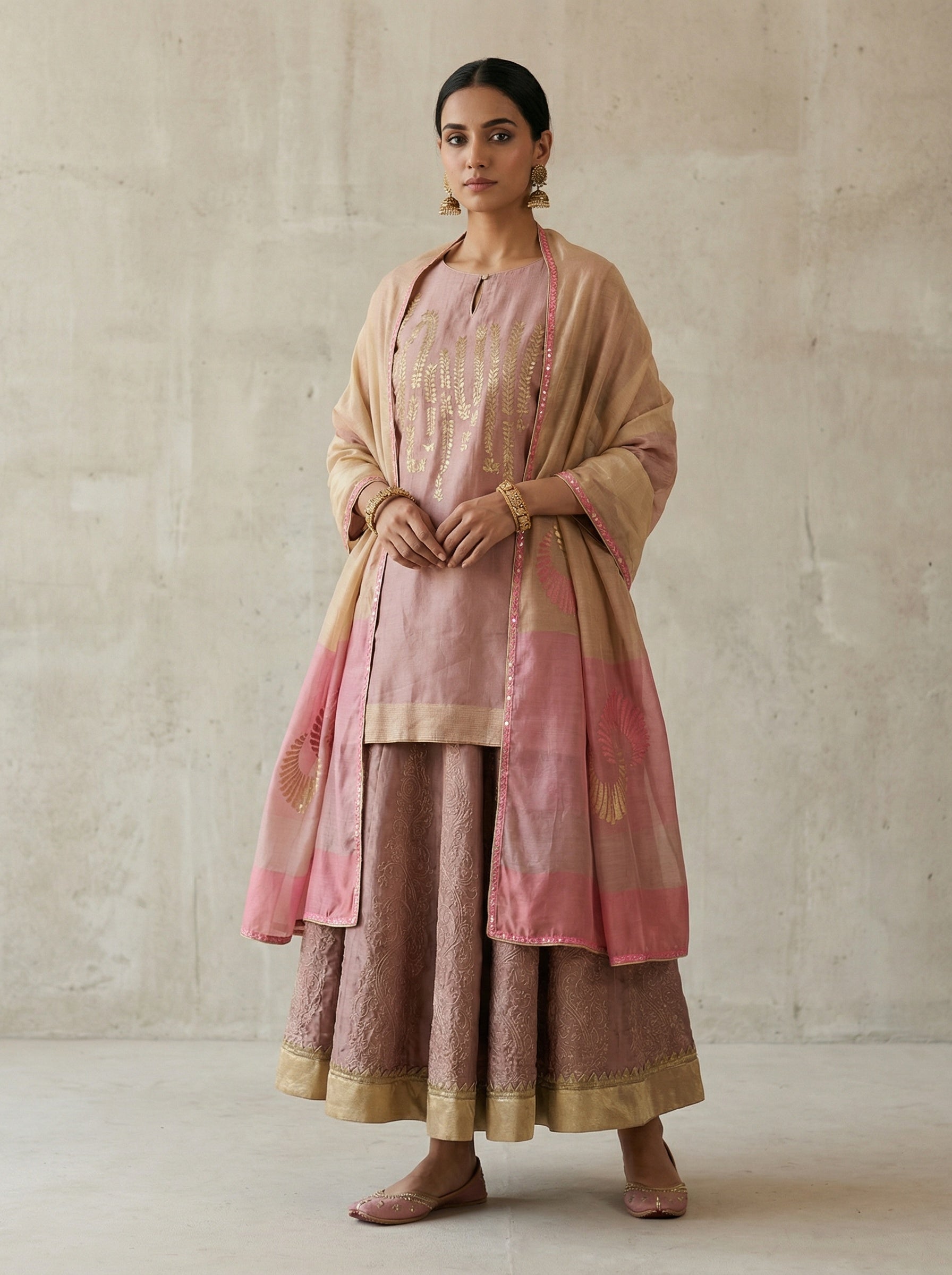A dusty rose traditional outfit featuring a straight-cut short waist-length kurti with elbow-length sleeves and subtle golden embroidery, paired with a flared ankle-length skirt adorned with intricate golden threadwork and a wide gold border, adorned with matching dupatta decorated with hand embroidered borders on both sides