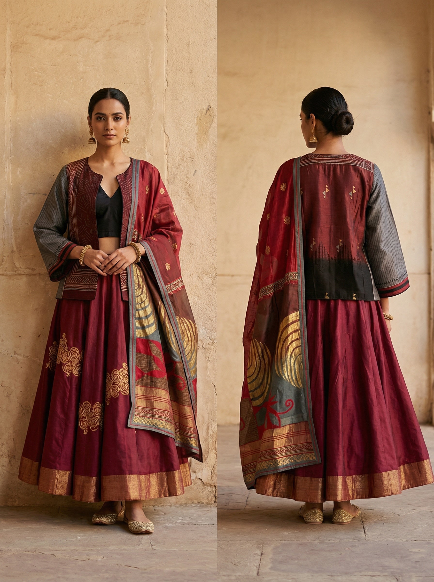 A dusty rose traditional outfit featuring a straight-cut short waist-length kurti with elbow-length sleeves and subtle golden embroidery, paired with a flared ankle-length skirt adorned with intricate golden threadwork and a wide gold border, adorned with matching dupatta decorated with hand embroidered borders on both sides