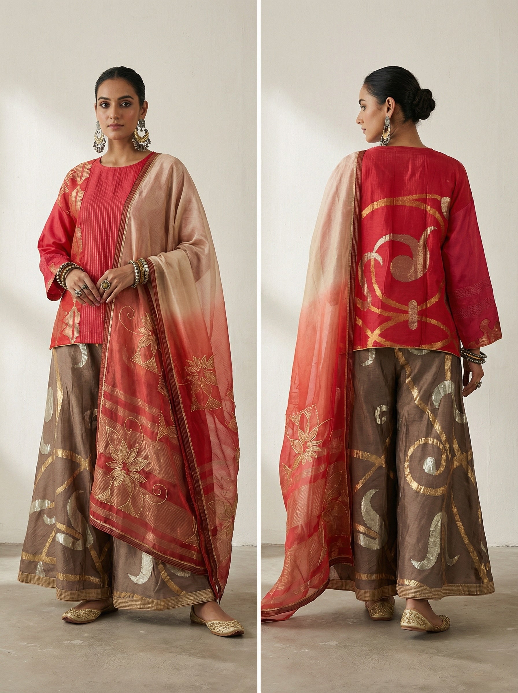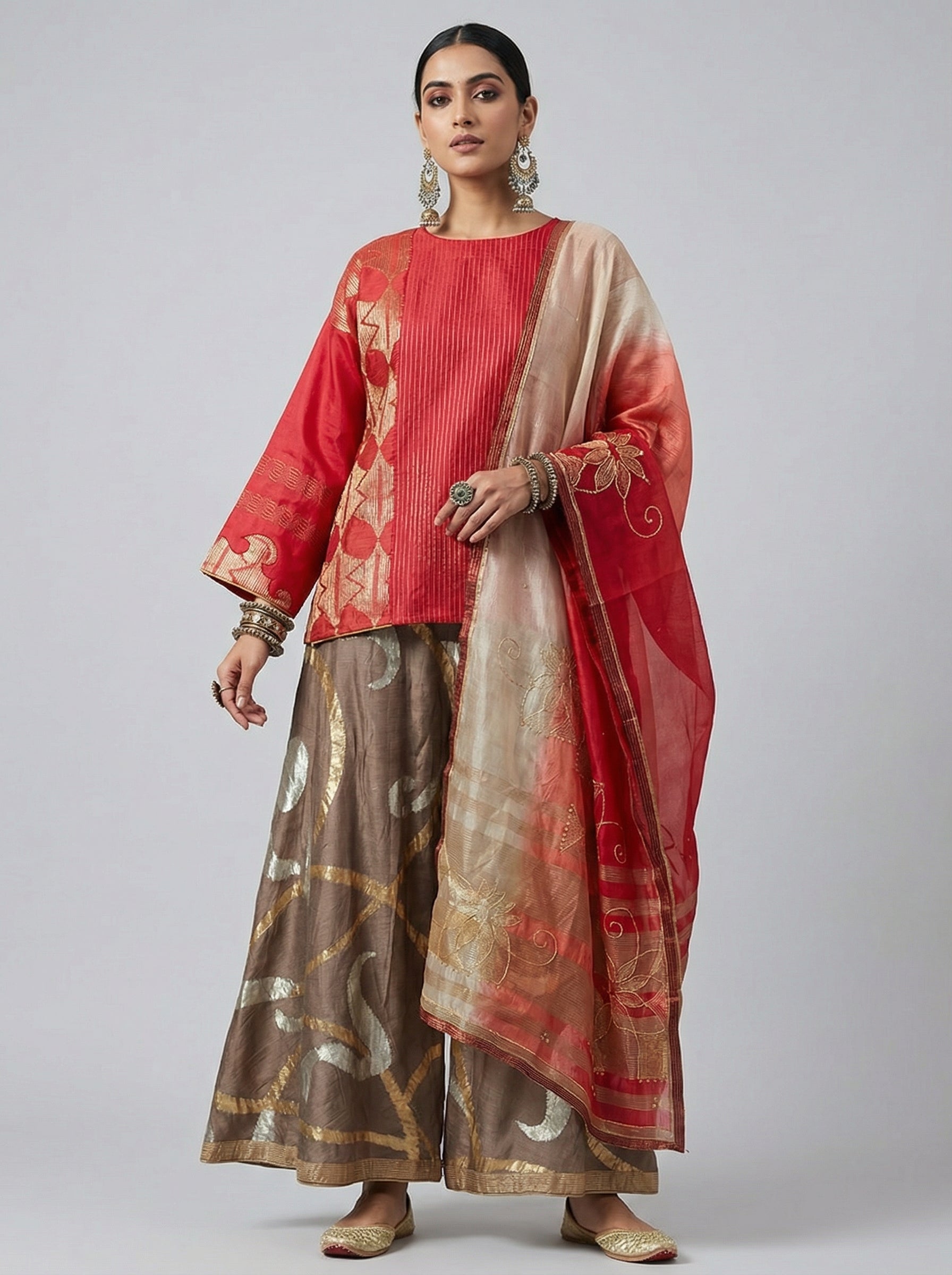 A coordinated traditional set featuring wide-leg brown silk palazzo pants with gold and silver abstract foil patterns going all around the plazzo and structured hem, paired with a bold red silk blouse with gold woven detailing on front side panels and vertical pin stripe texture in the narrow central panel with wide sleeves and back metallic motifs, styled with a sheer organza ombré dupatta fading from light beige to coral red to deep red along the length of the dupatta with large gold floral embroidery