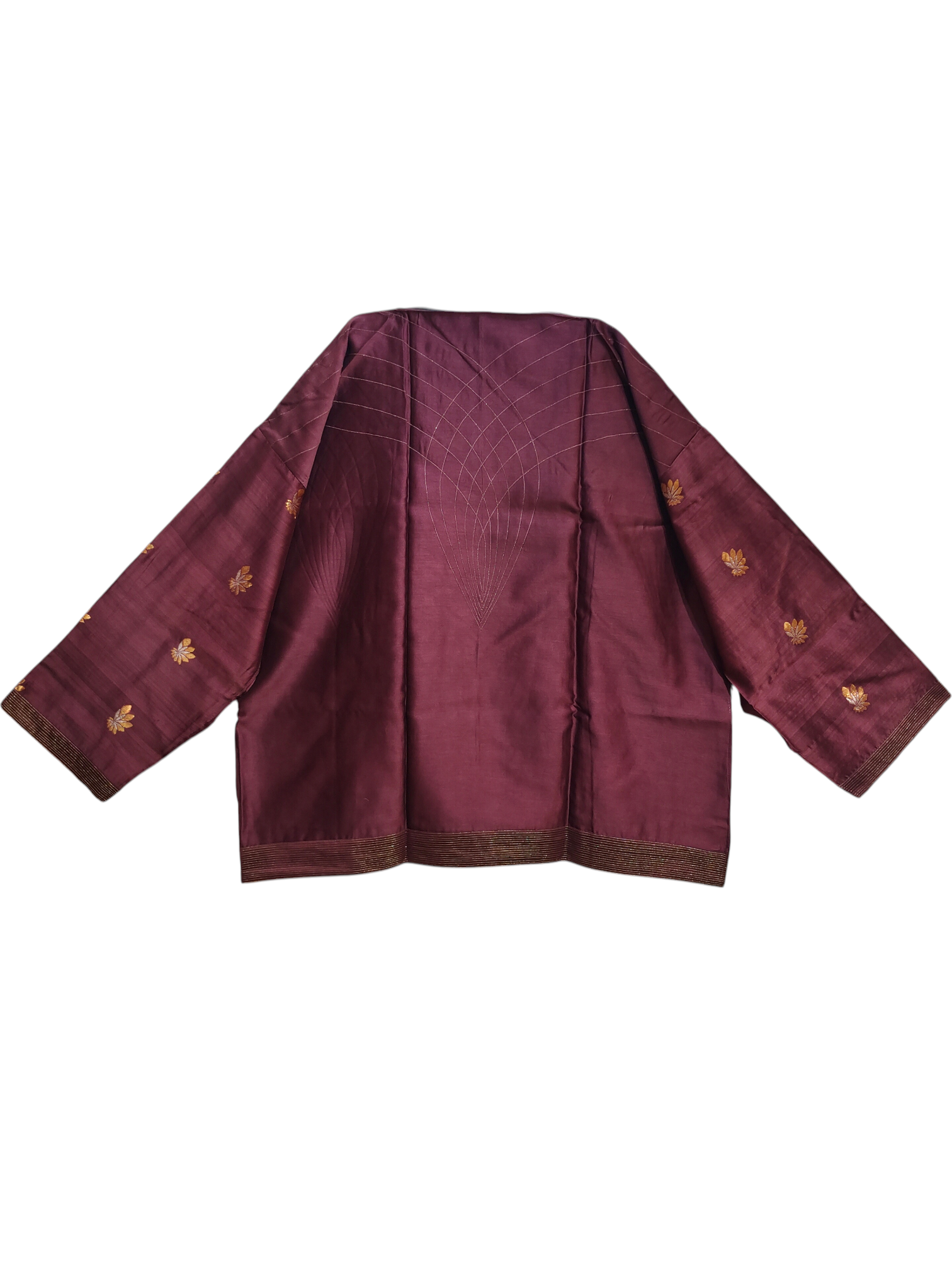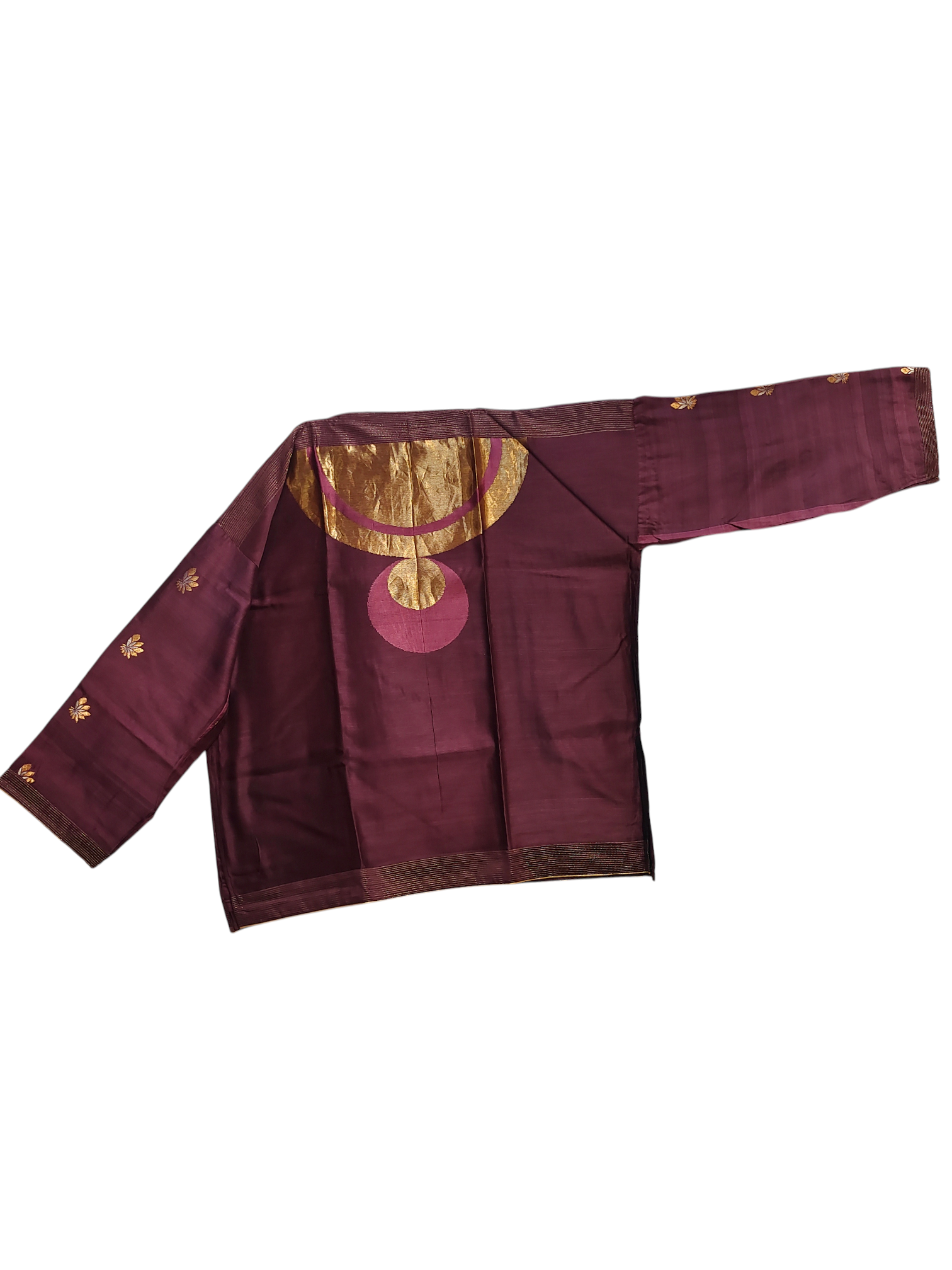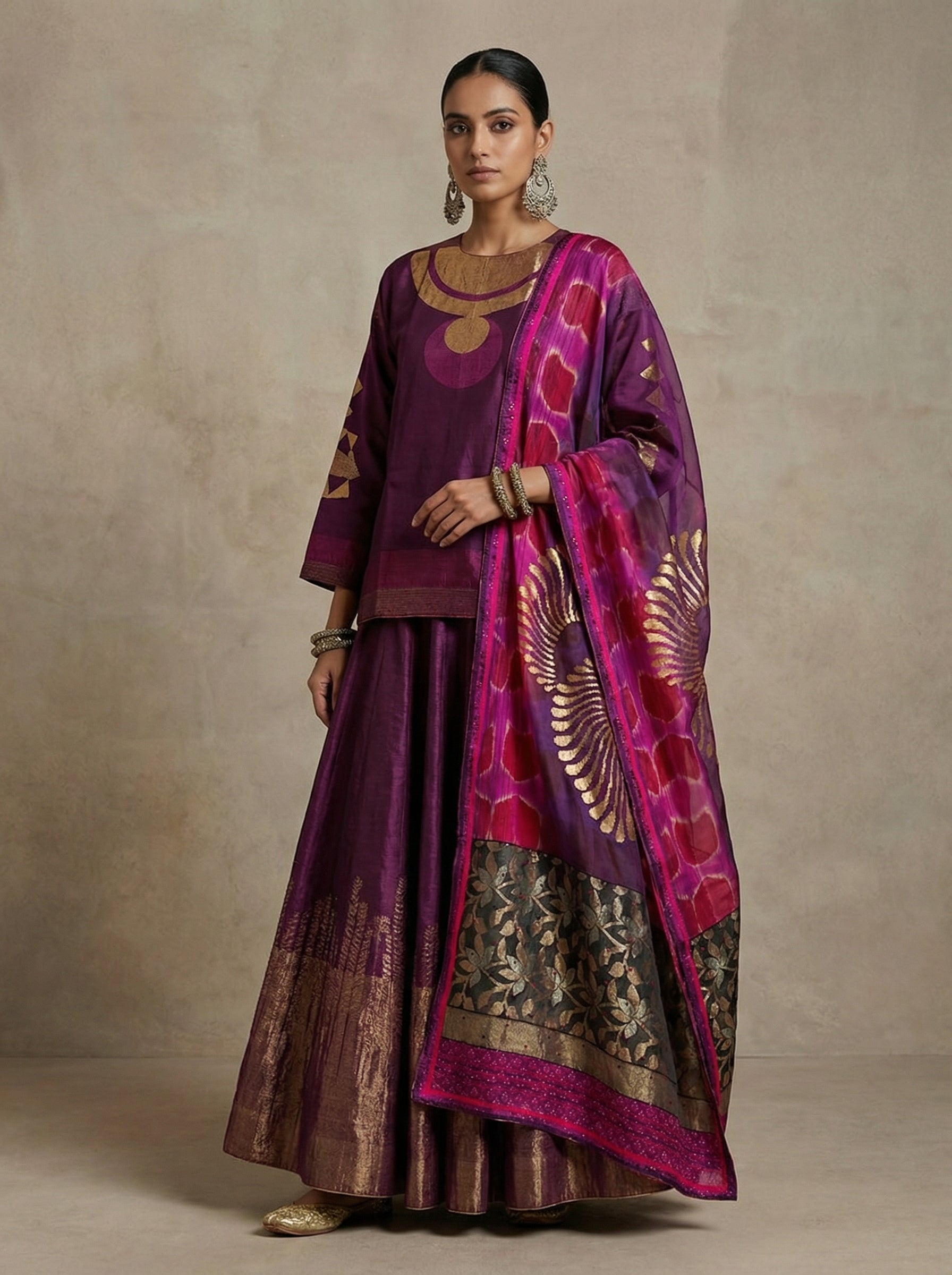 a high-waisted, ankle-length flared skirt in deep plum silk with gold intricate woven patterns around the bottom hem, paired with a matching short waist length tunic adorned with gold geometrical motifs on the sleeves and semicircle gold weaving design motif on the front, and textured curvy patttern on the backside styled with 1 side on shoulder with a sheer magenta and violet dupatta detailed with radiant gold central single radial motif and a metallic floral brocade hem on black base on both sides as pallu