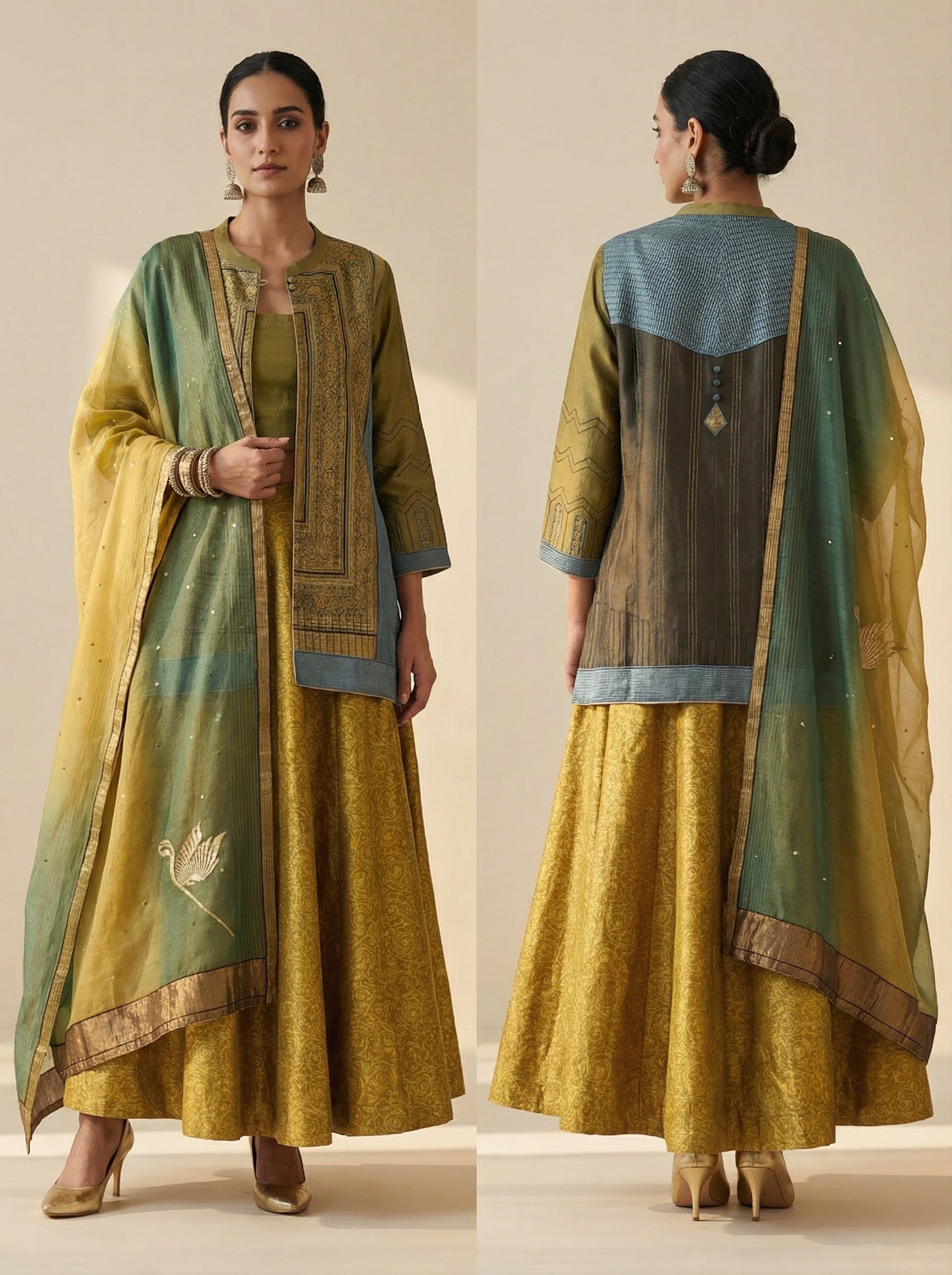 A flowing ankle-length dark teal green silk skirt adorned with metallic gold polka dot motifs, paired with a structured mid-thigh length jacket-style blouse featuring olive green sleeves and a front panel in blue and gold brocade, accompanied with a contrasting teal tube inner completed with a sheer ombré dupatta transitioning from deep teal to beige with a subtle embroidered flamingo motif and metallic gold border