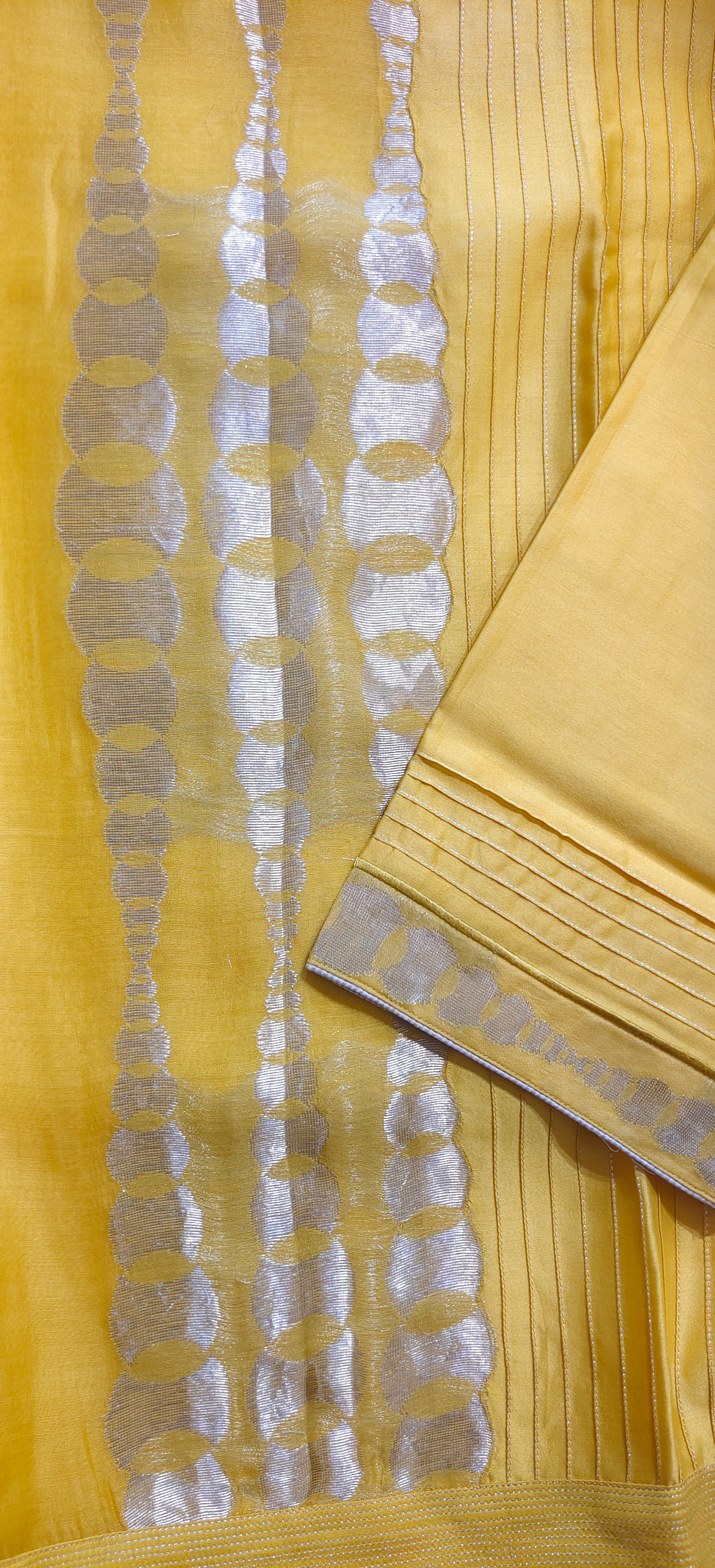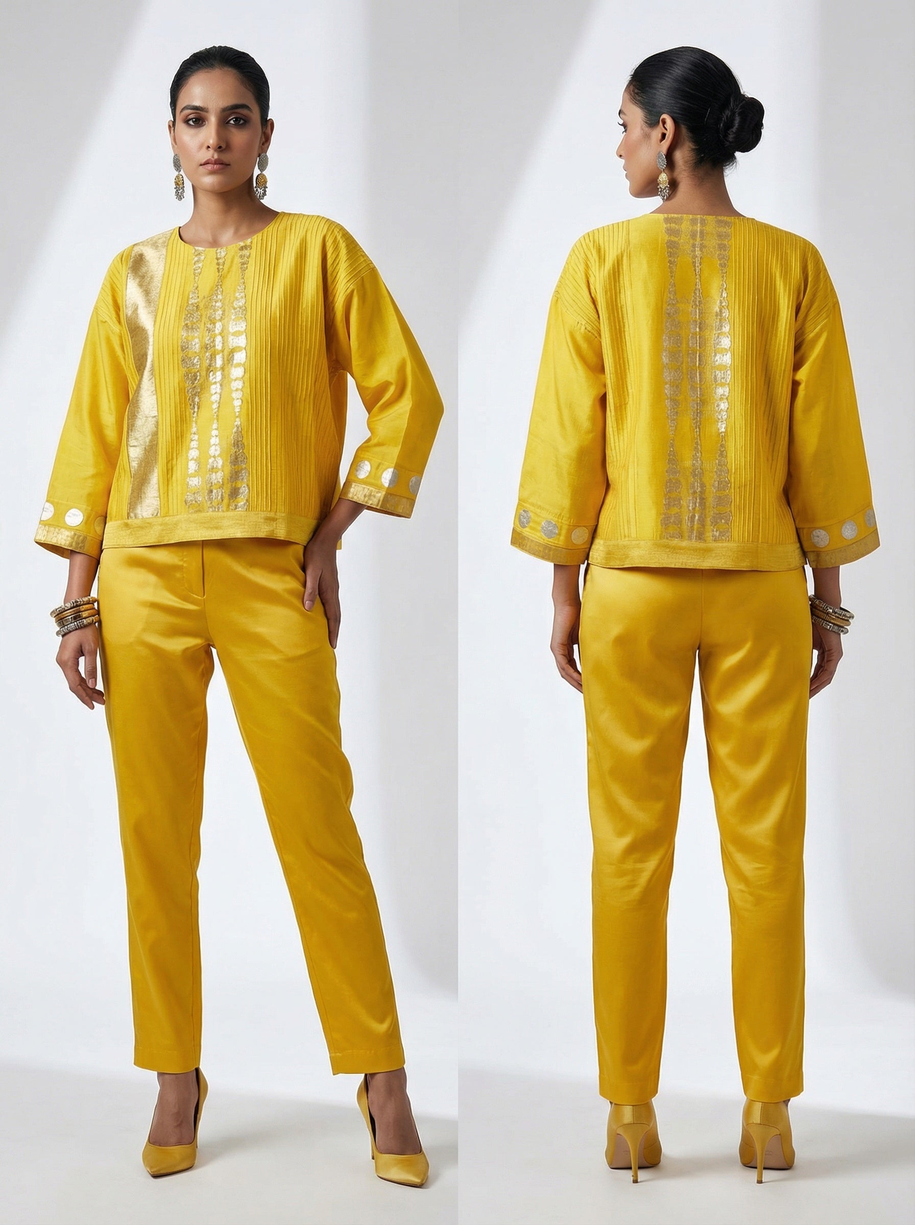 A structured cropped waist length yellow silk tunic with three-quarter-length sleeves, vertical pin-tuck detailing, metallic silver panel on one side, and central silver-gold embroidered sequin lines, finished with circular silver accents at the cuffs can be worn with matching solid colour satin trouser pants, silver oxidised jewellery in earrings and bangles, golden matching heel sandles.The tunic has a very exquisite formal appeal and can be coordinated with trousers for a contemporary modern aesthetic look.
