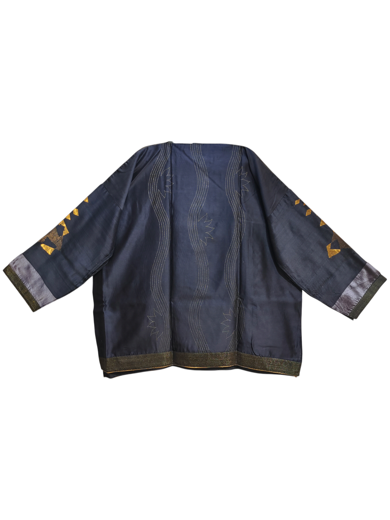 A loose-fit traditional chanderi tunic in deep midnight navy with metallic gold and lavender foil detailing, featuring wide structured sleeves, intricate gold motifs on the front and arms, and a rich gold hem,