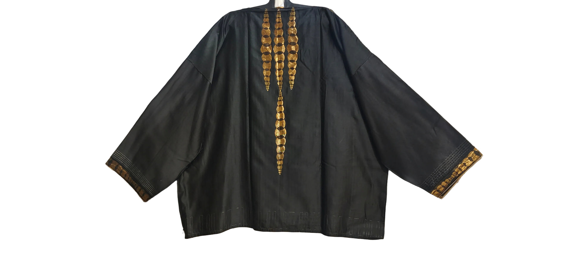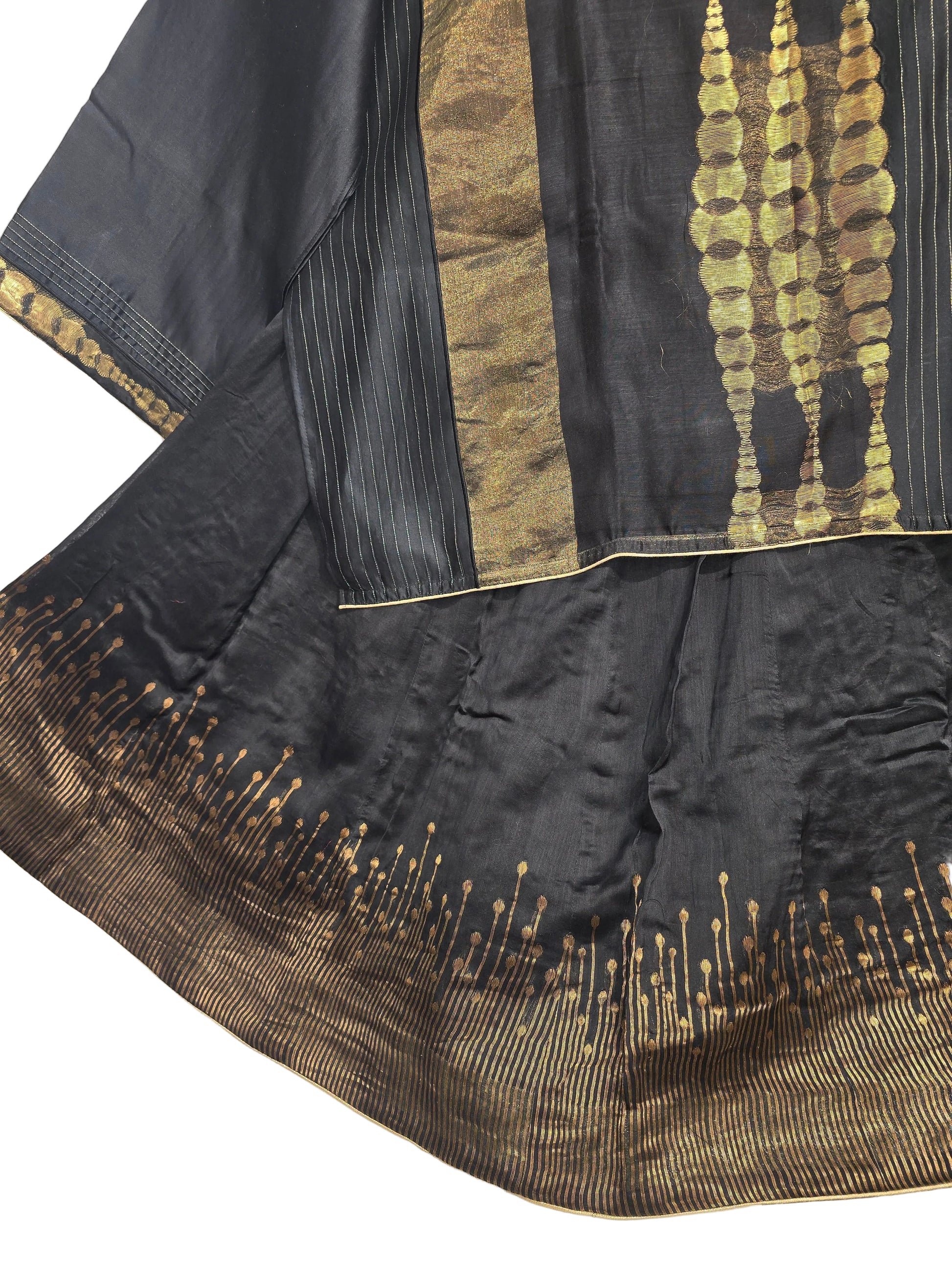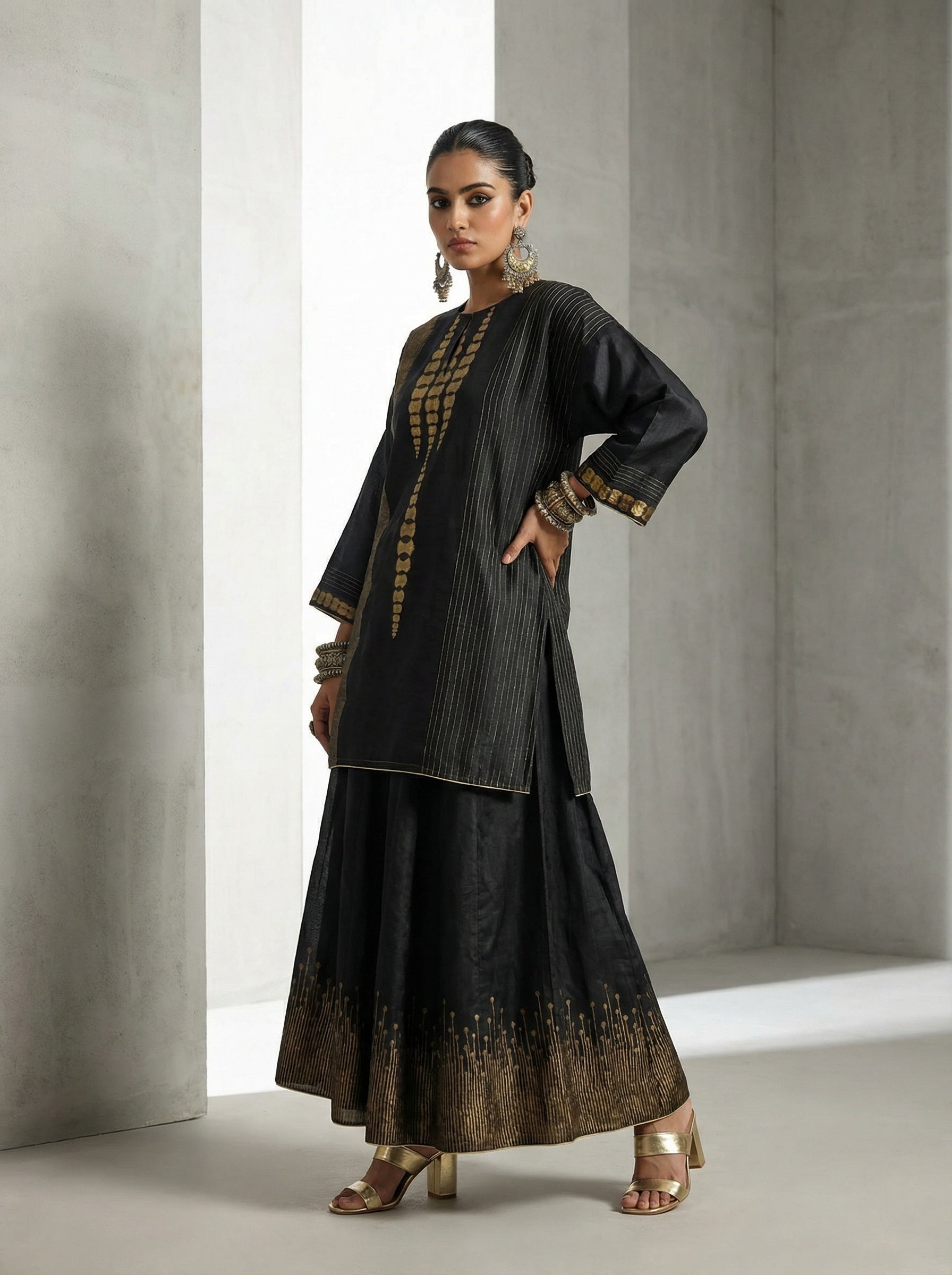 A black three-piece Indian ethnic set featuring a waist-length A-line kurta with vertical gold zari stripes and abstract golden tie-dye panel, wide straight sleeves with metallic borders, paired with a flared black silk skirt showcasing intricate gold thread embroidery at the hem, and a sheer black dupatta with gold polka dots, zari trim, and tassels, styled in the manner of a luxurious Indian festive couture editorial, clean minimal fashion product photo, fashion artsy pose