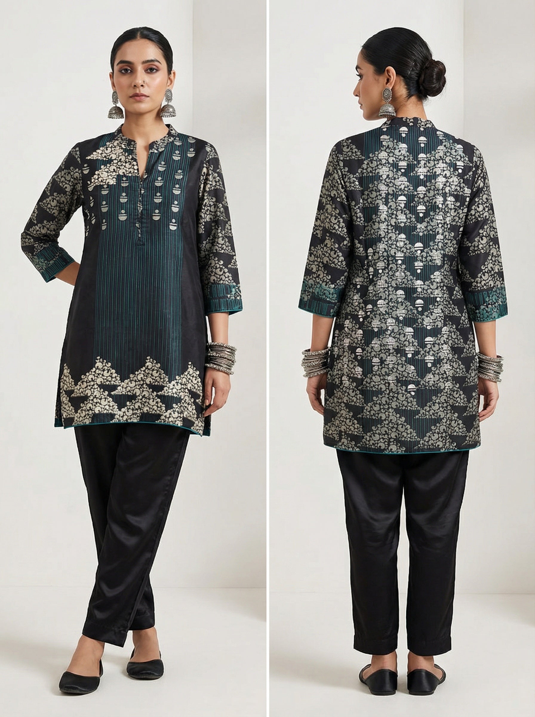 A upper waist-length short black kurta with teal vertical pinstripes and off-white abstract floral and geometric block prints forming triangular patterns across the body, cuffs, and hemline, featuring a split neckline and three-quarter sleeves with teal striped accents