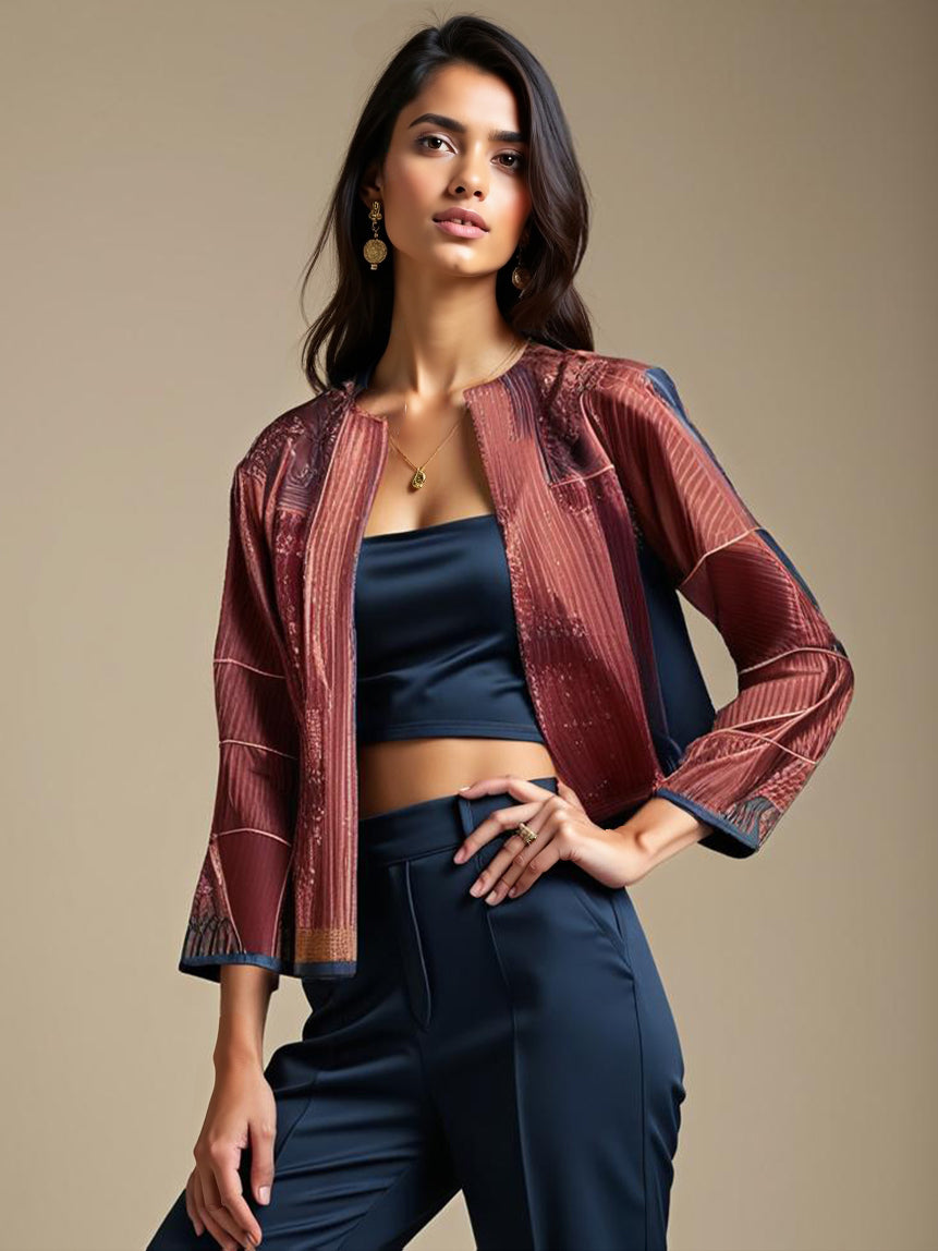 This exquisite stitched jacket is designed in textured stripe chanderi with gold stitch lines in the front with ajrakh silk accents in the shoulder armhole region and zig zag stitchlines in the sleeves and back bottom ghera .The blouse has a very unique formal appeal and can be coordinated with trousers as well for a indo western look.