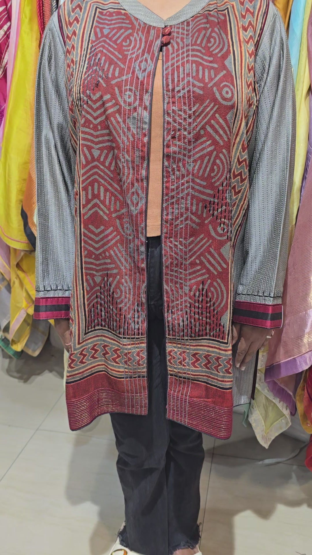 This exquisite Semistitched short jacket is designed in textured chanderi with a unique ajrakh panels in the front with ajrakh silk accents in the sleeve armhole region and back bottom ghera .The jacket has a very unique formal appeal and can be coordinated with trousers as well for a indo western look.