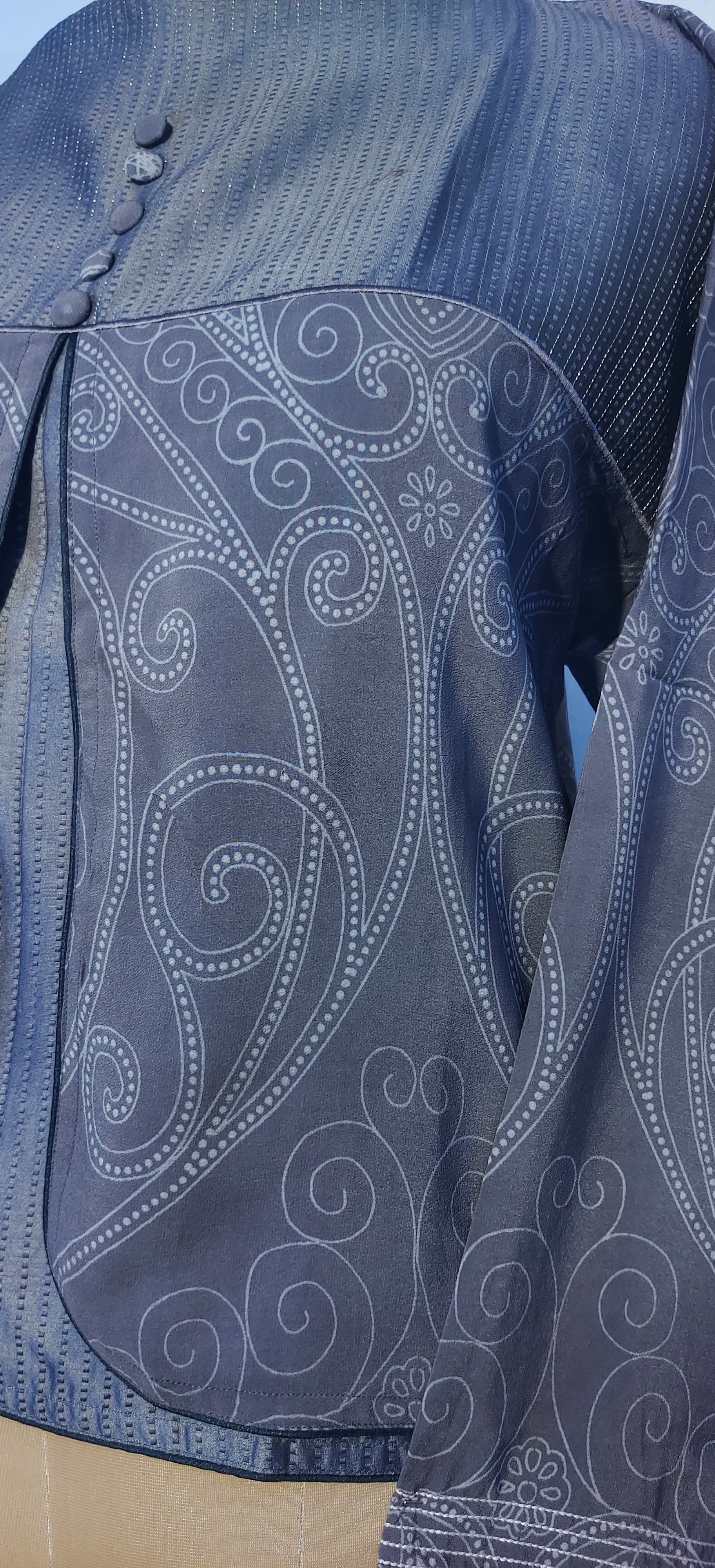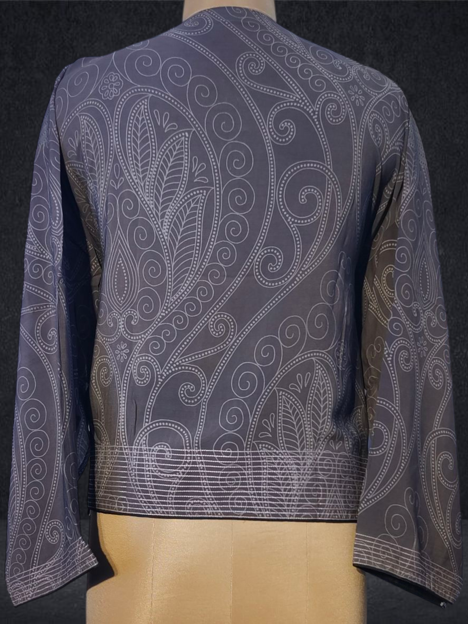The short blouse can be styled in various ways and shortened to the desired length as there is no neckline given. The blouse length is 22", with 25" width as a one-side ghera and sleeves at 20".These measurements are very flexible and can be reduced as per the required sizeset.