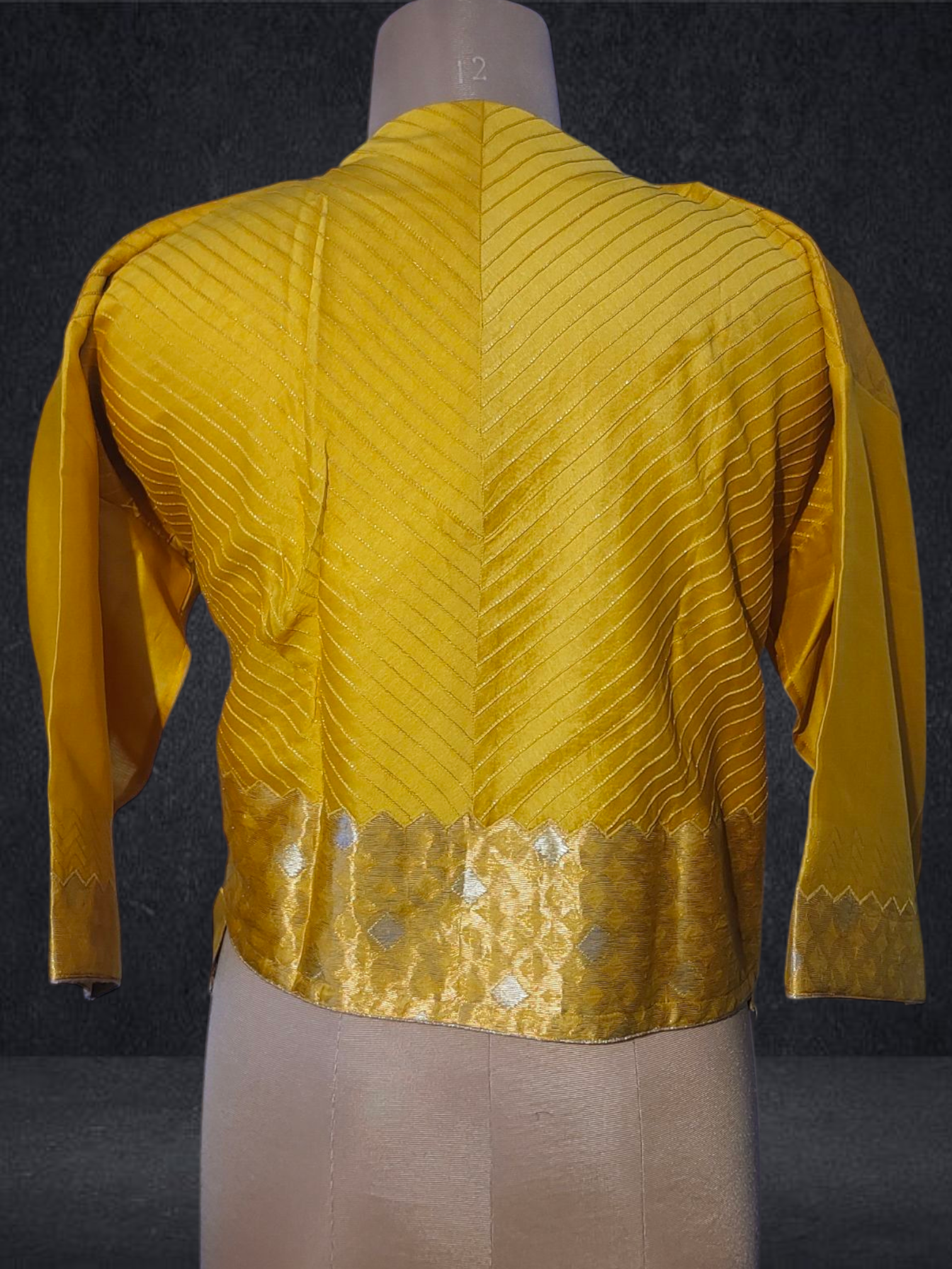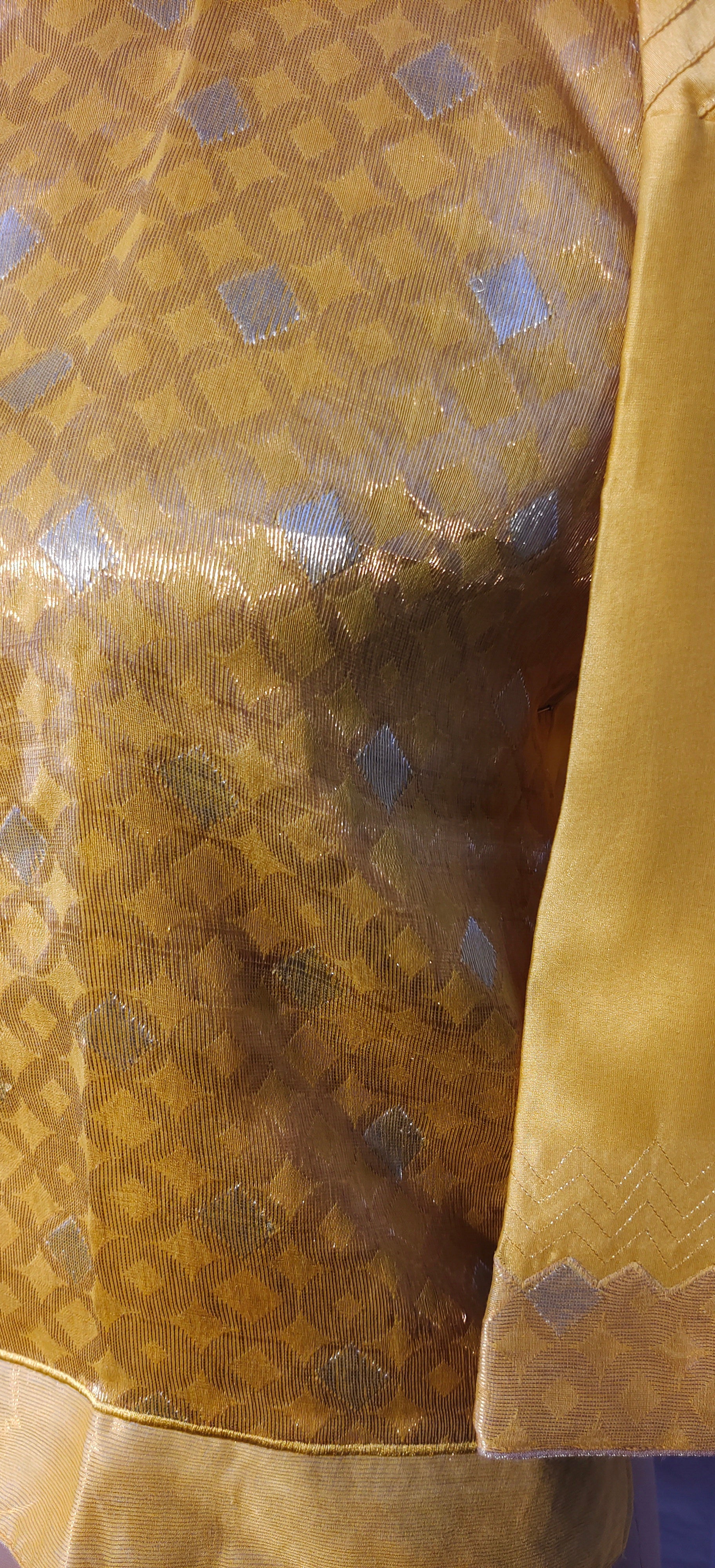 This exquisite Semistitched blouse is designed with beautiful handloom woven zari in jewel mughal design on chanderi with embroidery filling up the whole of gold tissue sleeves in an extraordinary jaal pattern in floral theme. Either side can be made as front depending upon the purpose, whether to be used with a saree or with a dhoti pant or skirts .The short blouse has a very unique formal appeal and can be coordinated with trousers for a indo western look.