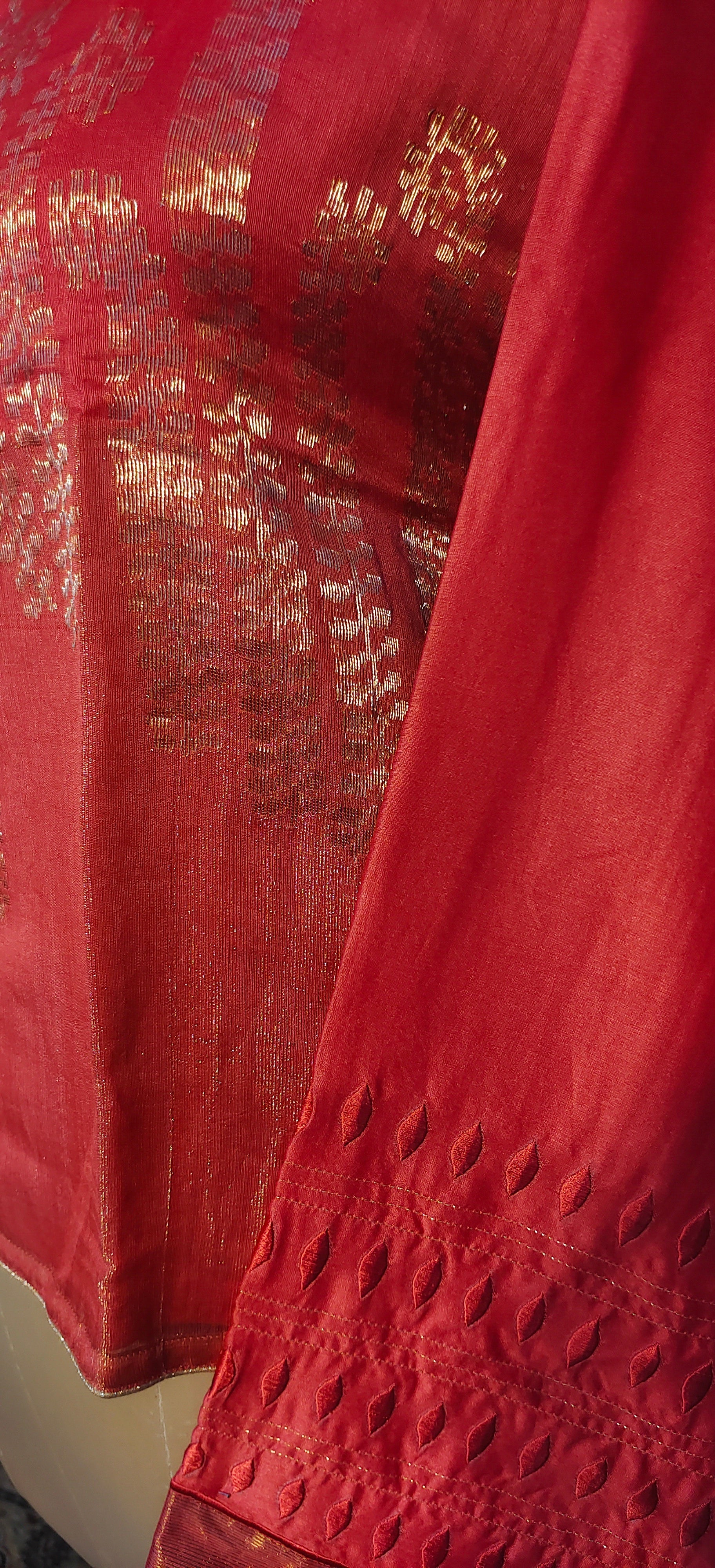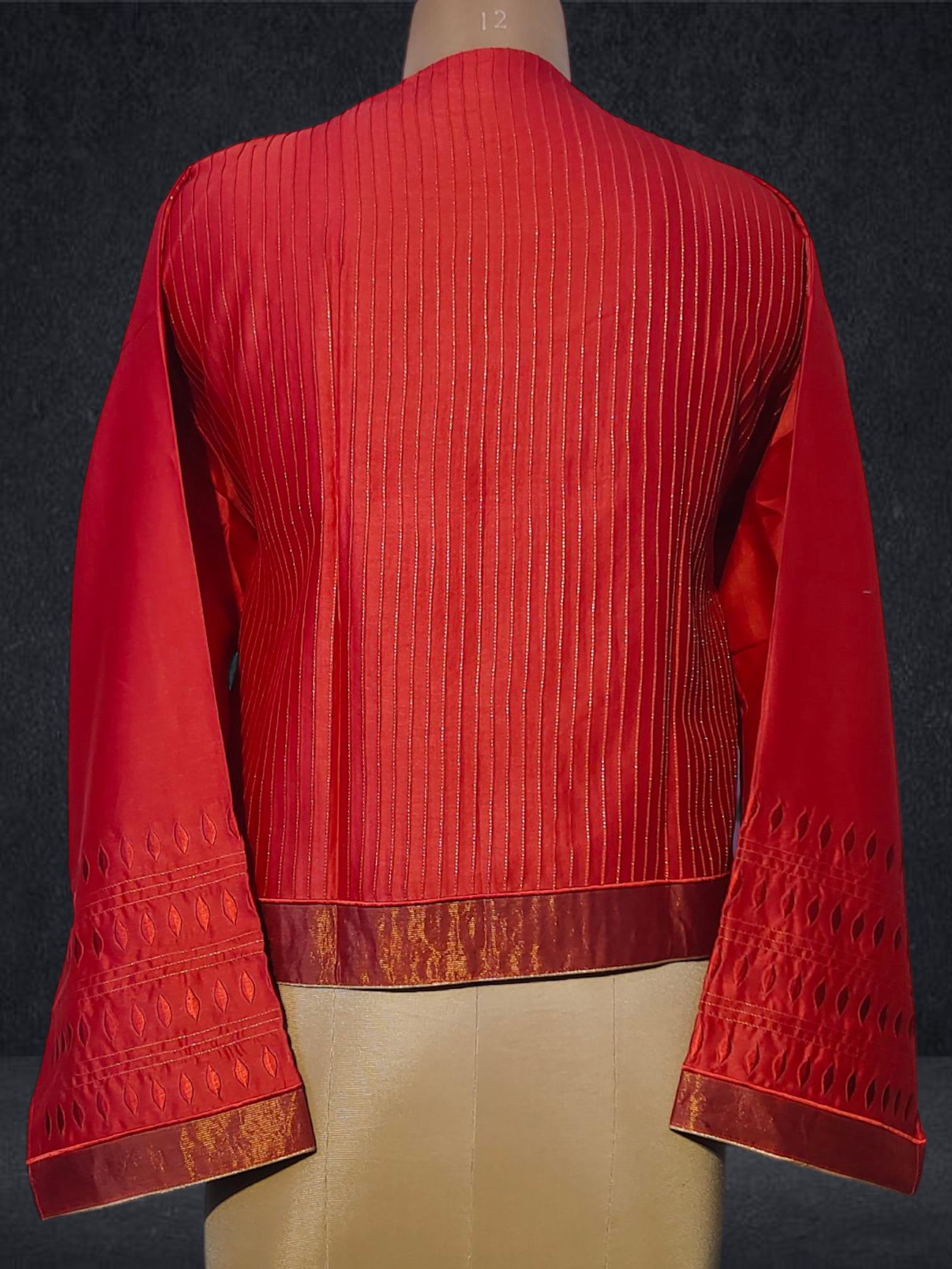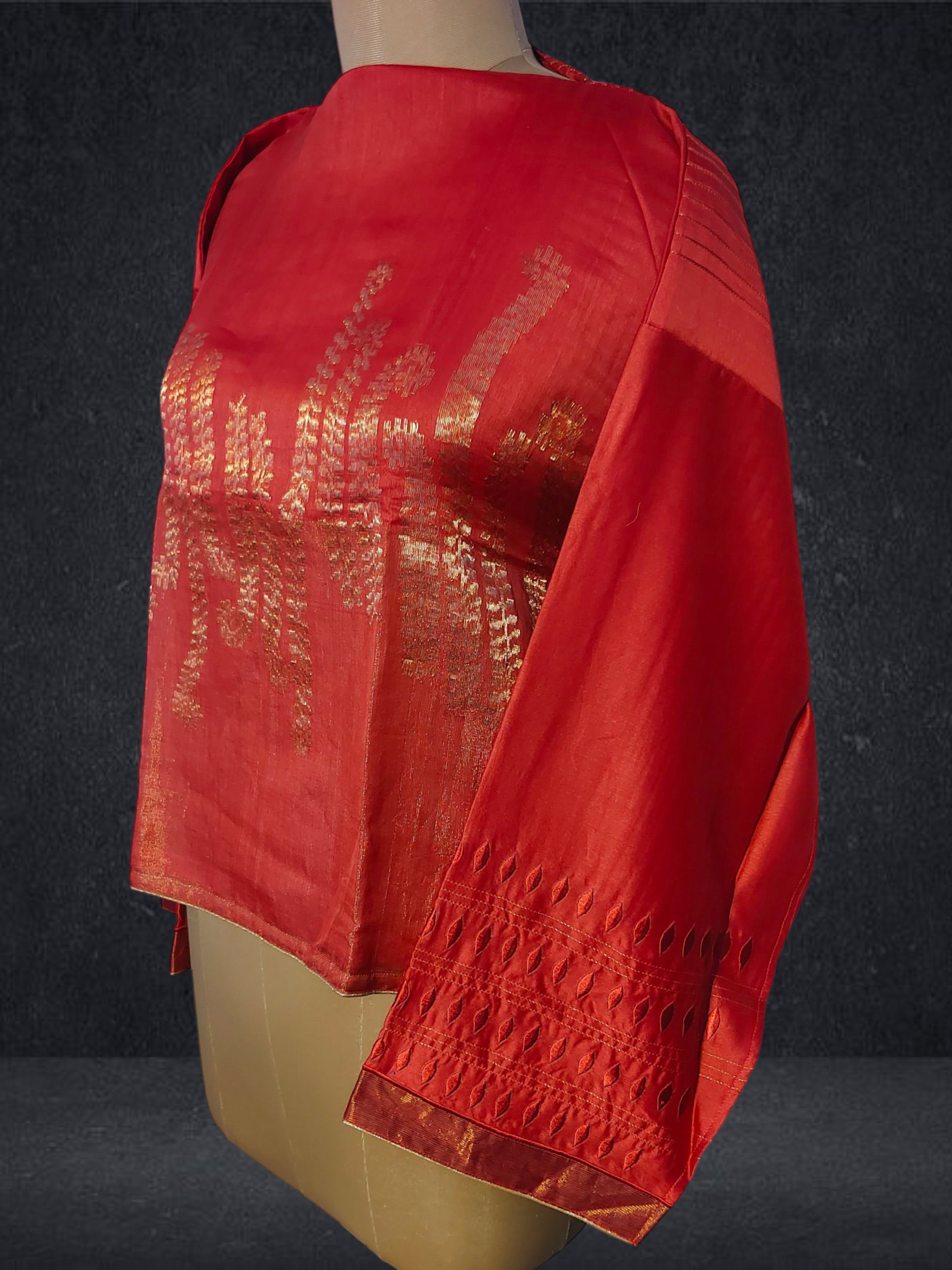 This exquisite Semistitched blouse is designed with beautiful handloom woven zari in jewel mughal design on chanderi with embroidery filling up the whole of gold tissue sleeves in an extraordinary jaal pattern in floral theme. Either side can be made as front depending upon the purpose, whether to be used with a saree or with a dhoti pant or skirts .The short blouse has a very unique formal appeal and can be coordinated with trousers for a indo western look.