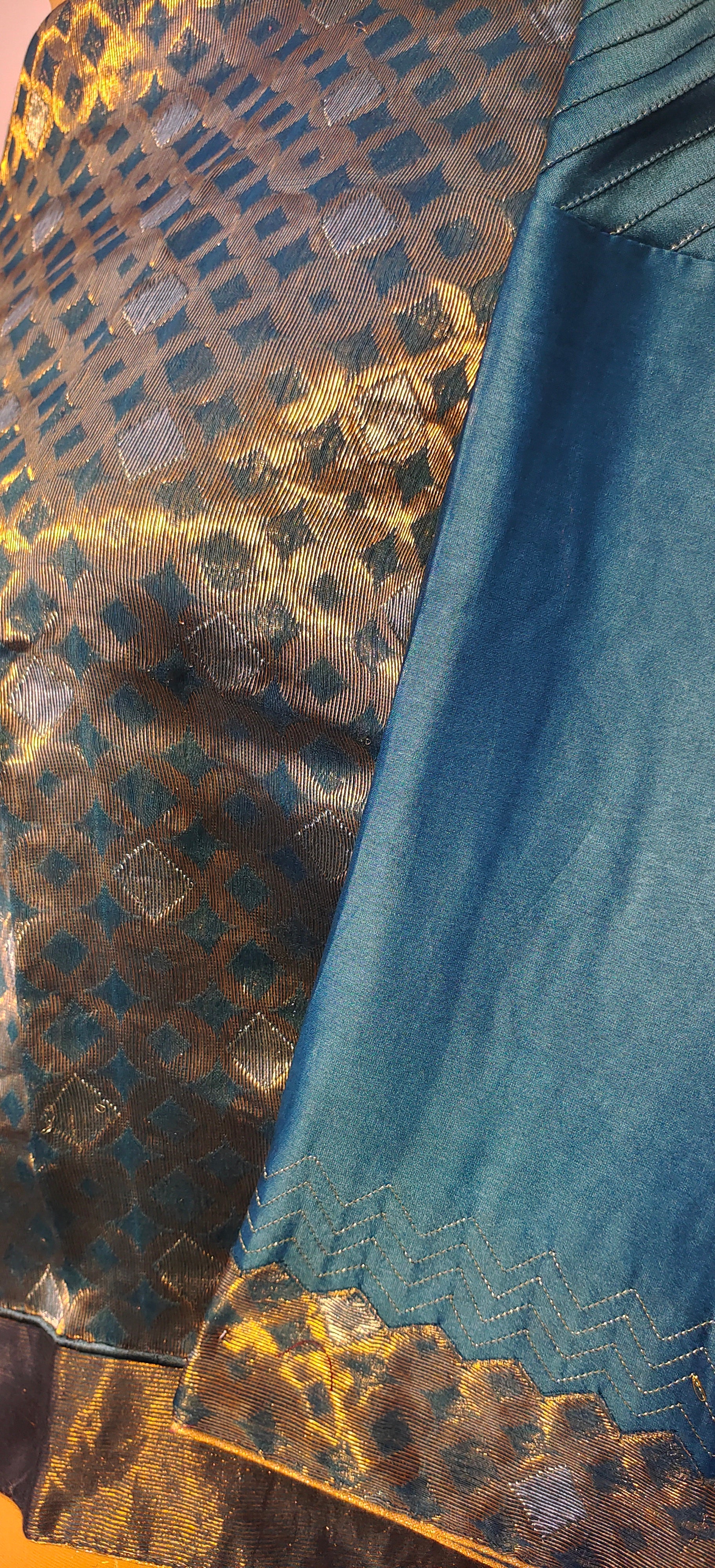 This exquisite Semistitched blouse is designed with beautiful handloom woven zari in jewel mughal design on chanderi with embroidery filling up the whole of gold tissue sleeves in an extraordinary jaal pattern in floral theme. Either side can be made as front depending upon the purpose, whether to be used with a saree or with a dhoti pant or skirts .The short blouse has a very unique formal appeal and can be coordinated with trousers for a indo western look.