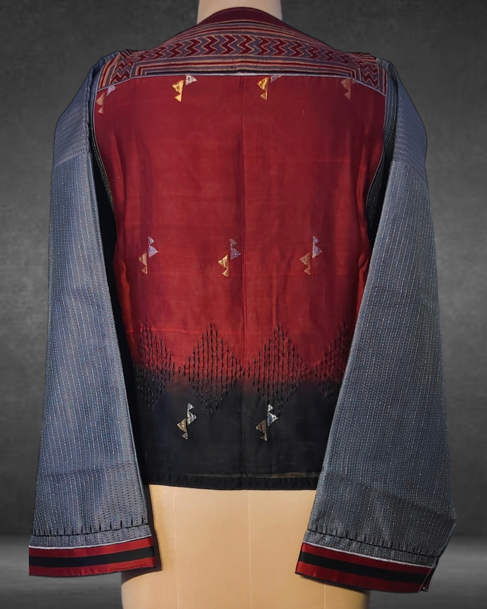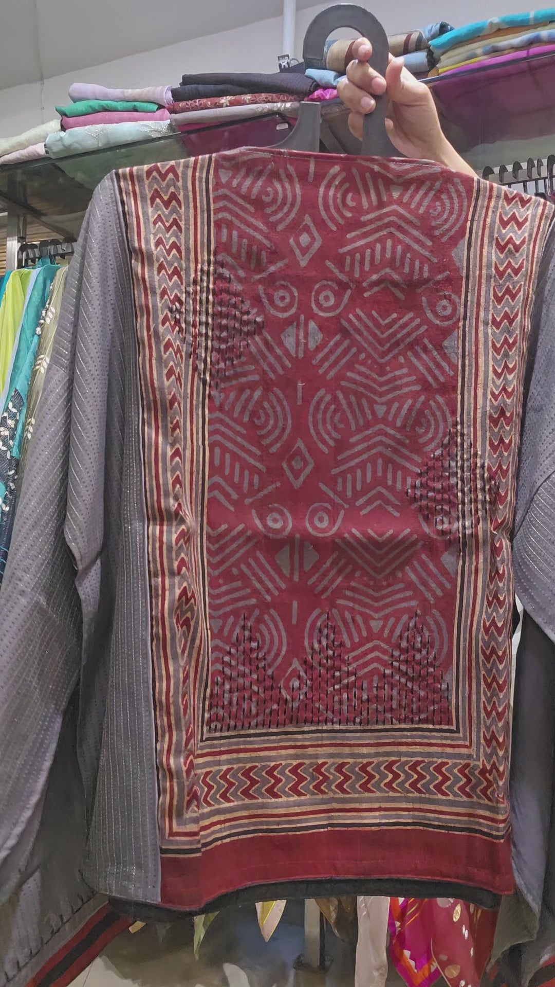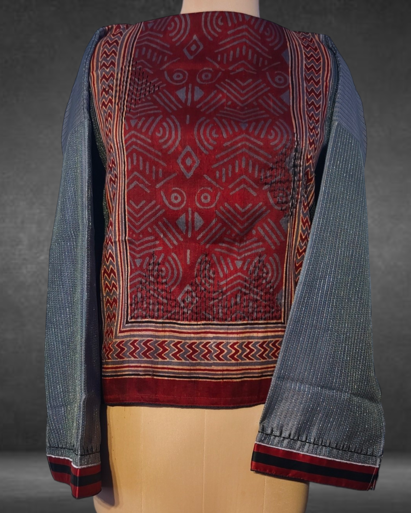 This exquisite Semistitched Kurta designed in textured stripe chanderi with gold stitch lines in the front and silk ajrakh printed panels and textured effect in the sleeves and back bottom ghera .The short tunic has a very unique formal appeal and can be coordinated with trousers for a indo western look.