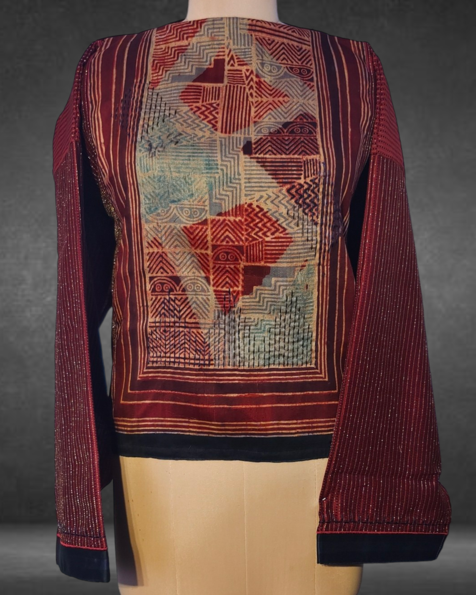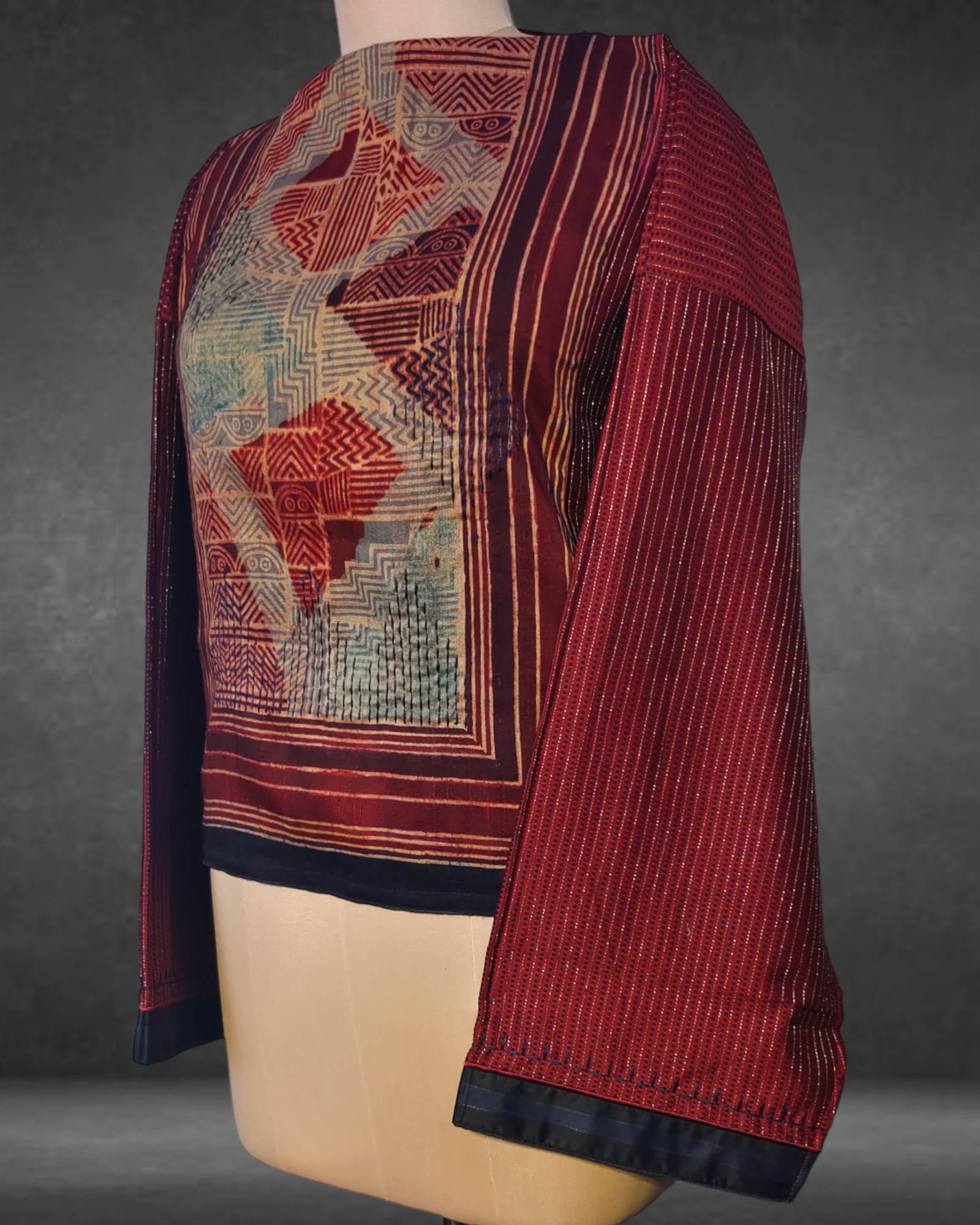 The short kurta can be styled in various ways and shortened to the desired length as there is no neckline given. The tunic length is 24", with 30" width as a one-side ghera and sleeves at 20".These measurements are very flexible and can be reduced as per the required sizeset.