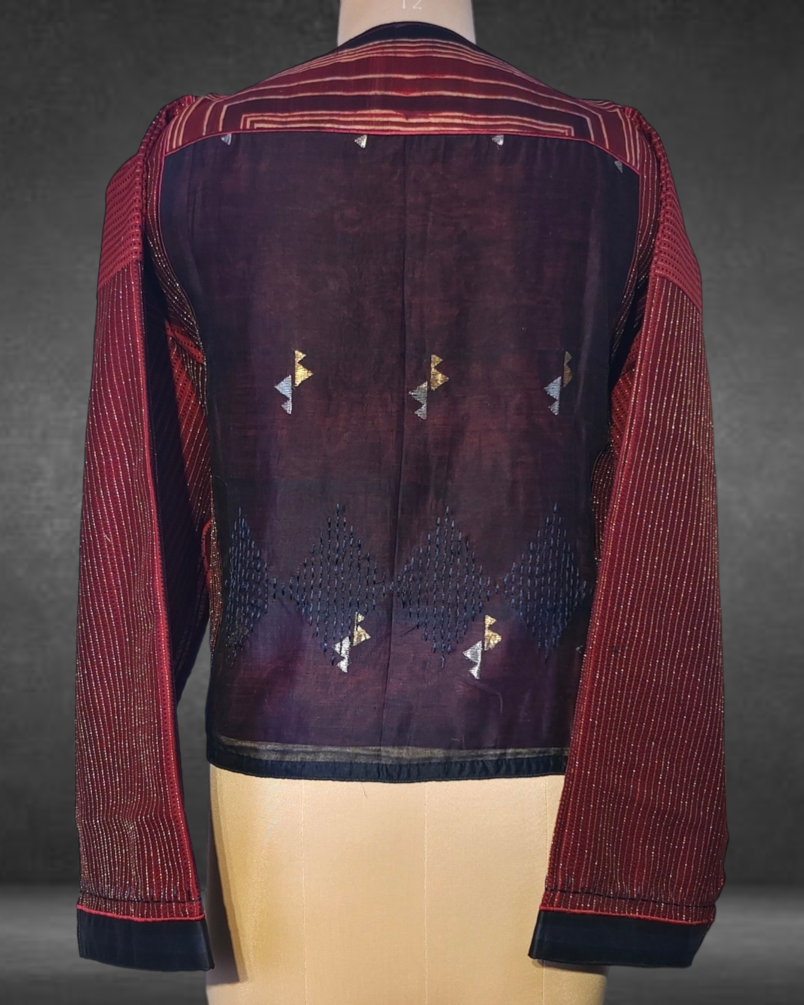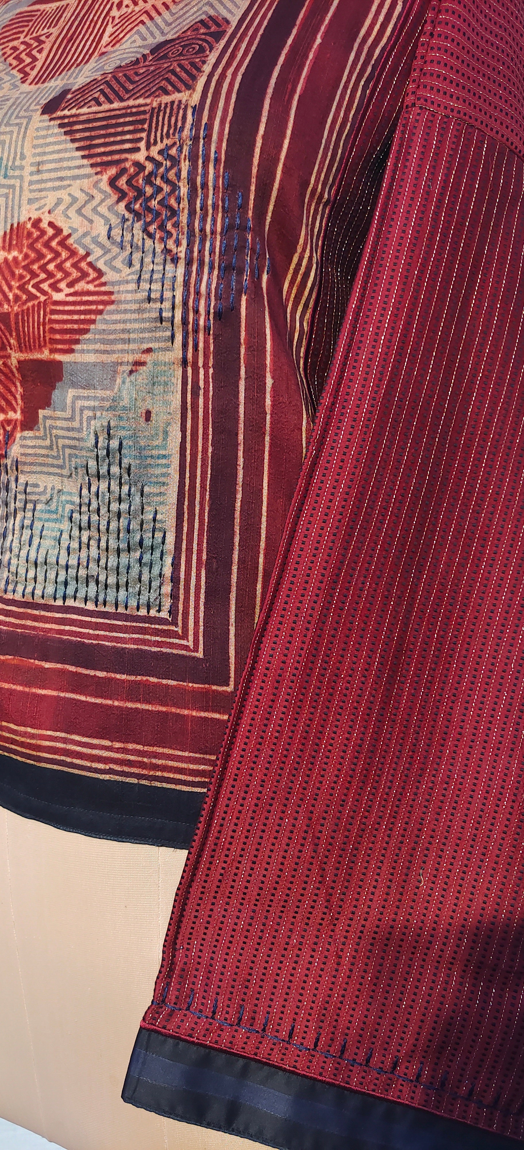 This exquisite Semistitched Kurta designed in textured stripe chanderi with gold stitch lines in the front and silk ajrakh printed panels and textured effect in the sleeves and back bottom ghera .The short tunic has a very unique formal appeal and can be coordinated with trousers for a indo western look.