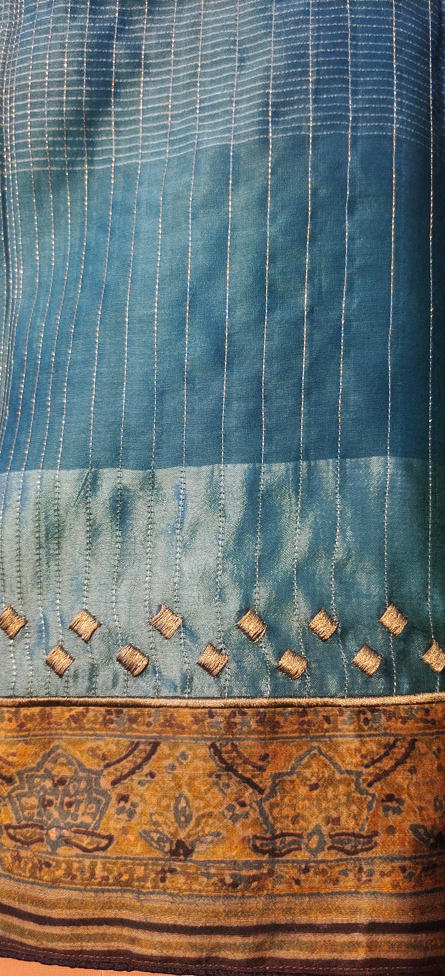 This exquisite Semistitched Kurta designed in textured stripe chanderi with gold stitch lines in the front and silk ajrakh printed panels and textured effect in the sleeves and back bottom ghera .The short tunic has a very unique formal appeal and can be coordinated with trousers for a indo western look.