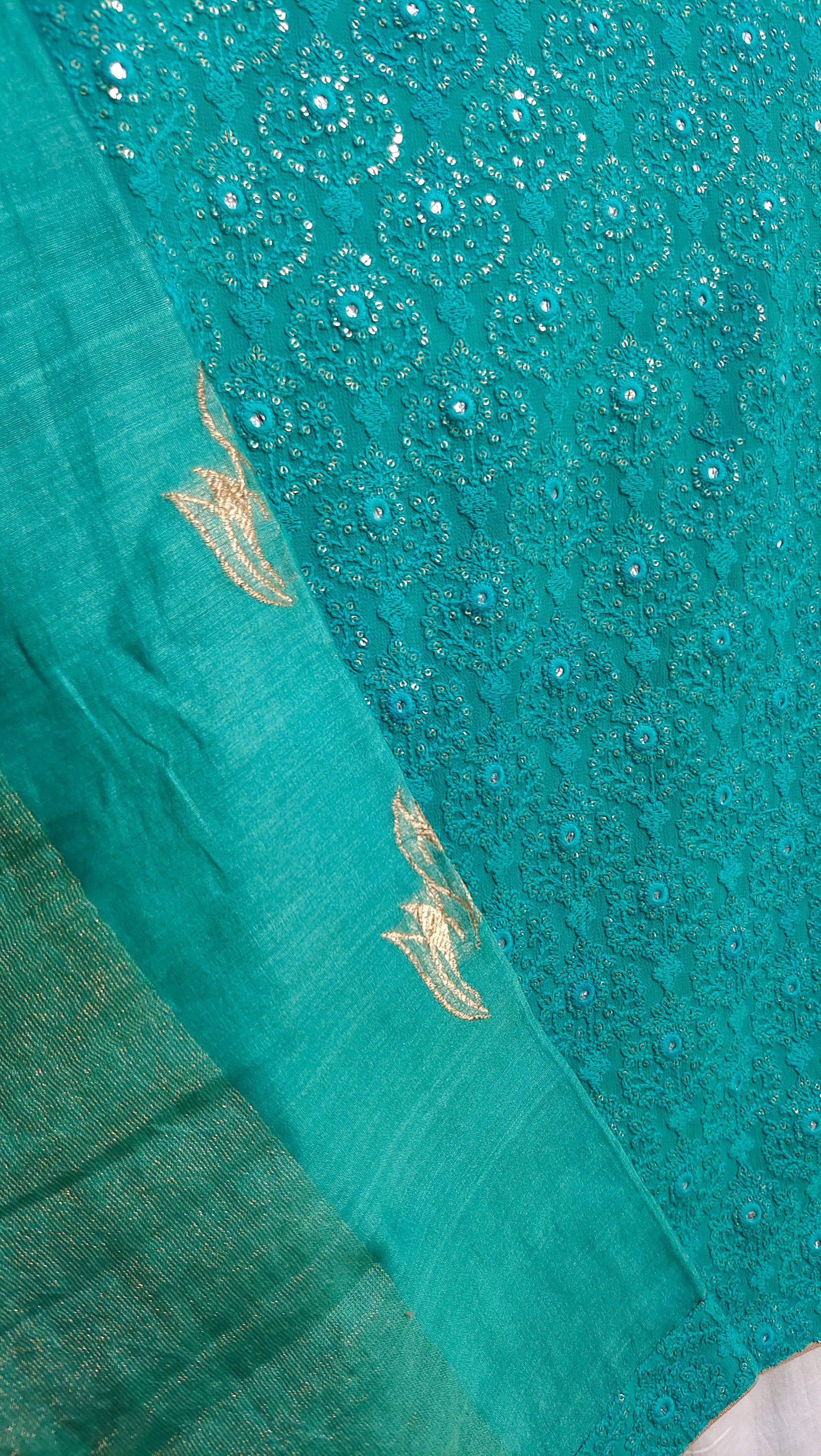 Rendered in a rich emerald tone, this upper waist length blouse captures understated opulence through its dense mukaish-inspired surface. The body is adorned with a delicate jaal of fine dotted embellishments, creating a soft shimmer that moves with light. Contrasted with smoother sleeves featuring subtle woven accents, the composition balances texture and fluidity. The silhouette remains clean and versatile, making it an elegant foundation for both statement and minimal styling. Designed as a semistitched blouse, it allows tailored precision while retaining a refined handcrafted aesthetic.