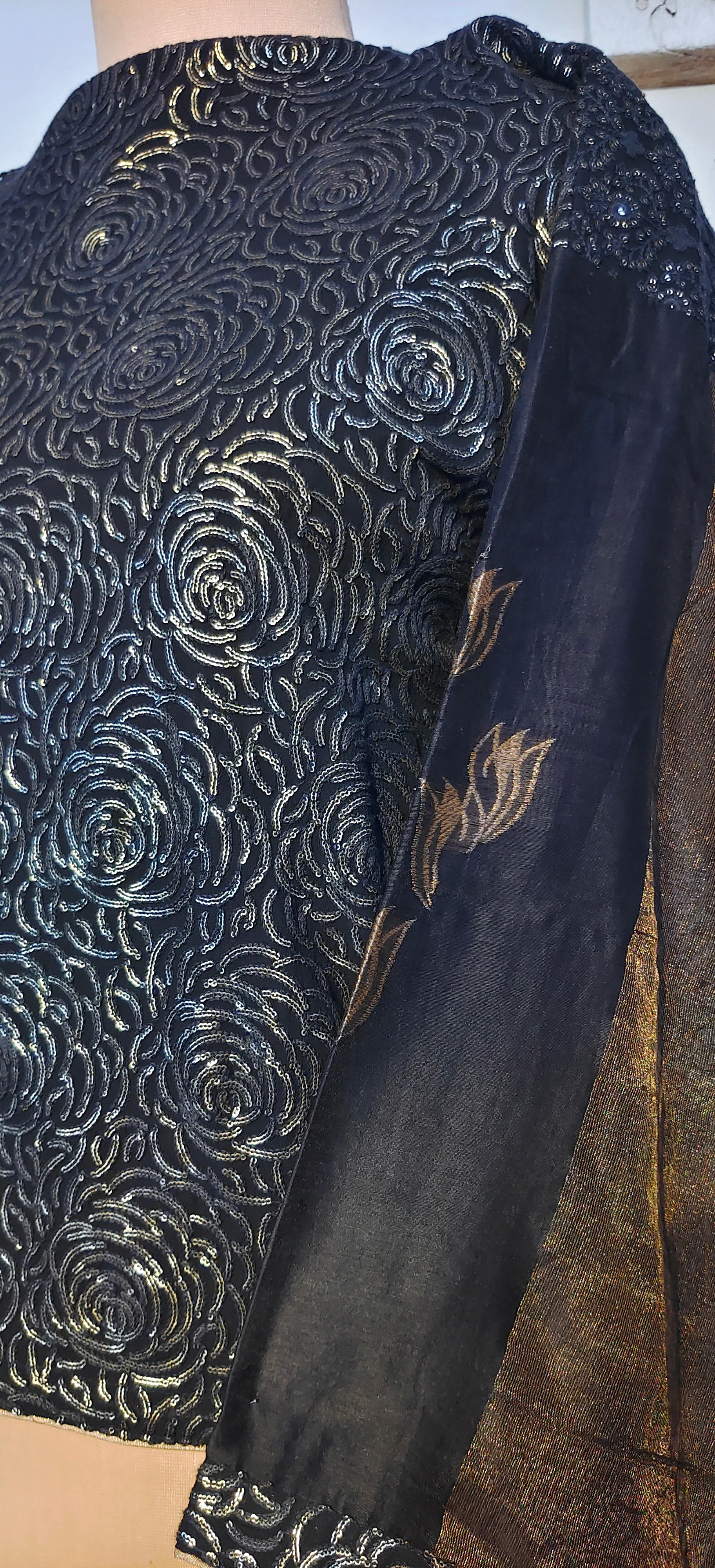 This exquisite Semistitched Kurta designed in textured stripe chanderi with gold stitch lines in the front and silk ajrakh printed panels and textured effect in the sleeves and back bottom ghera .The short tunic has a very unique formal appeal and can be coordinated with trousers for a indo western look.