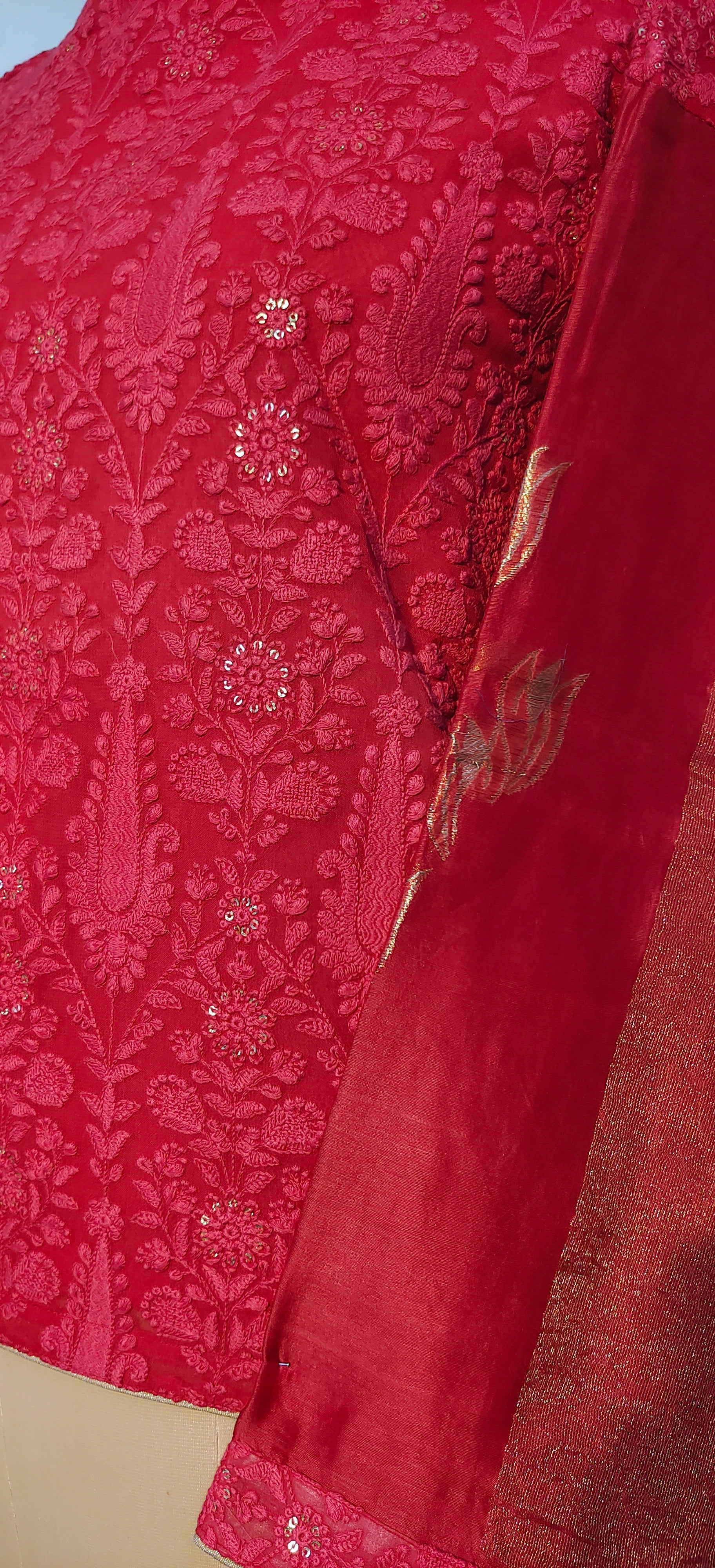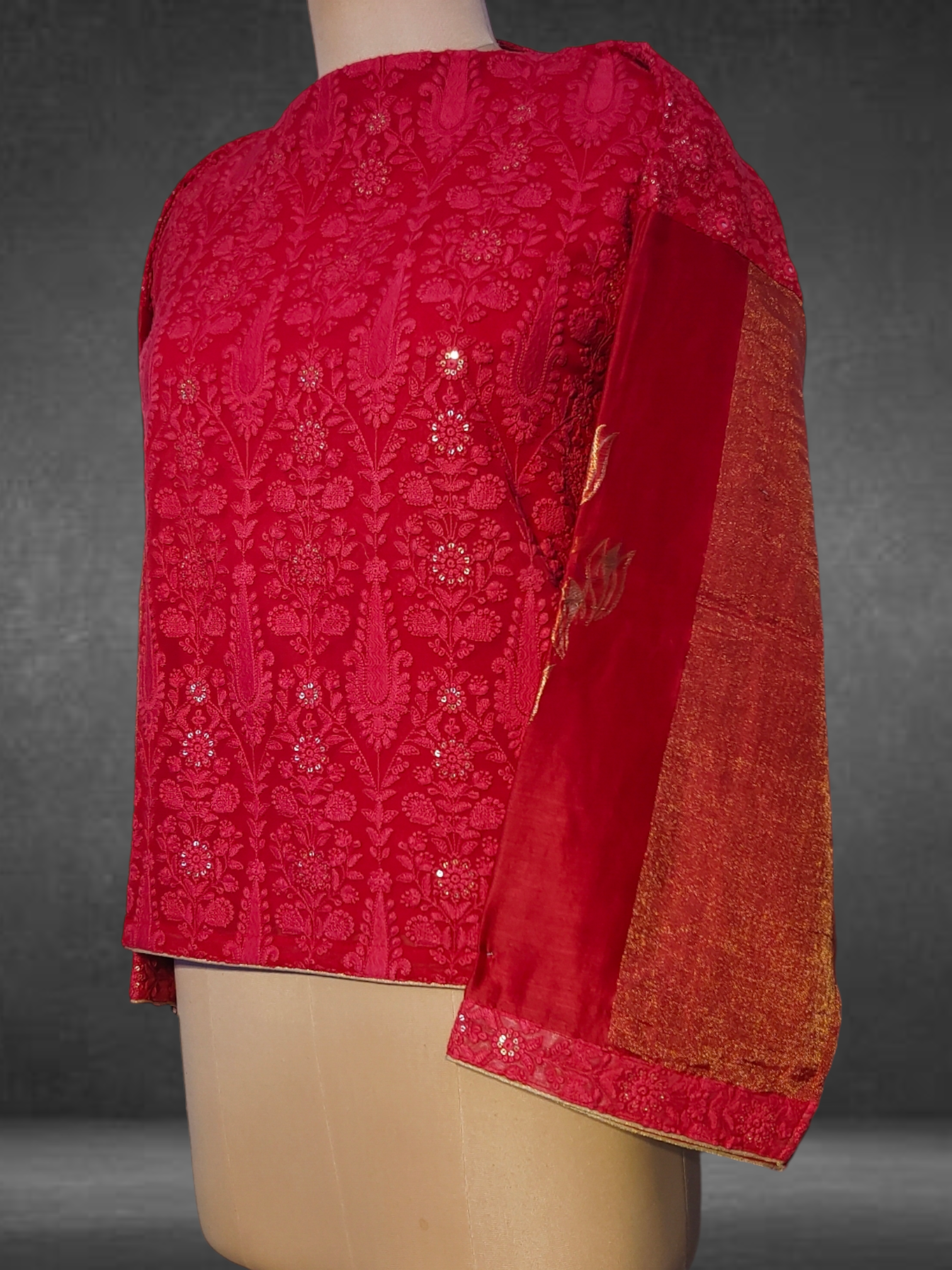 The short kurta can be styled in various ways and shortened to the desired length as there is no neckline given. The tunic length is 24", with 30" width as a one-side ghera and sleeves at 20".These measurements are very flexible and can be reduced as per the required sizeset.