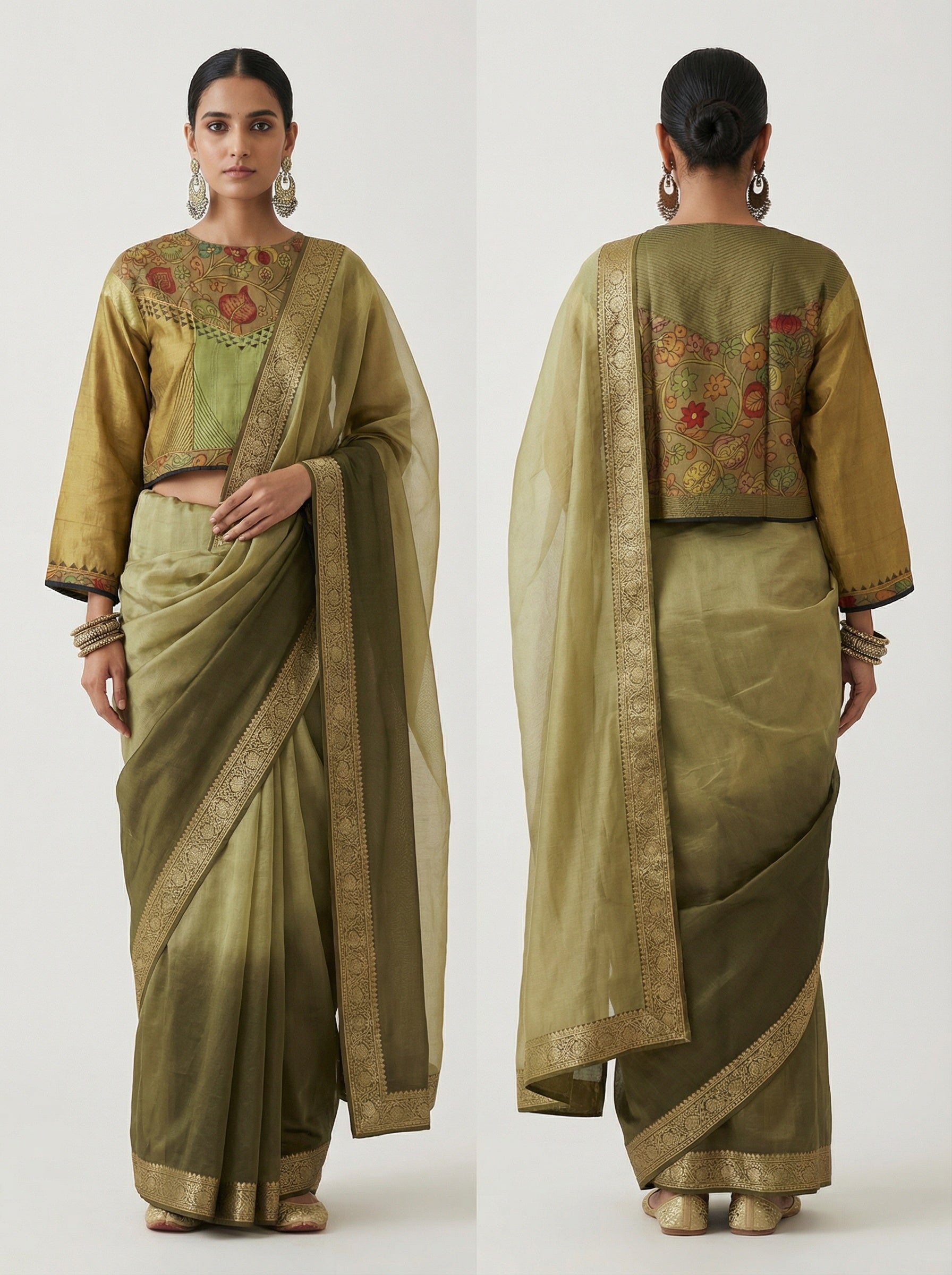Full-body, edited professional shot of a model wearing a cropped blouse in antique gold chanderi with full-length sleeves, featuring kalamkari-inspired floral artwork across the chest and back yoke, accented with fine linear embroidery on the front panel and a black-trimmed hem with botanical motifs, finished with embroidered geometric cuffs, clean minimal fashion product photo, poised classic stance in the style of Raw Mango fashion editorial