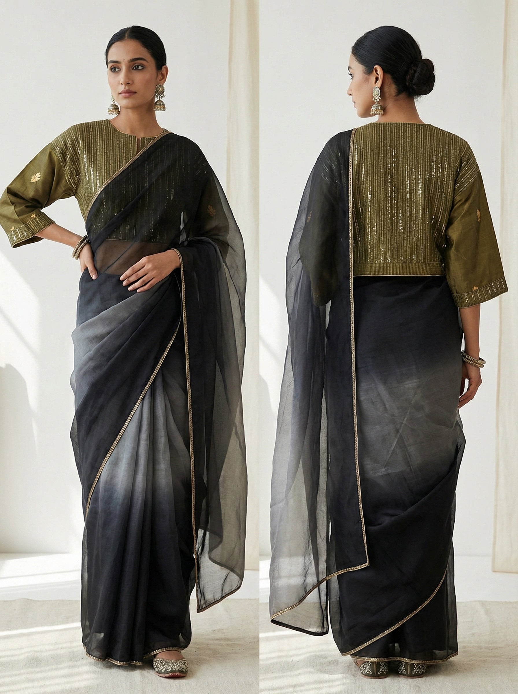 Full-body, edited professional shot of a model wearing a cropped blouse in vibrant crimson red silk with long wide sleeves, featuring dense vertical sequin and thread embroidery on the back and yoke, golden leaf motif embroidery scattered across the sleeves, and sequin-embellished sleeve cuffs