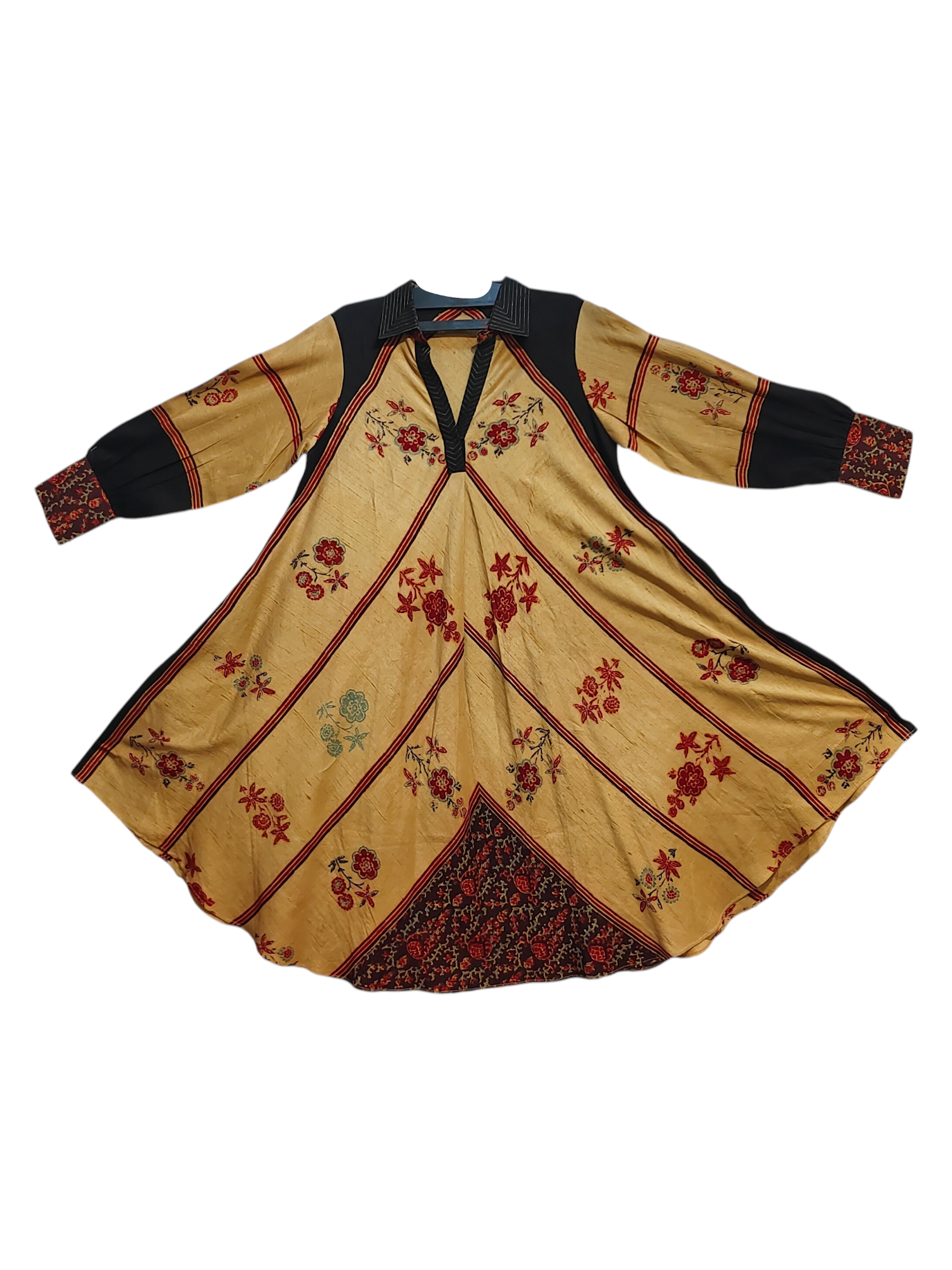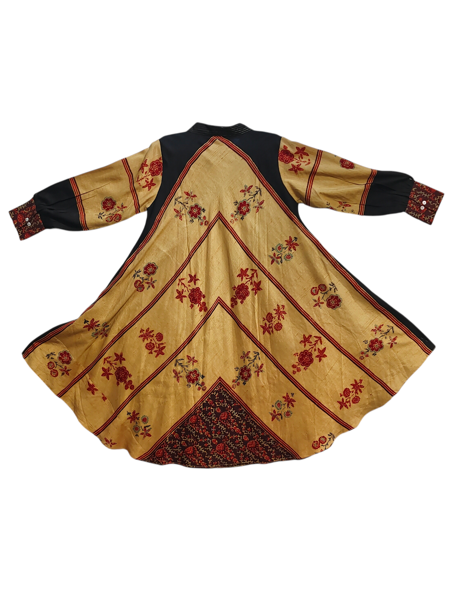 A flared ankle-length A-line dress in rich mustard yellow pure dupion ajrakh printed silk with black shoulder panels and cuffs, featuring intricate floral embroidery in deep red and green across the body and sleeves, highlighted by chevron panel construction and a black embroidered triangular hem insert
