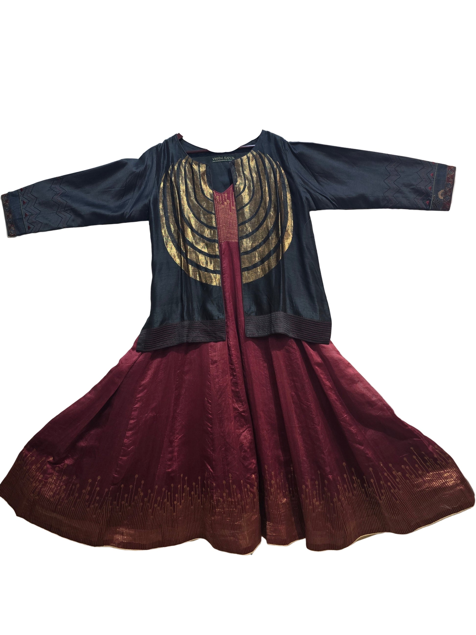 A rich maroon sleeveless flared full-length anarkali dress with gold woven digital-style detailing along the hem and bodice, layered under a black open-front jacket with full sleeves, featuring bold circular gold woven pattern on the front and delicate embroidery on the cuffs and back