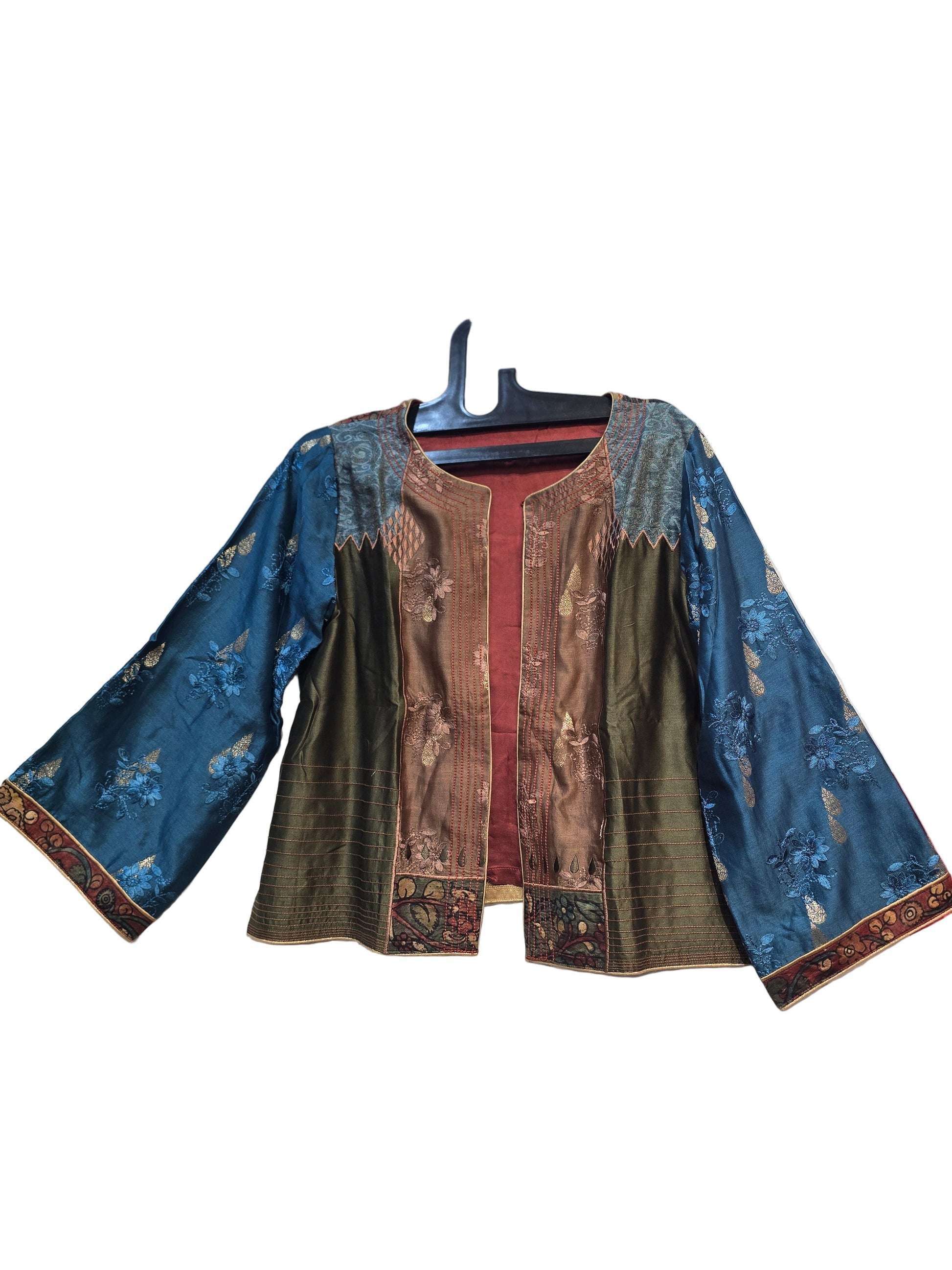 This exquisite kalamkari inspired jacket is a mesmerising piece as a layered garment that can transform any ordinary dress into an extraordinary look.It has two side slits edged with tissue for a graceful movement appeal.A cropped mixed-fabric jacket with teal floral brocade sleeves, a panelled olive and bronze silk bodice, and a back adorned in bold multicolor vertical floral authentic hand kalamkari with zigzag hem detailing, finished with embroidered cuffs and front placket, artisanal and maximalist fusion style.